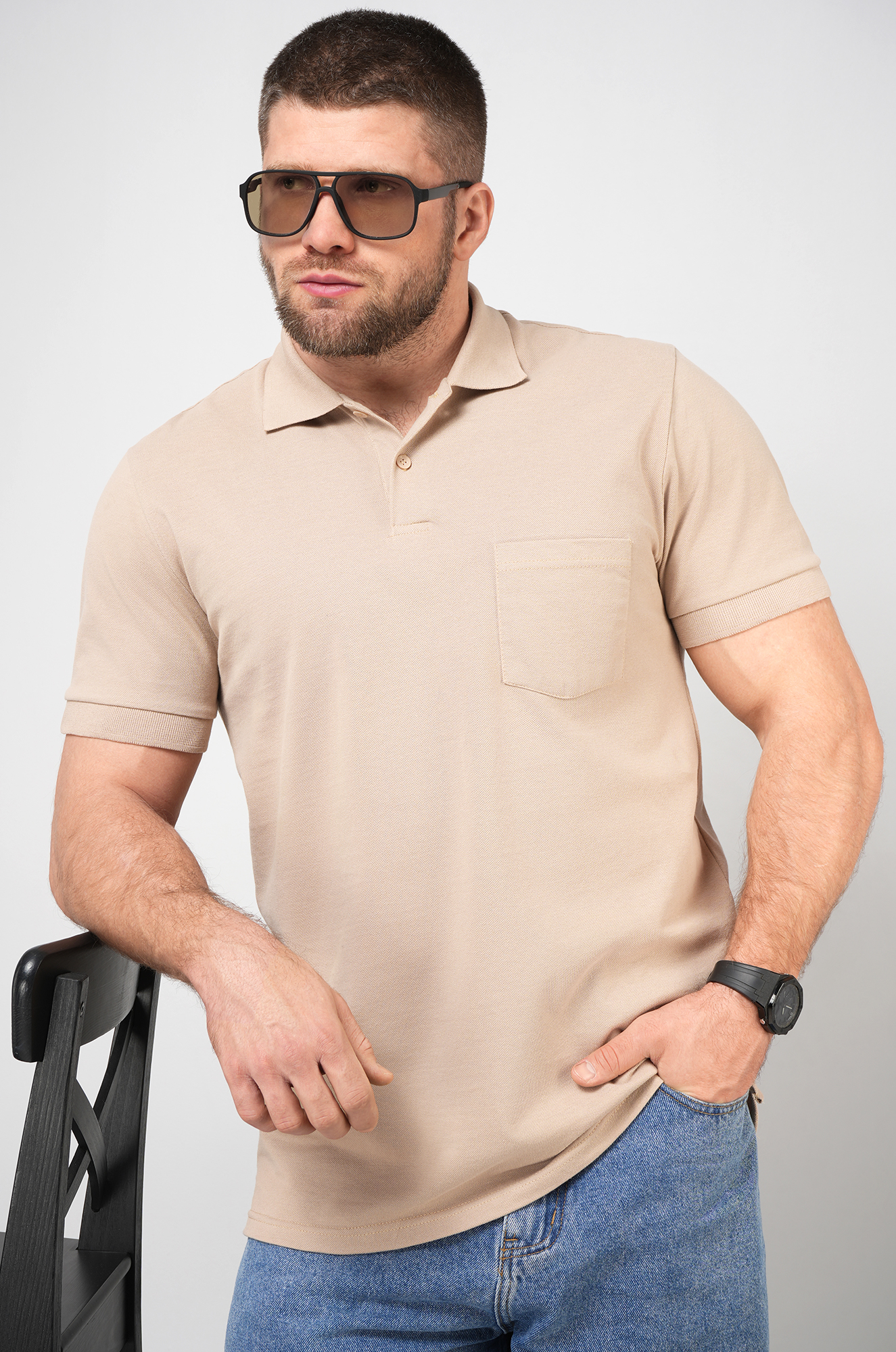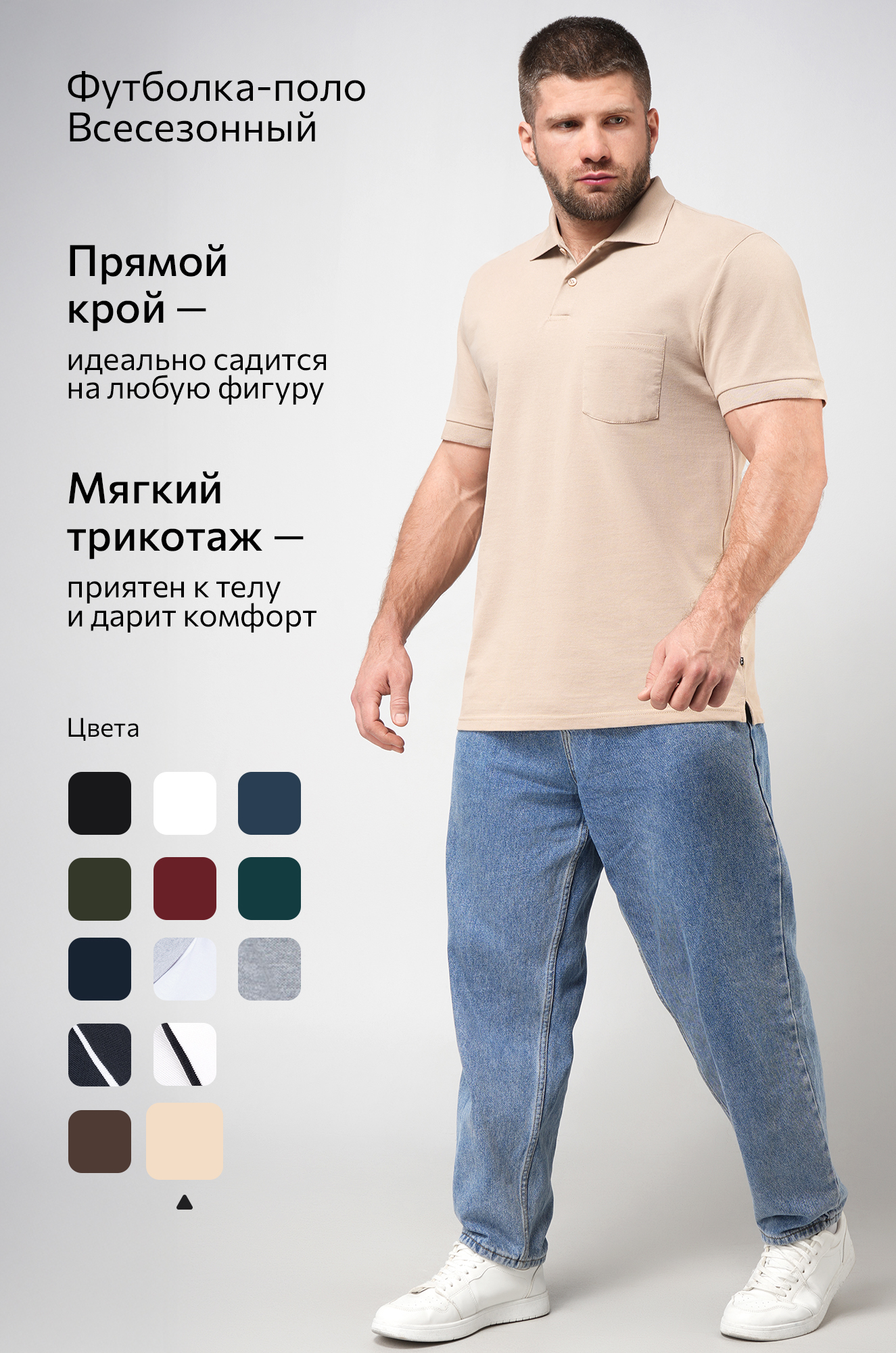 Бежевая футболка поло — идеальный баланс между комфортом и стильным минимализмом для повседневных образов. Мужская футболка прямого кроя с отложным воротником и нагрудным карманом создаёт аккуратный и уверенный силуэт.