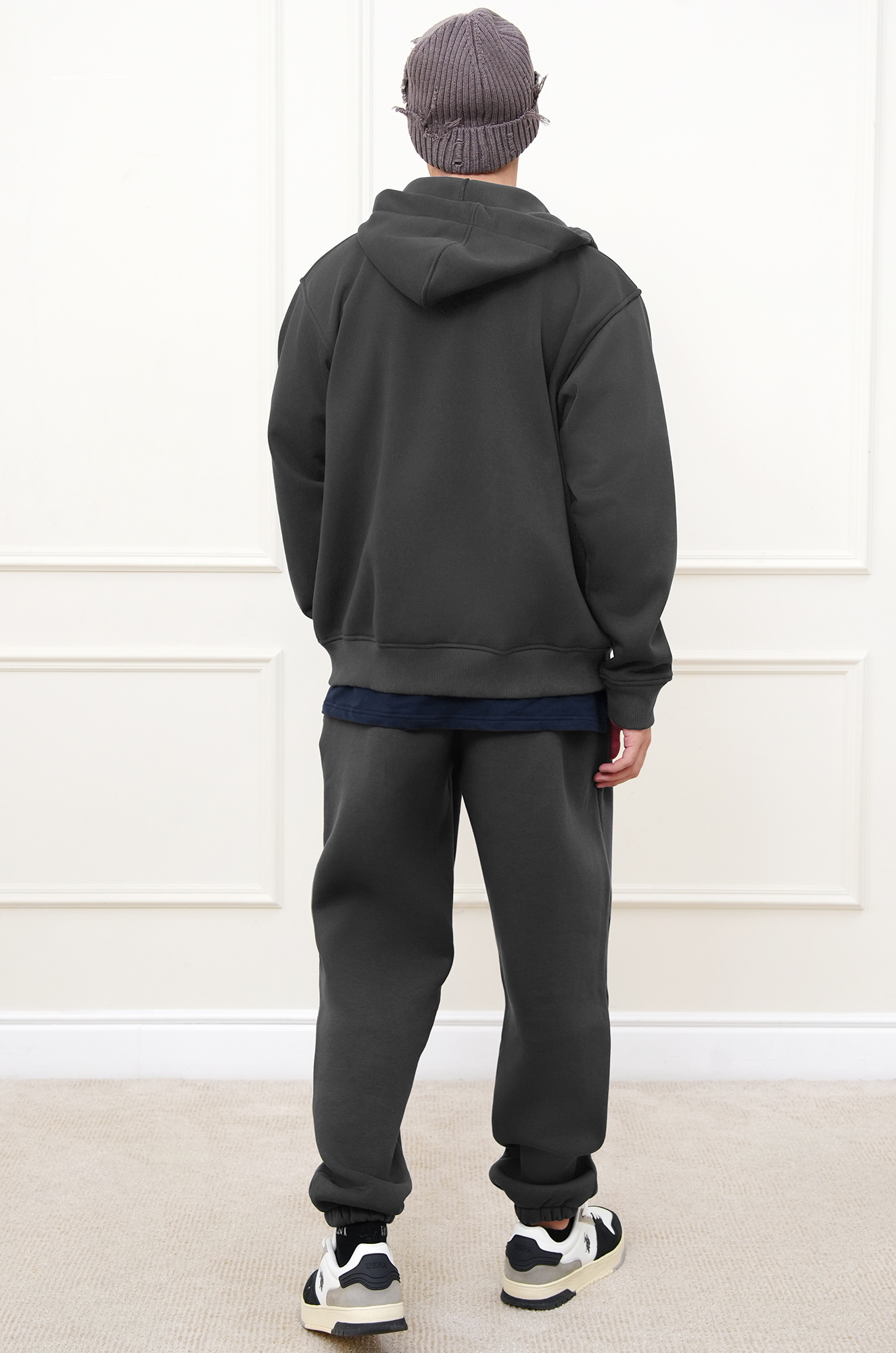 — серая толстовка выполнена из футера на флисе, мягкая снаружи и теплая внутри;