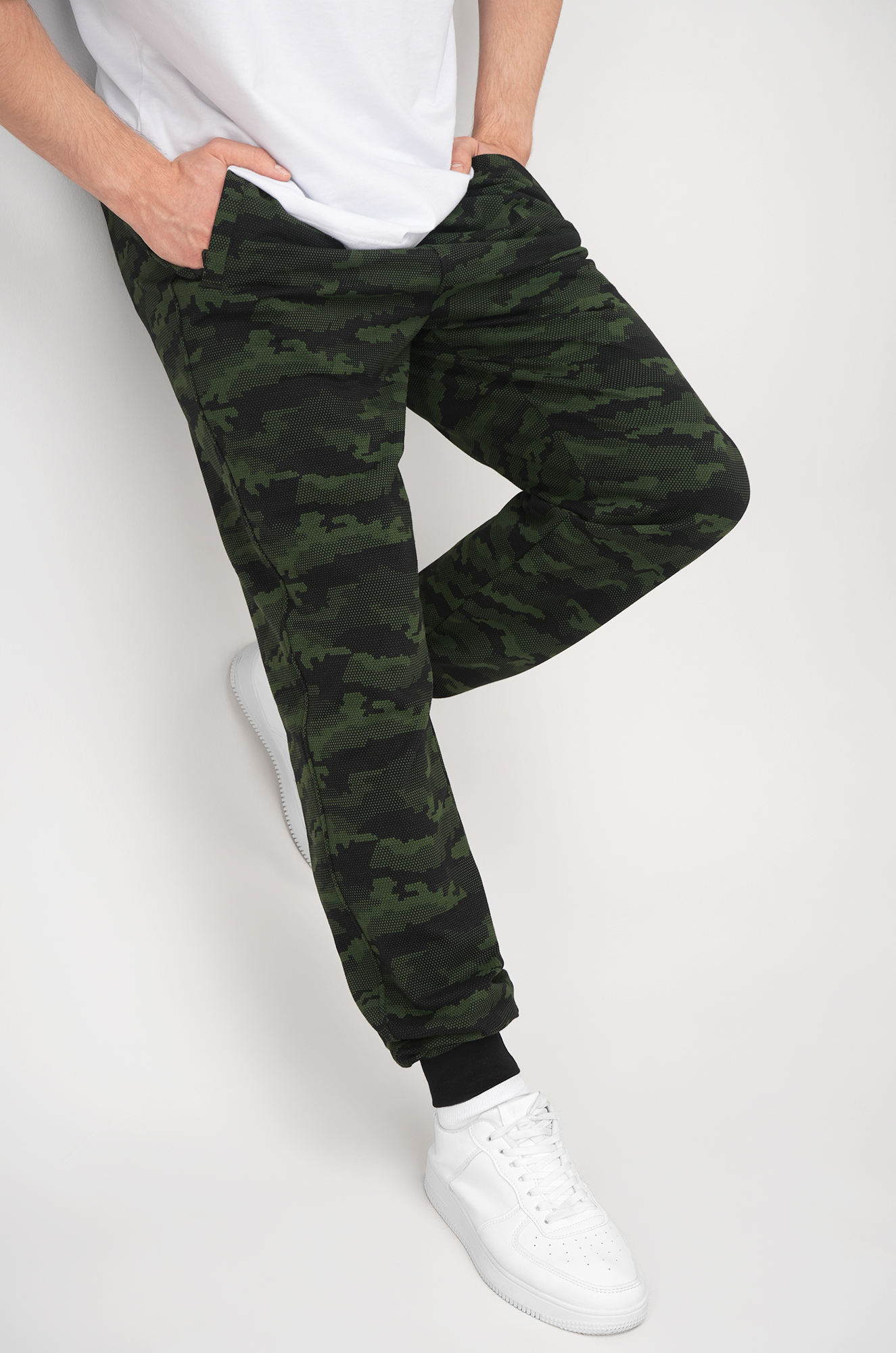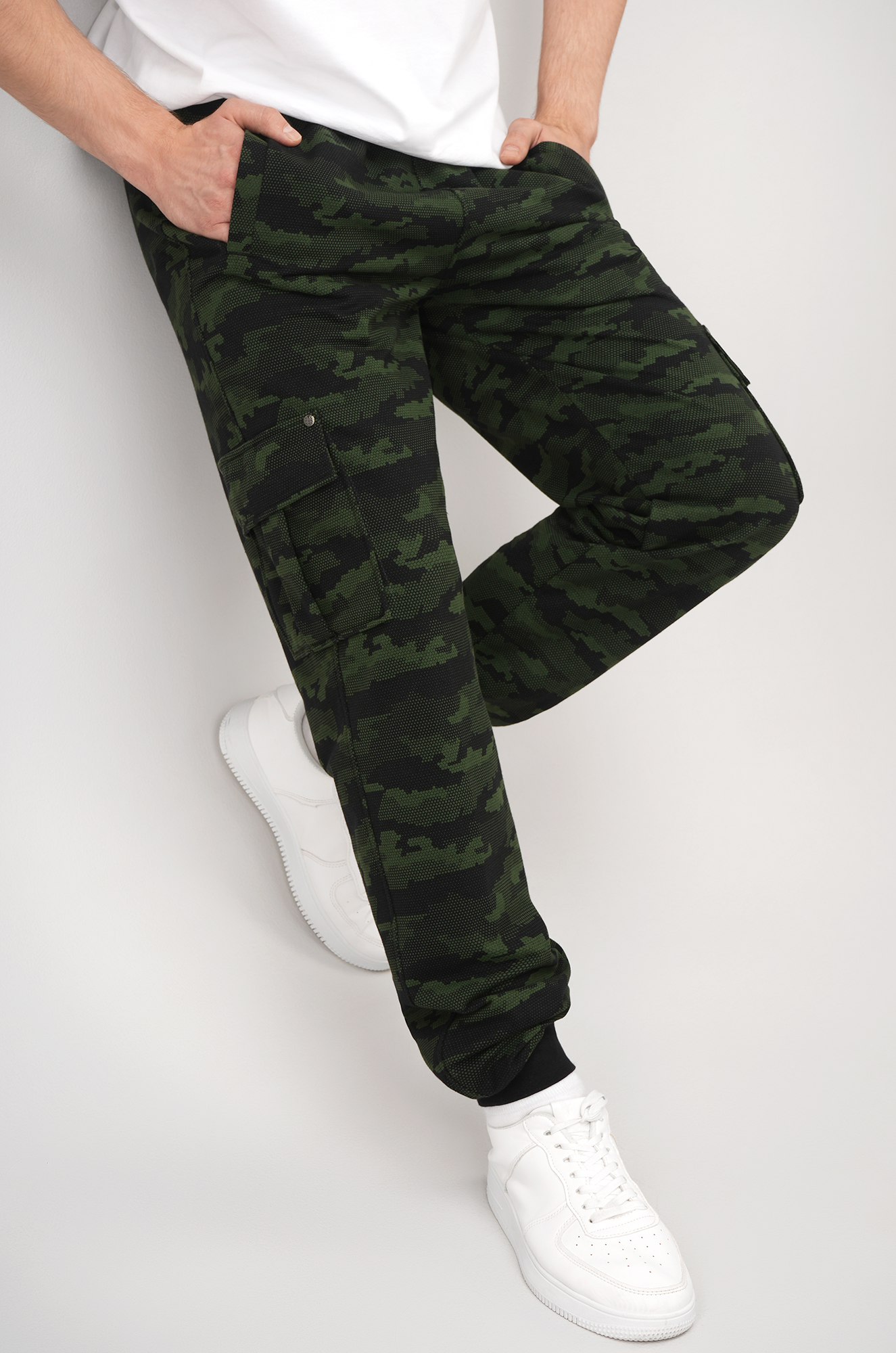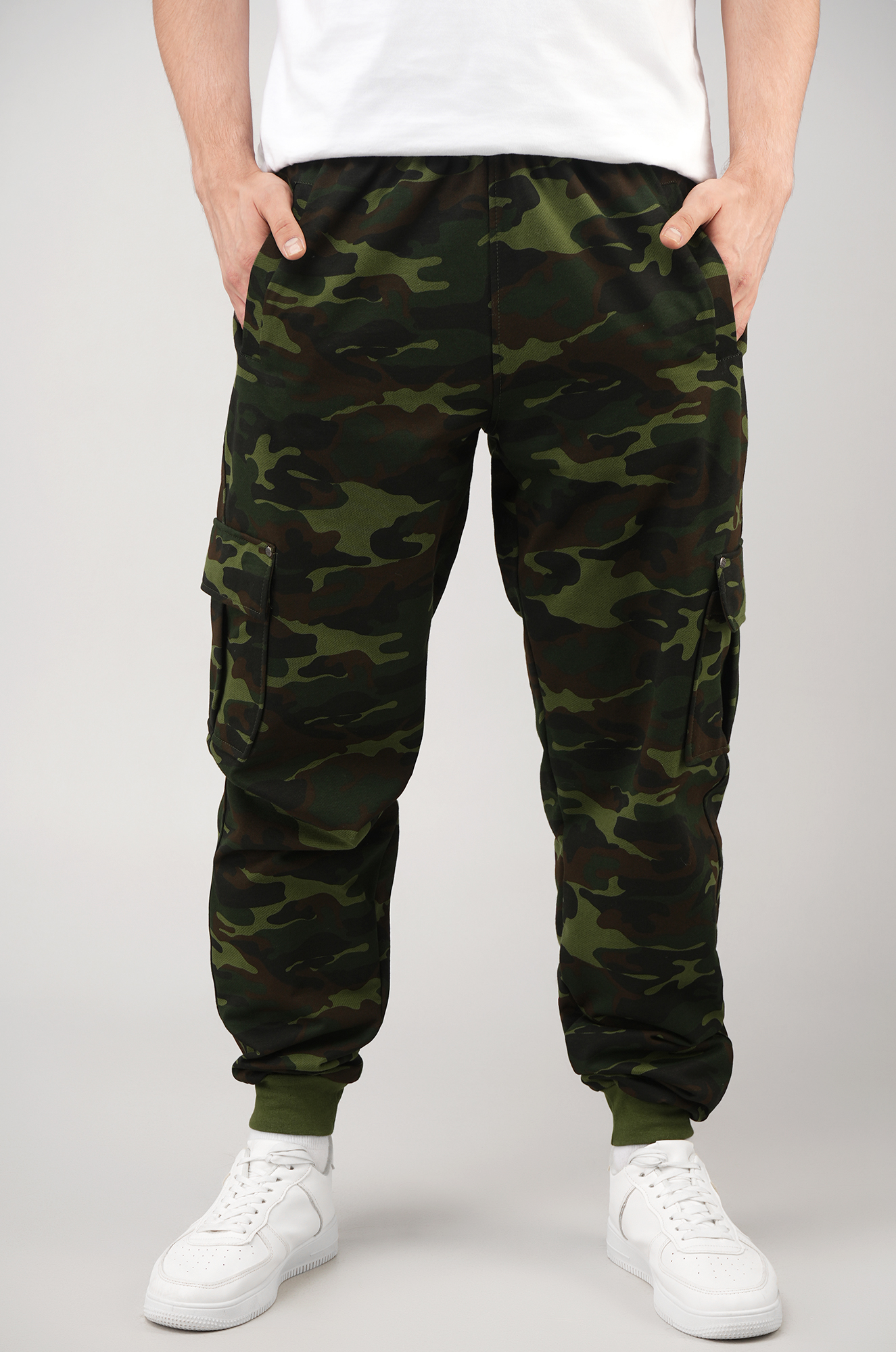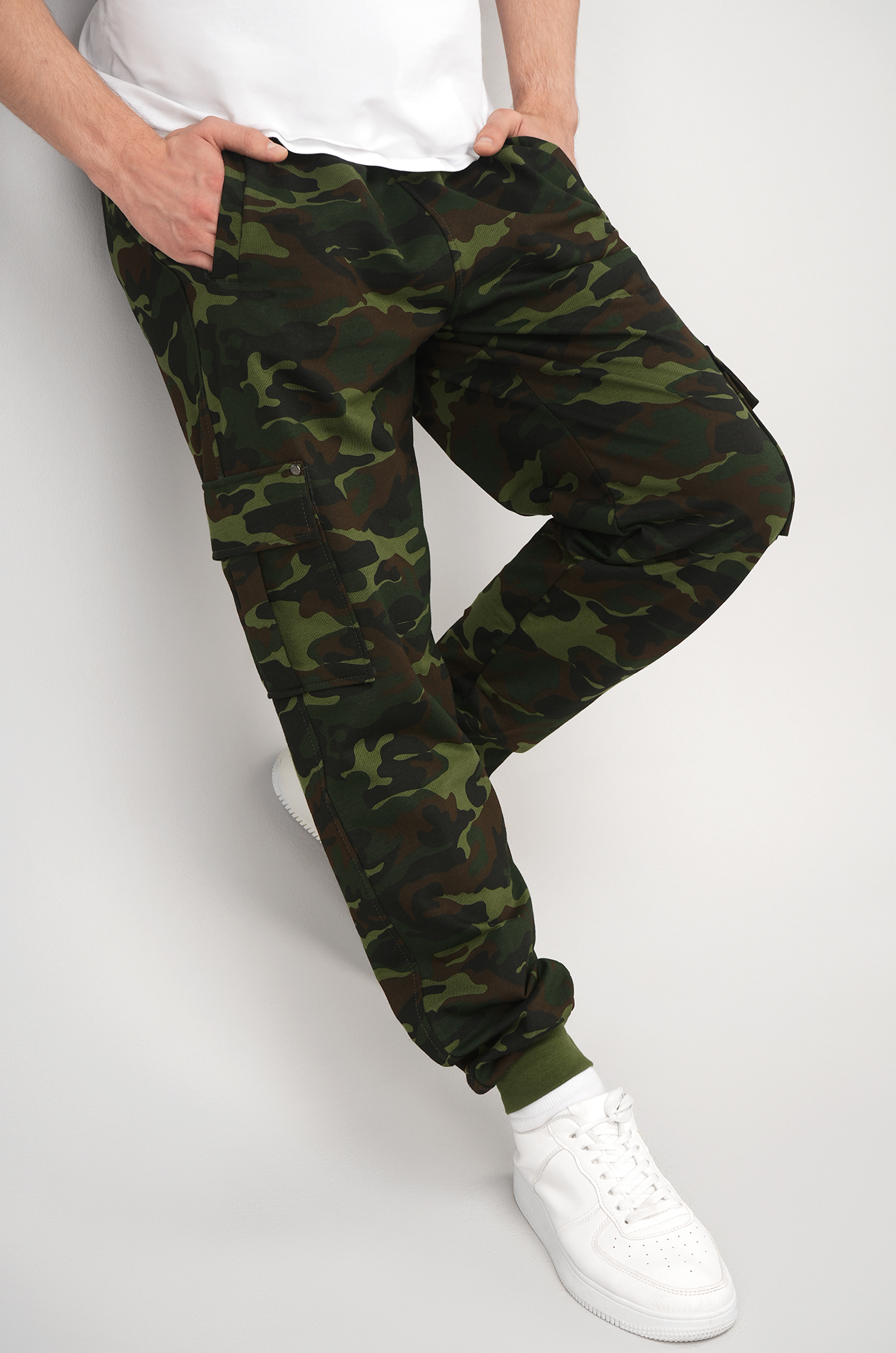 Камуфляжные брюки джоггеры — отличное решение для любителей охоты, рыбалки и туризма. Благодаря добавлению полиэстера мужские брюки из футера двухнитки мягкие и прочные, что делает их идеальным выбором для дачи и активного отдыха на природе. Трикотажные спортивные штаны выполнены в защитном цвете хаки с рисунком в стиле милитари.