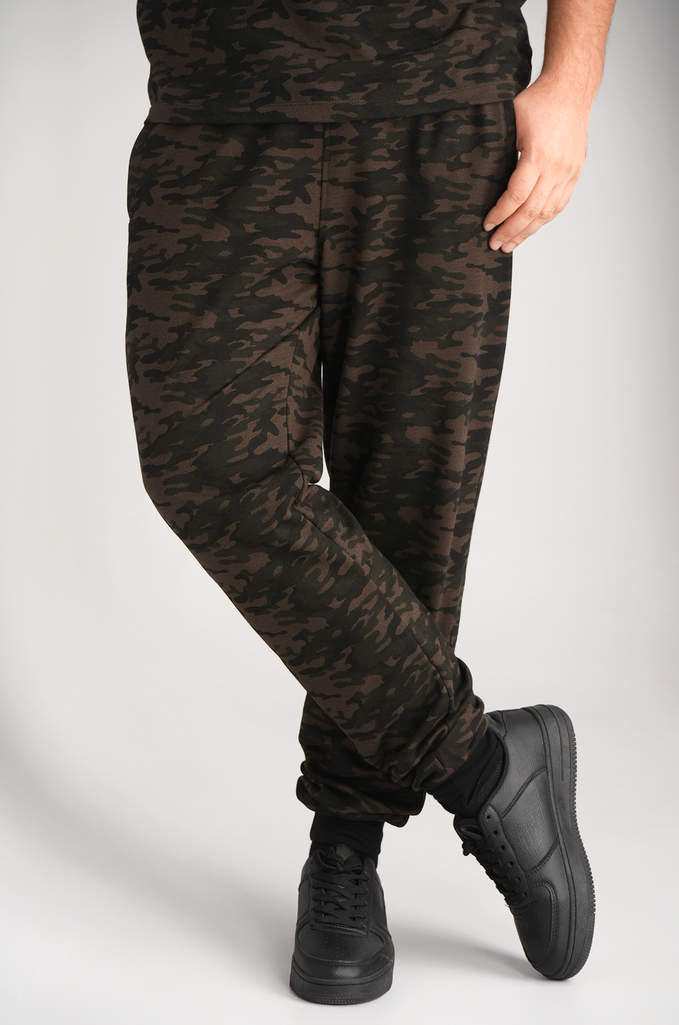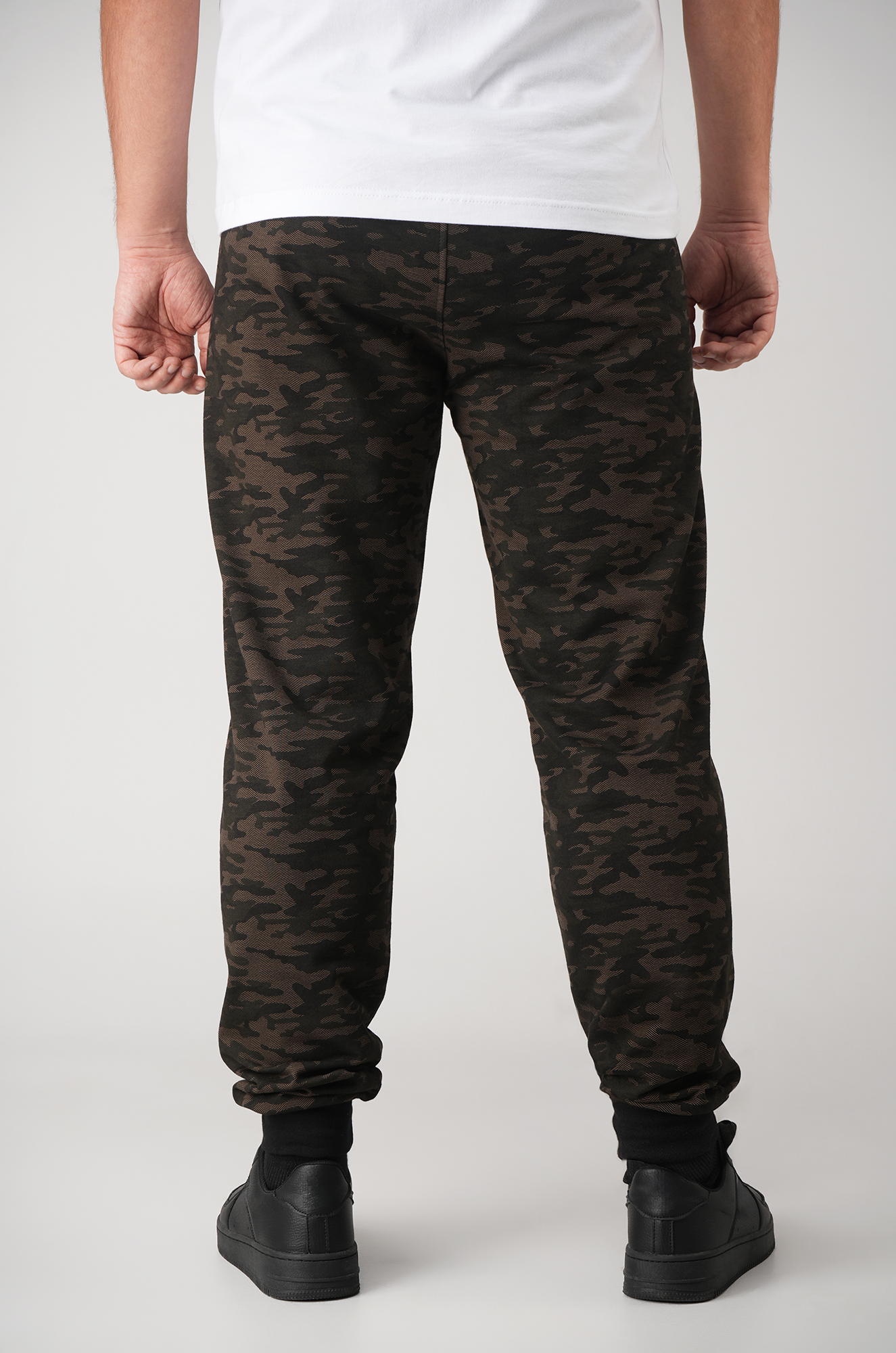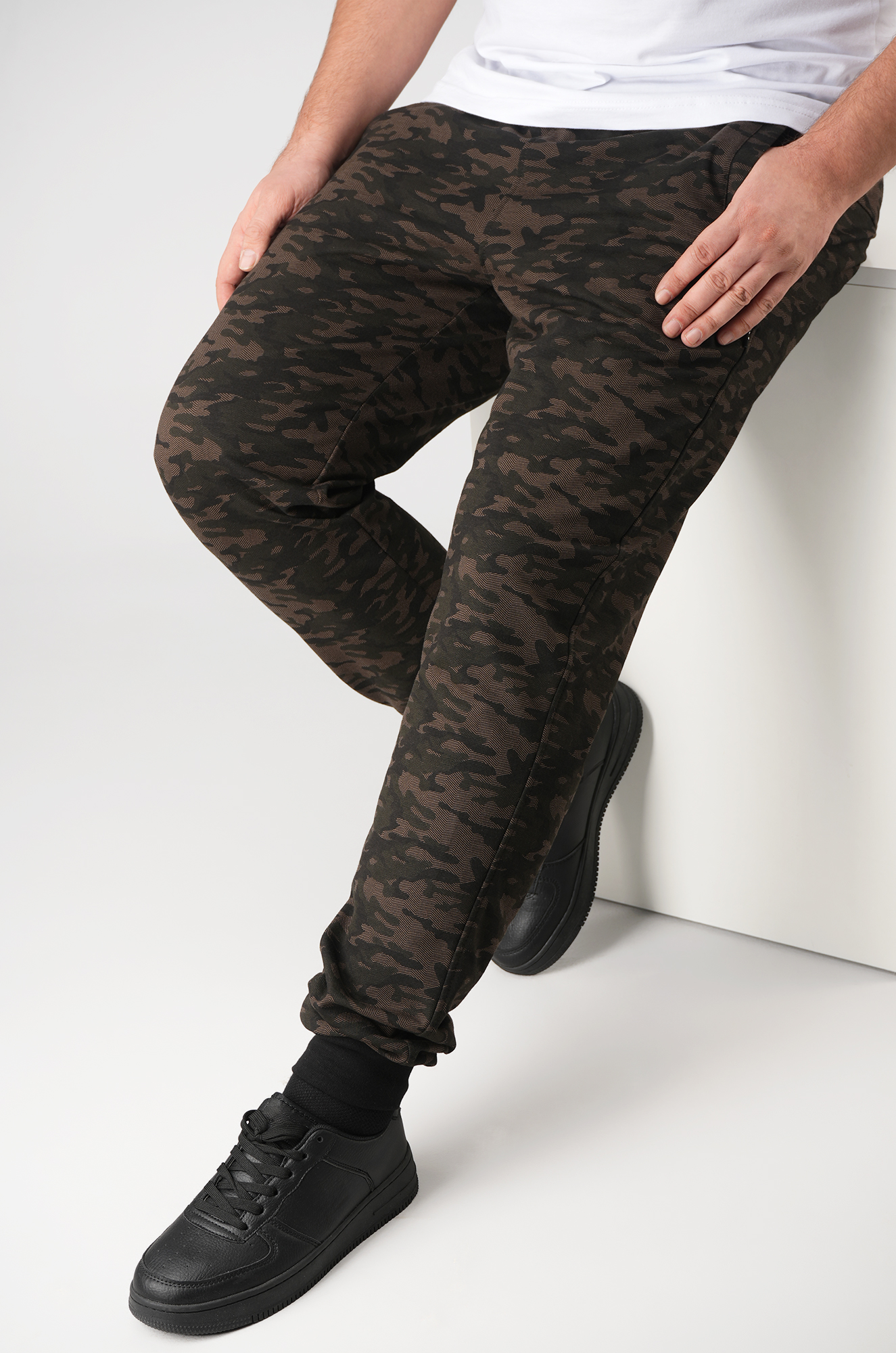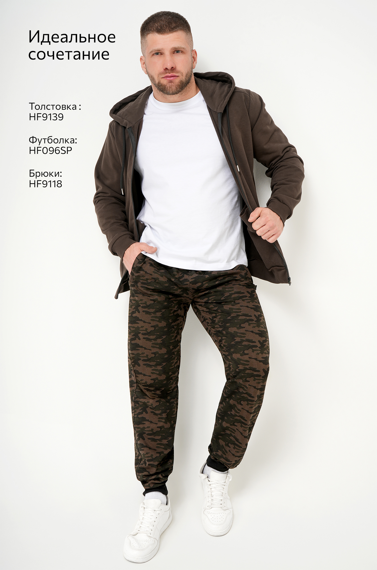 Камуфляжные брюки джоггеры — отличное решение для любителей охоты, рыбалки и туризма. Благодаря добавлению полиэстера мужские брюки из футера двухнитки мягкие и прочные, что делает их идеальным выбором для дачи и активного отдыха на природе. Трикотажные спортивные штаны выполнены в защитном цвете хаки с рисунком в стиле милитари.
