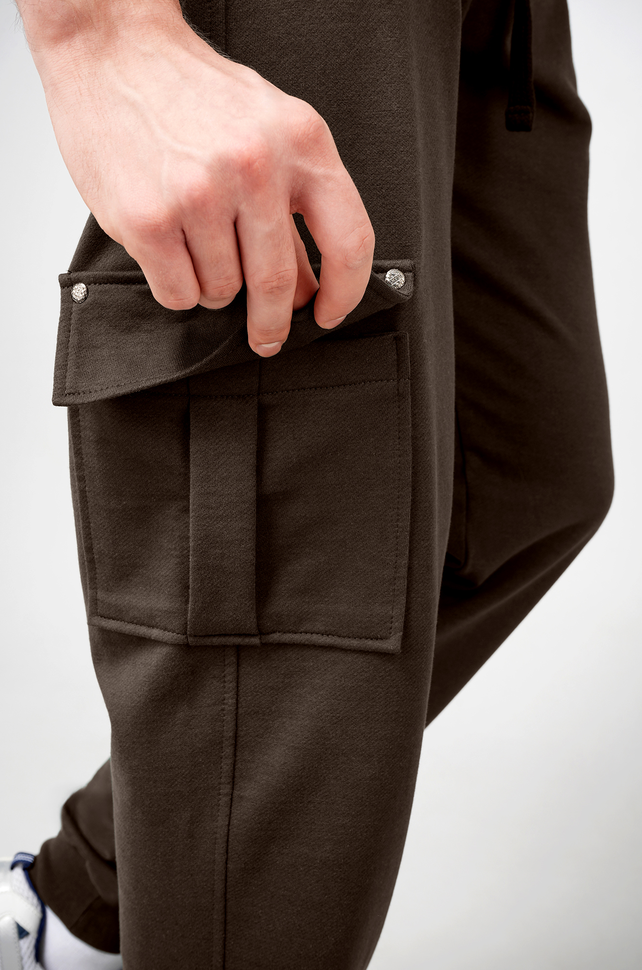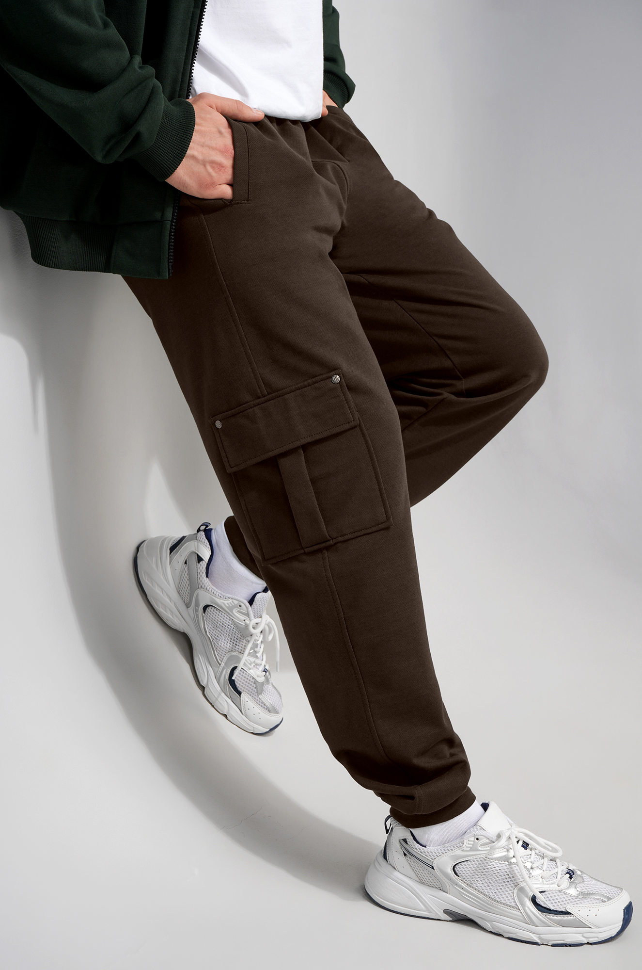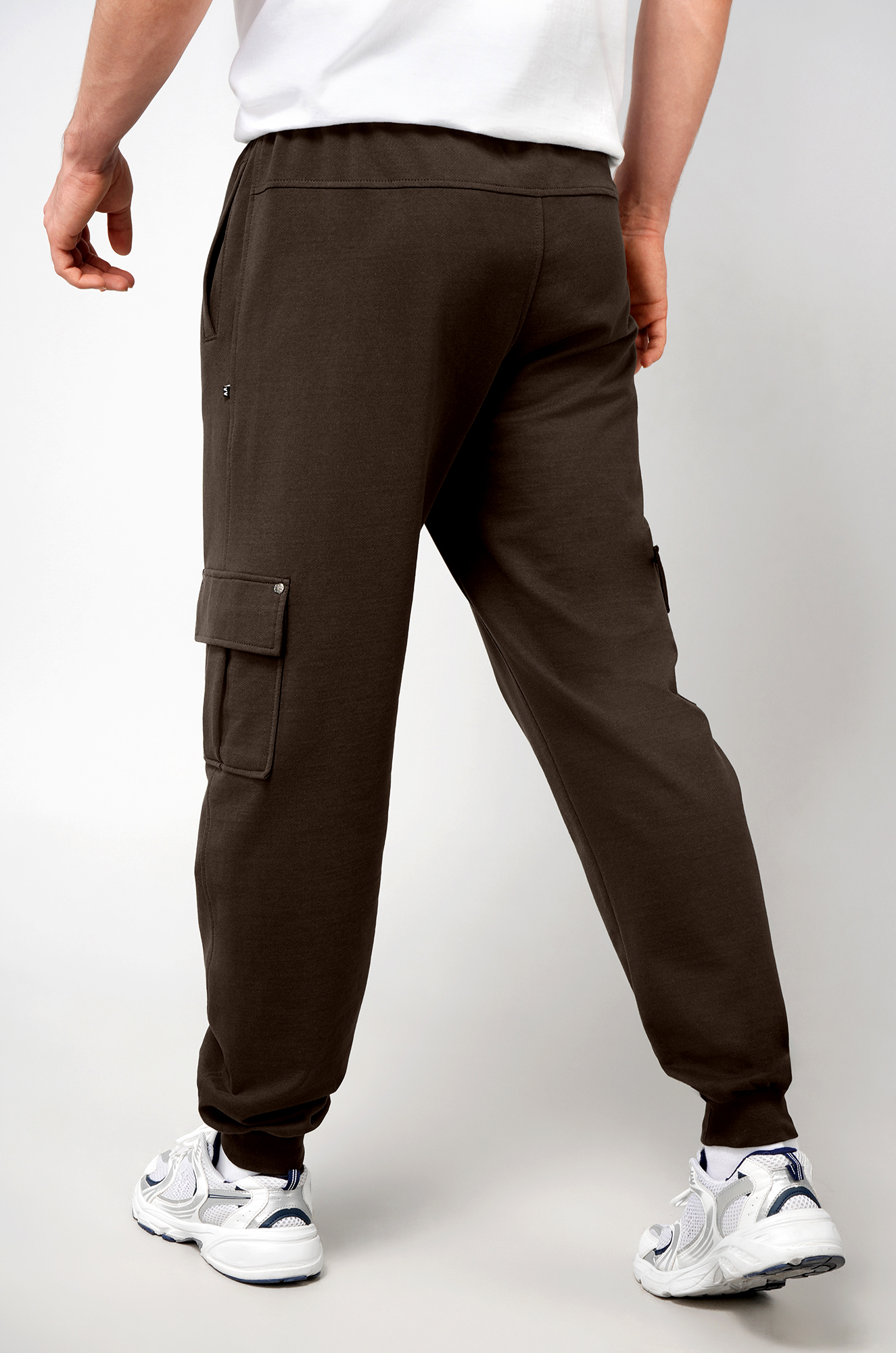 Мужские брюки джоггеры — прекрасное решение для расслабленного образа в уличном стиле. Спортивные штаны выполнены из трикотажной ткани футер двухнитка. Зауженный к низу крой с манжетами и пояс на резинке обеспечивают идеальную посадку, а карманы карго добавляют им практичности.