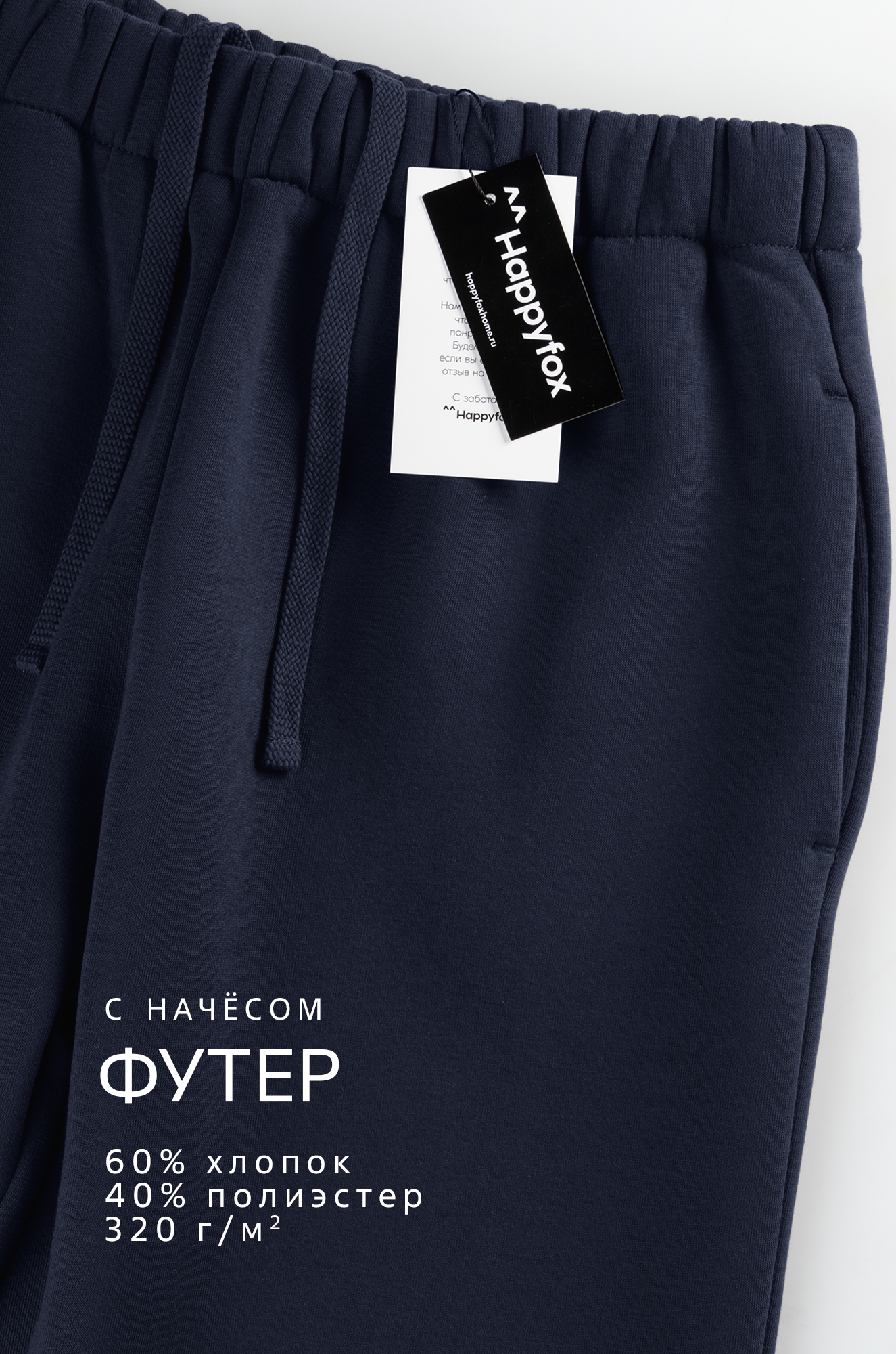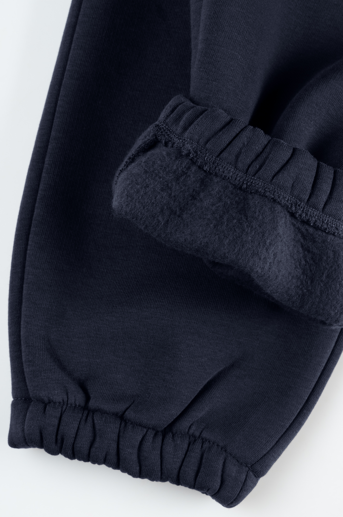 Теплые мужские брюки джоггеры выполнены из трикотажа футер с начёсом. Однотонные штаны в темно-синем цвете подойдут для спорта на улице, активного отдыха и повседневных прогулок.