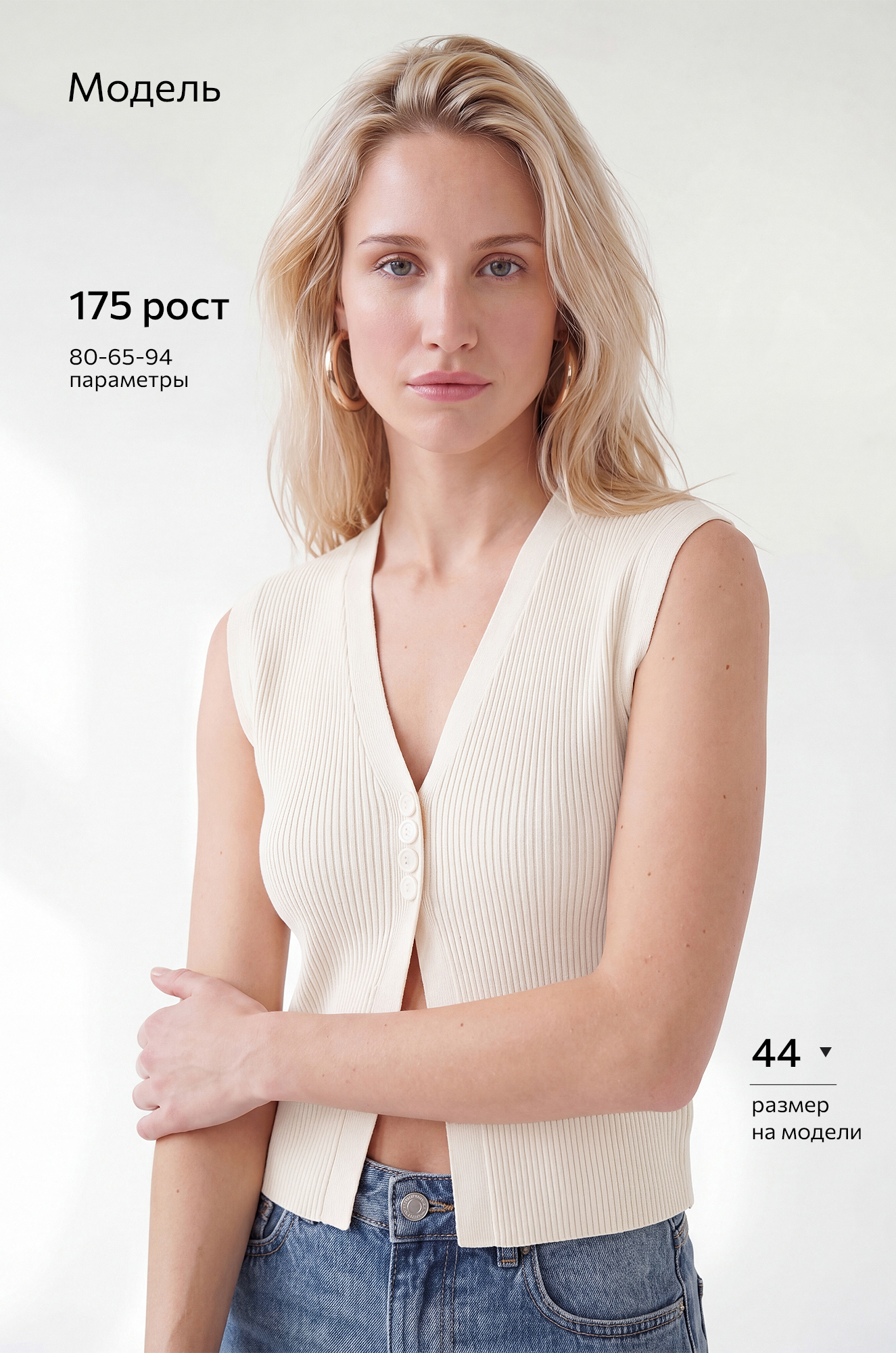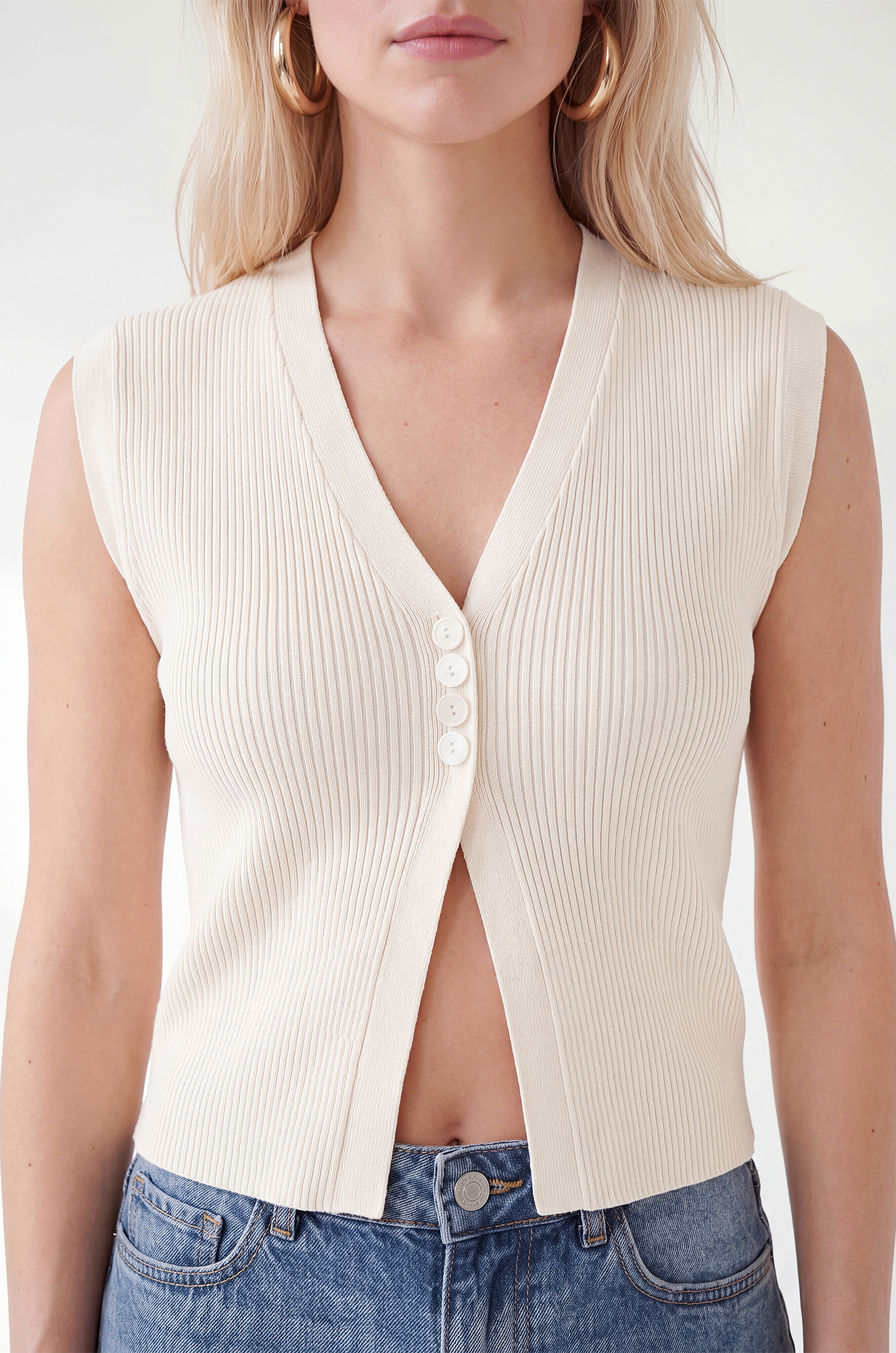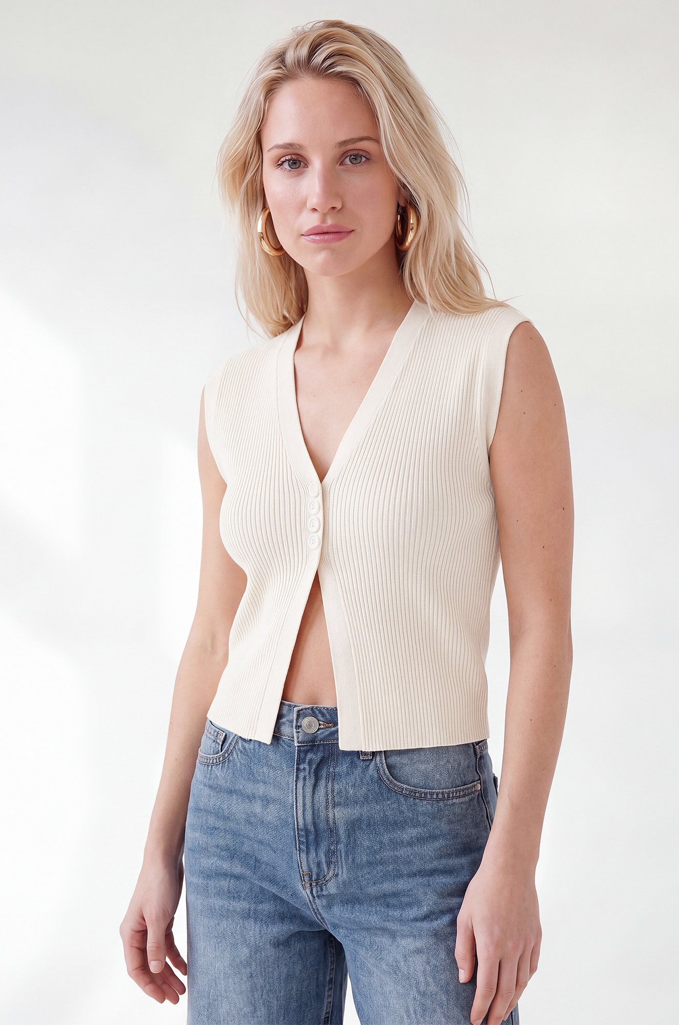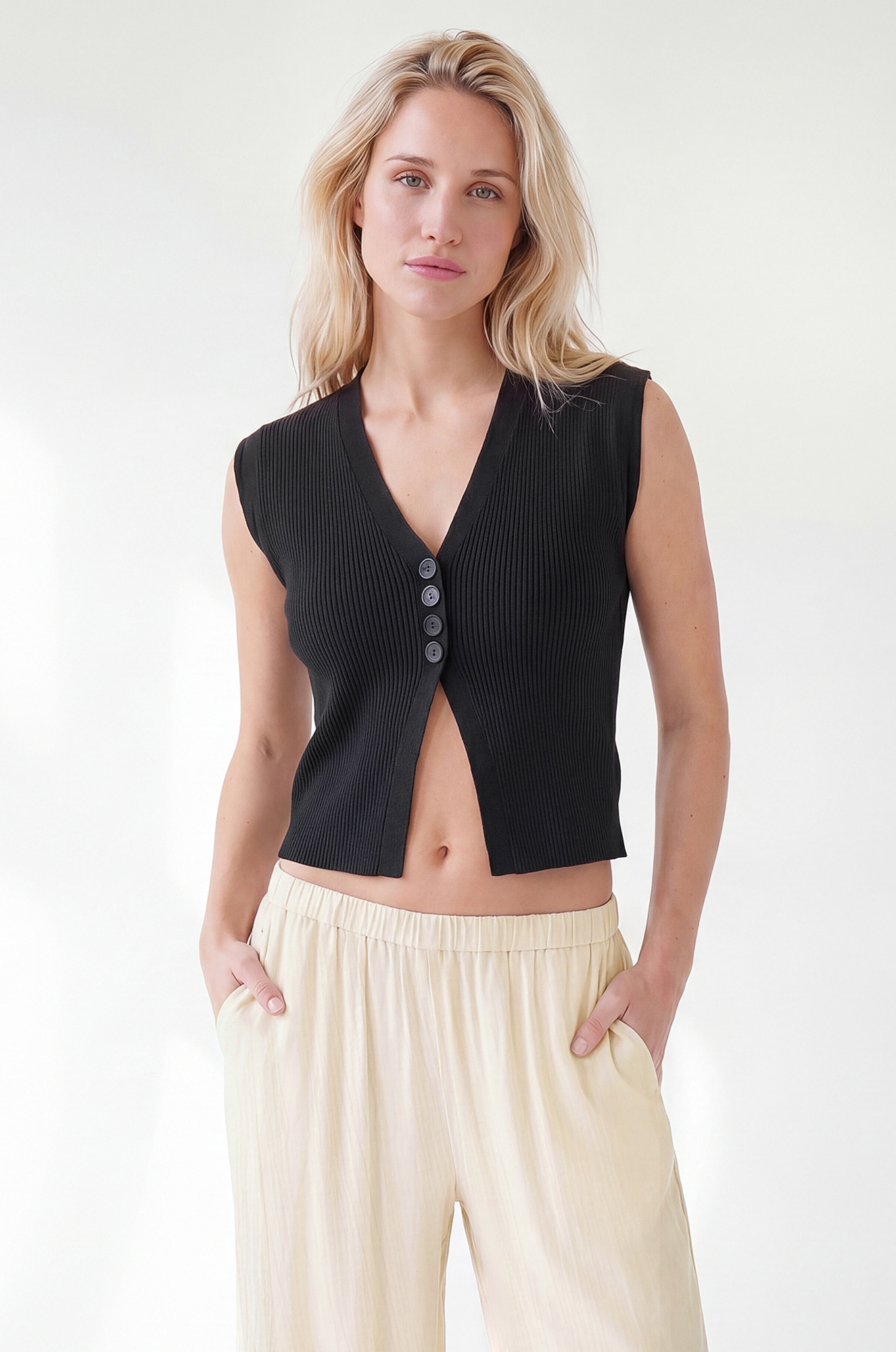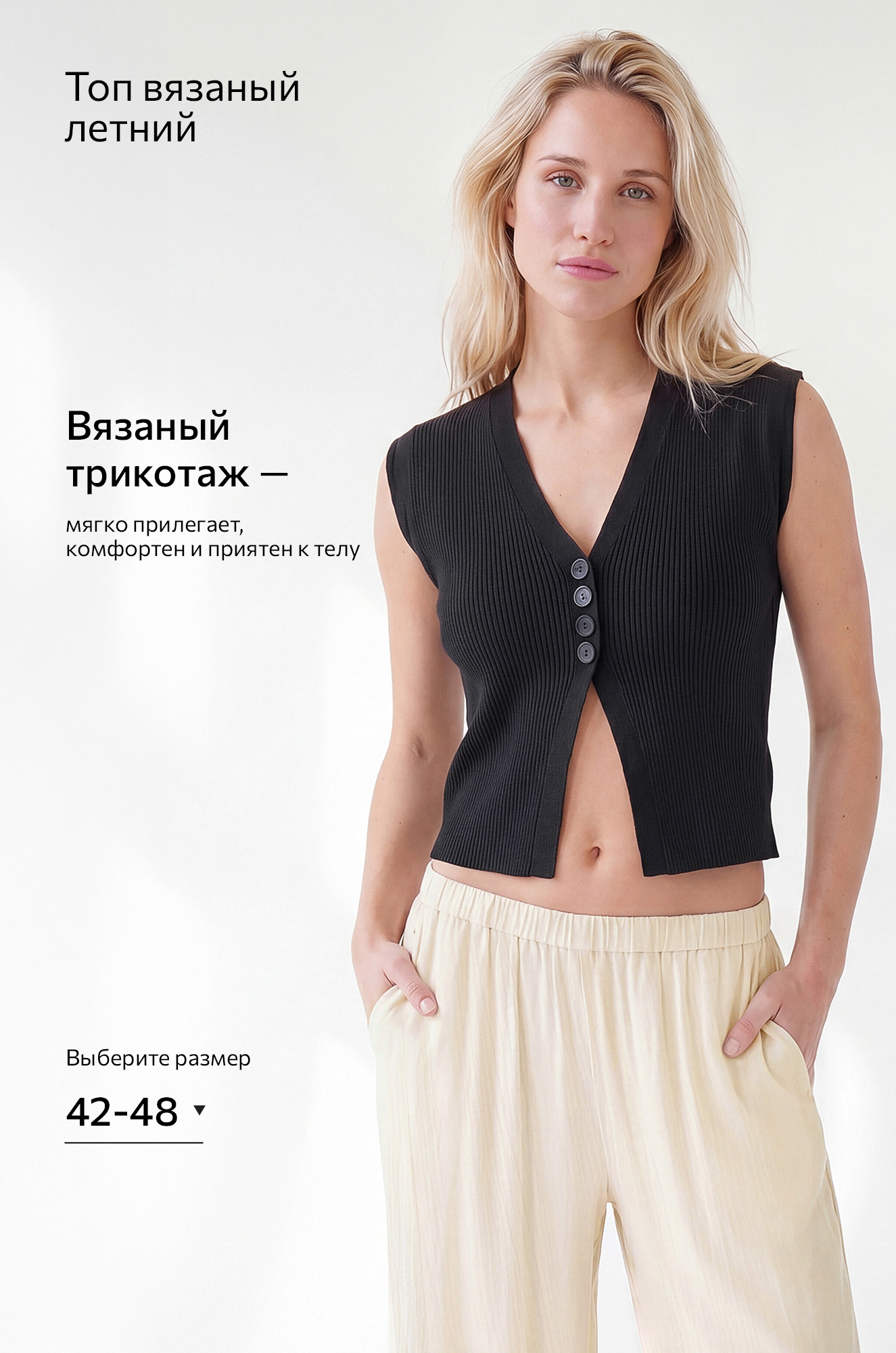 Легкий женский топ создан для жаркого лета. Облегающий крой без рукава, смелый V-вырез и пуговицы на груди подчёркивают силуэт, а укороченная длина и оригинальный фасон деликатно приоткрывают область живота. Топик из вязаного трикотажа в рубчик мягко облегает фигуру.