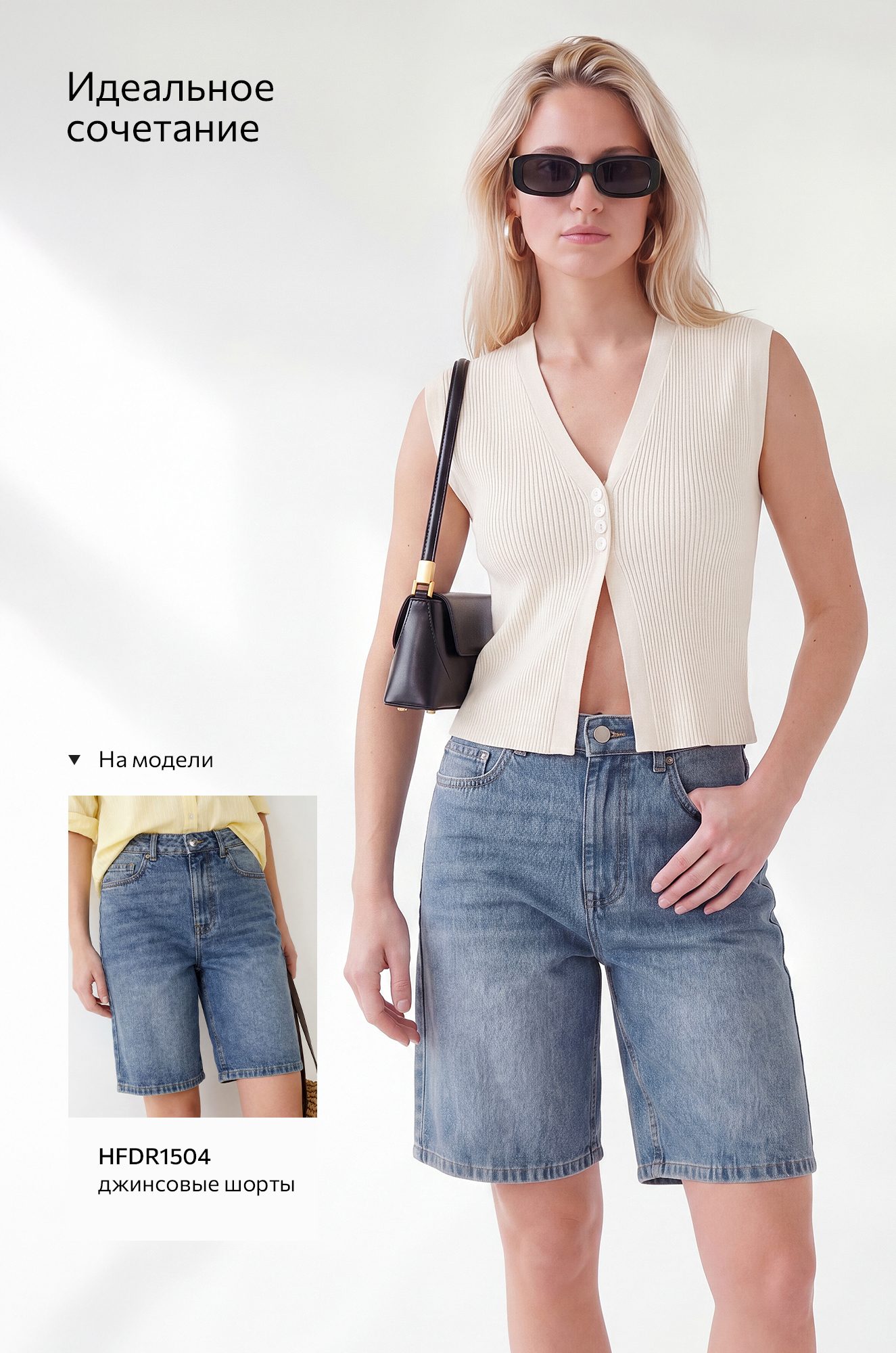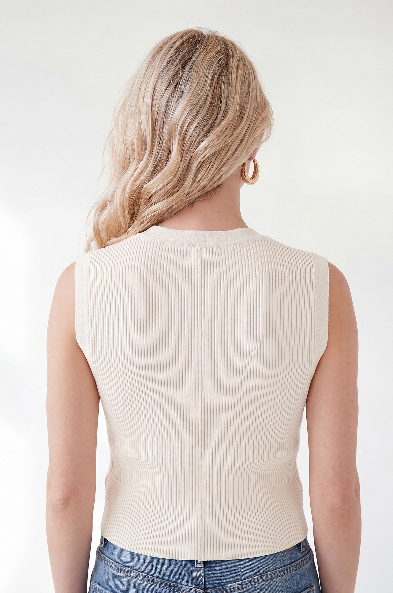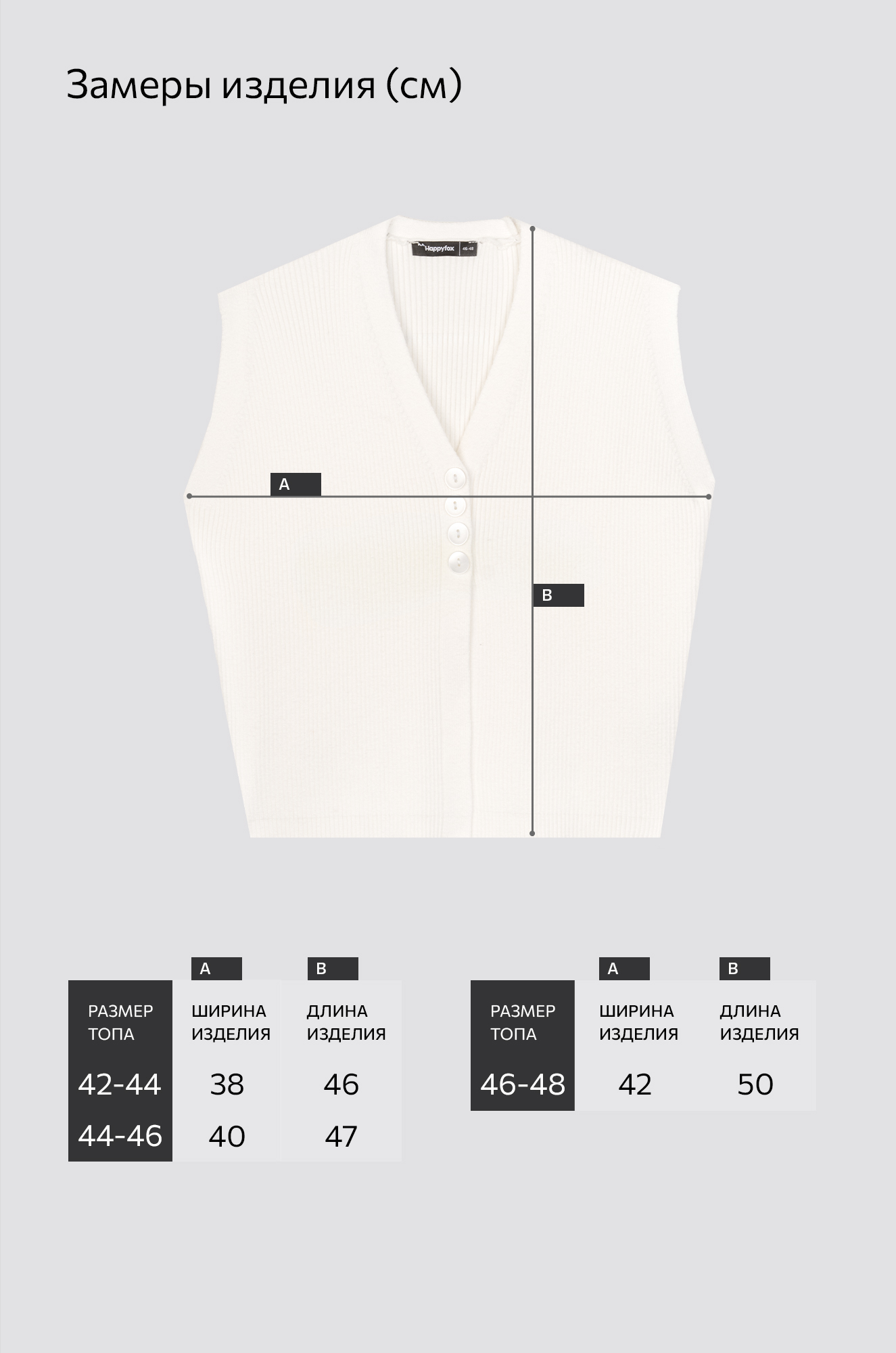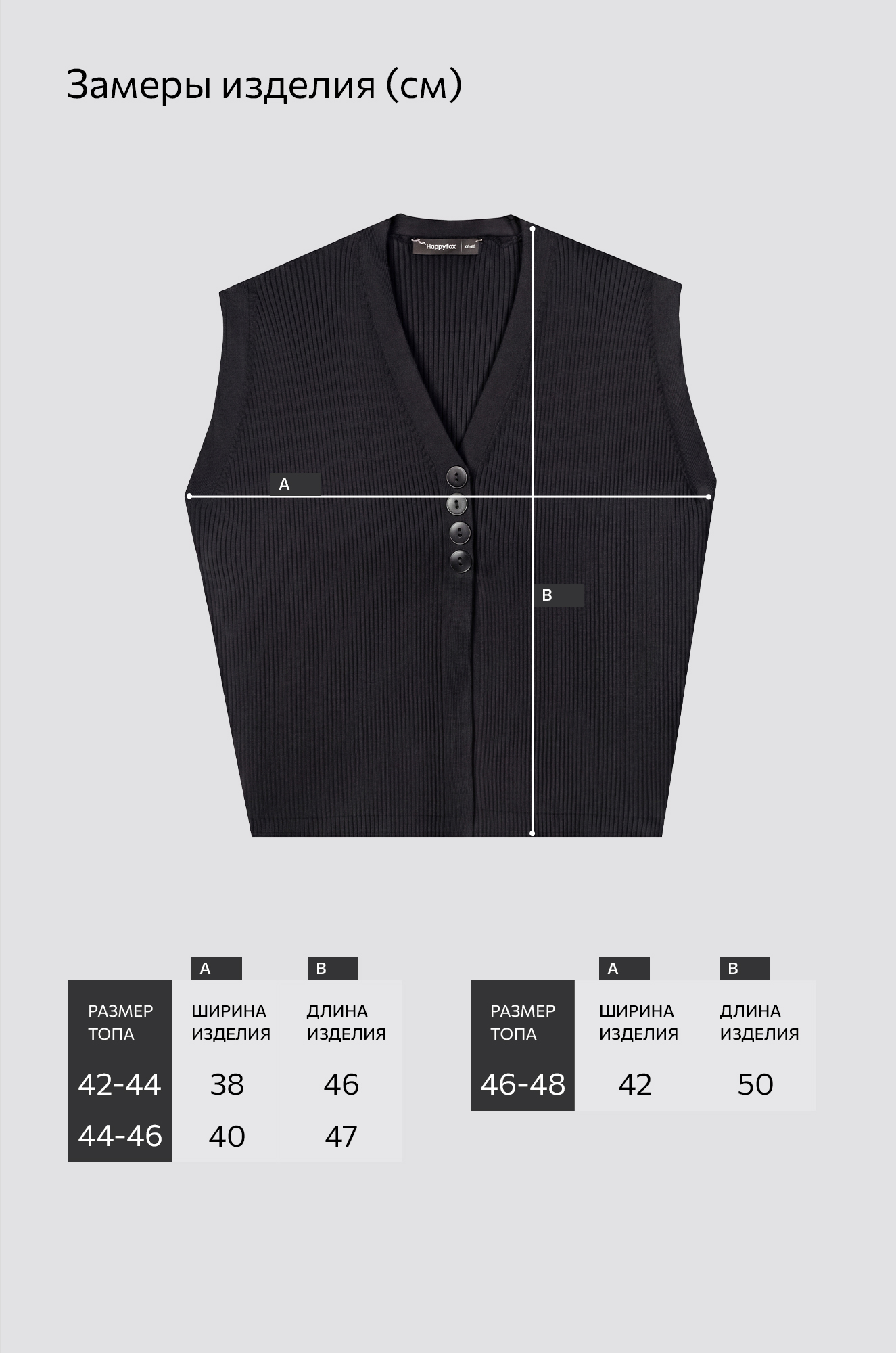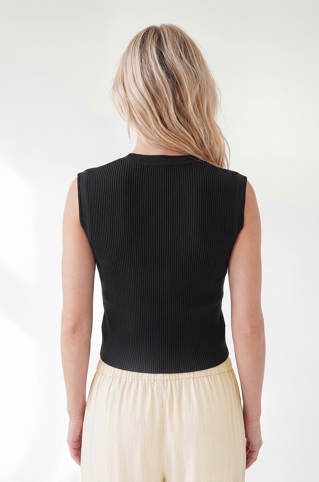 Легкий женский топ создан для жаркого лета. Облегающий крой без рукава, смелый V-вырез и пуговицы на груди подчёркивают силуэт, а укороченная длина и оригинальный фасон деликатно приоткрывают область живота. Топик из вязаного трикотажа в рубчик мягко облегает фигуру.