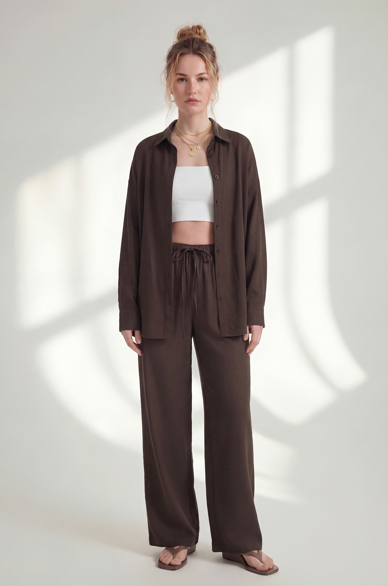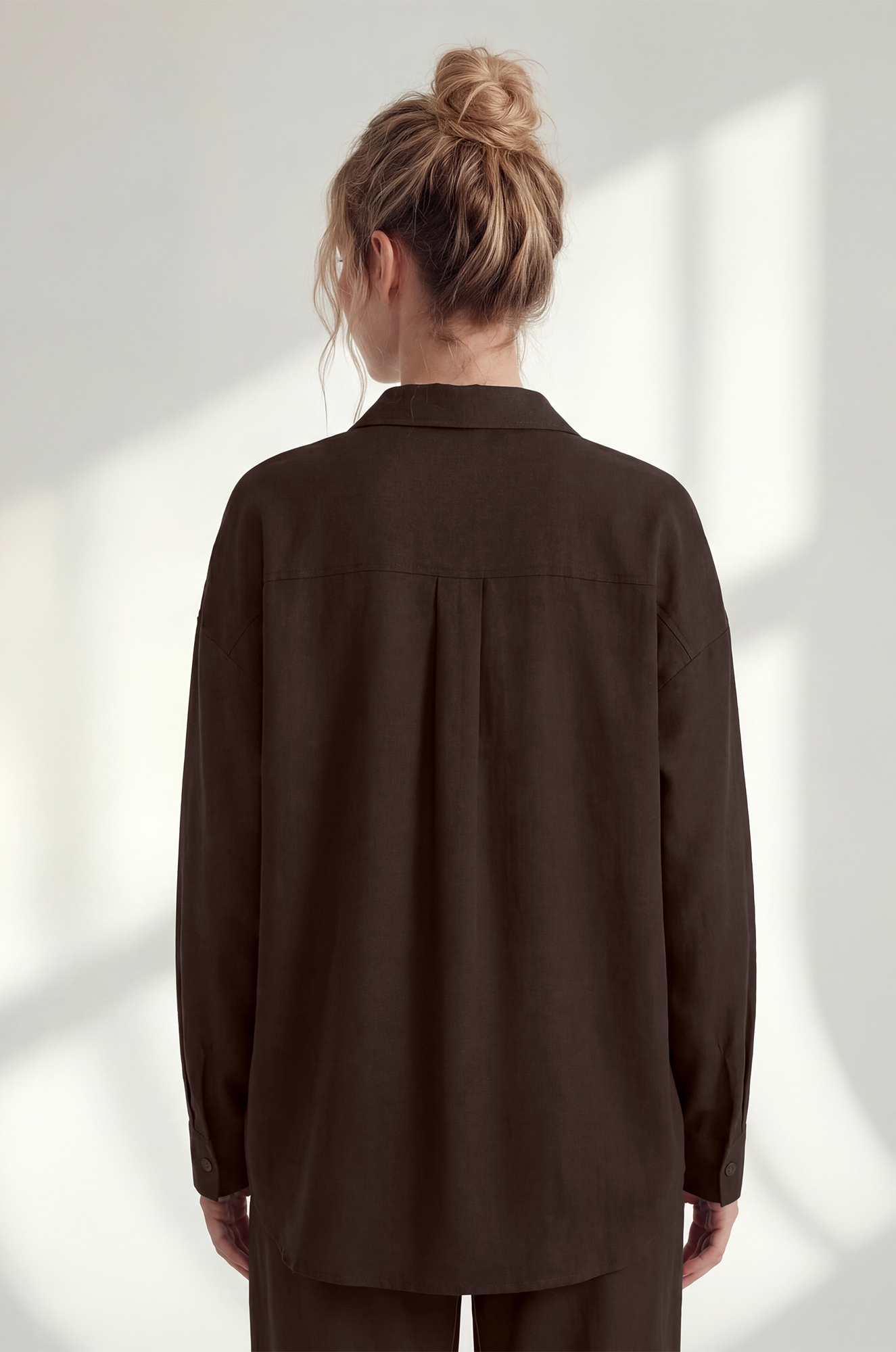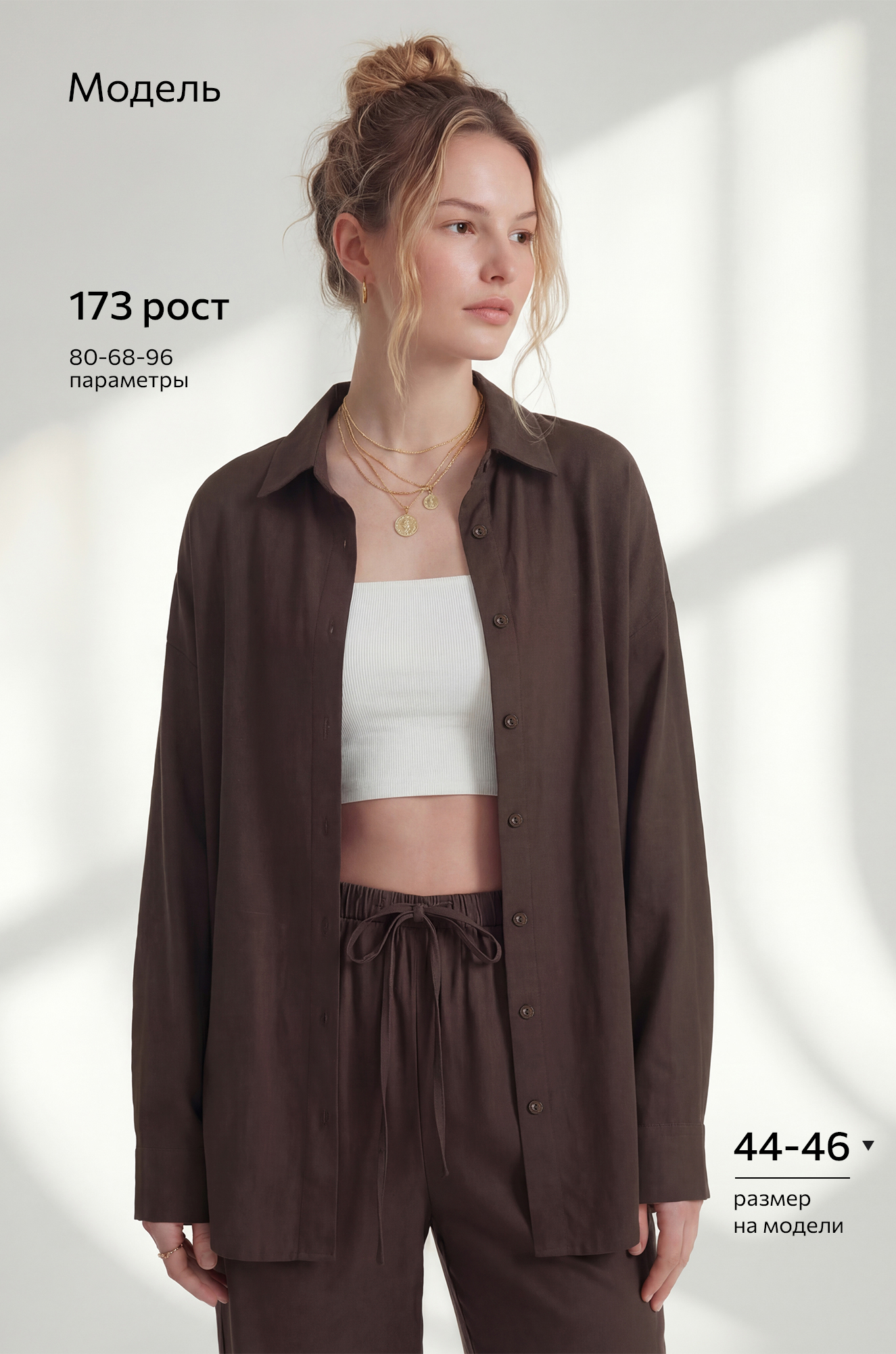 Женская рубашка оверсайз — идеальный выбор для лёгких и расслабленных образов в летнее время года. Стильная льняная рубашка создана для комфорта в жару: свободная посадка, длинный рукав и фактурная ткань делают её универсальной базой на лето. Однотонная рубашка шоколадного цвета выполнена из вискозы и льна — материал мягкий, тонкий, а натуральные волокна льна дарят ощущение прохлады и свежести даже в самый жаркий день.