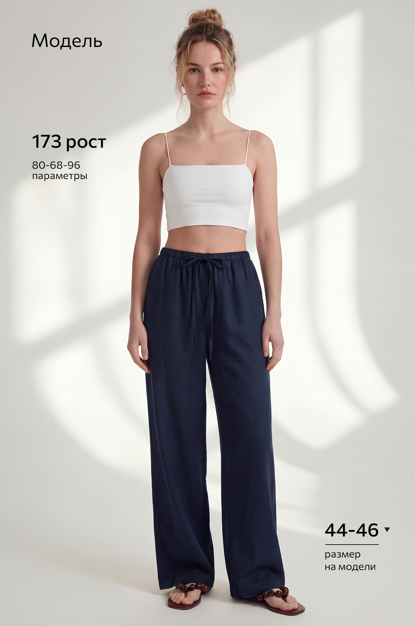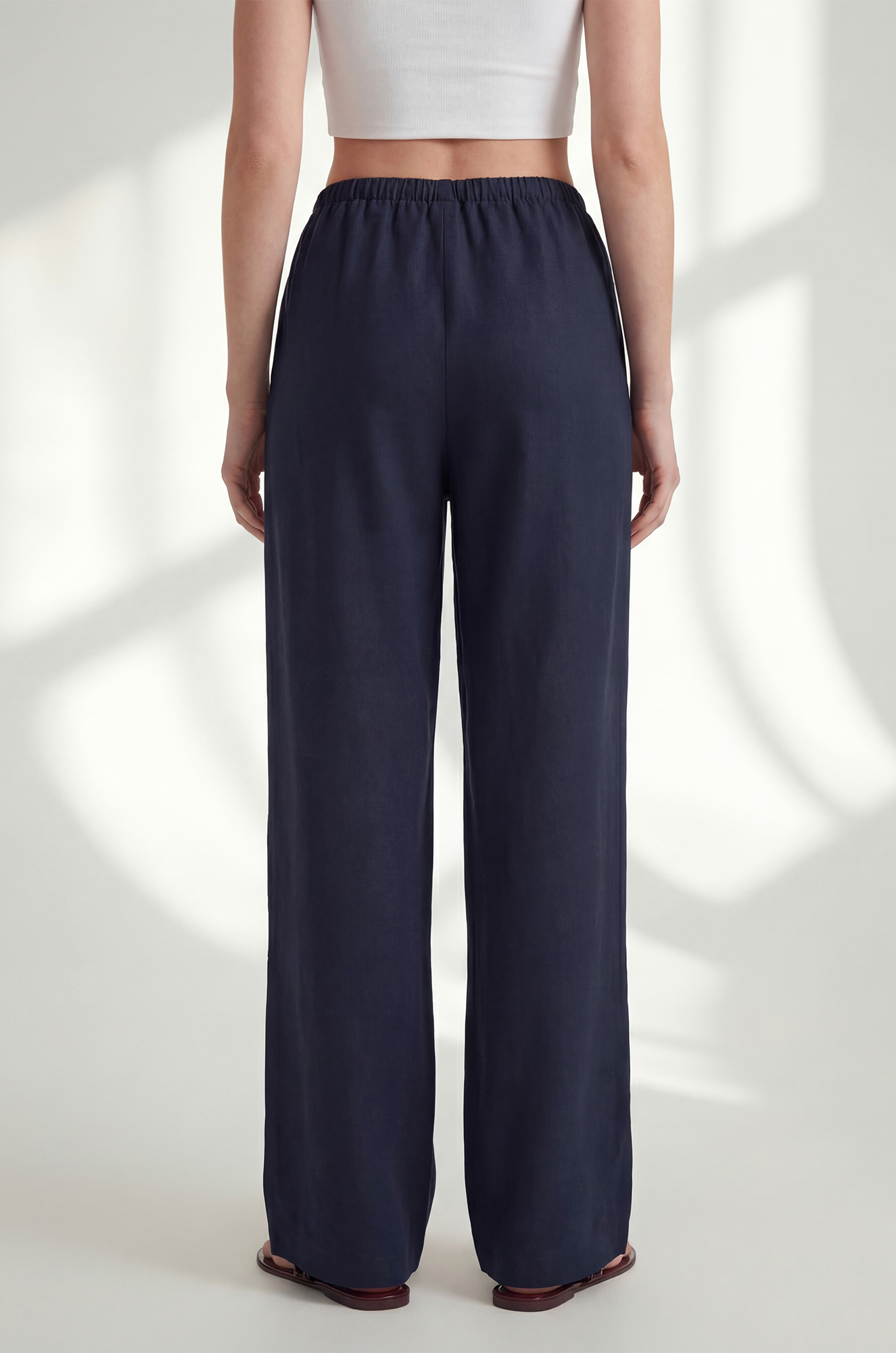 Женские льняные брюки темно-синего цвета — настоящий вздох лета. Свободные и широкие, они словно созданы для ленивого утра у моря: мягкий пояс на резинке регулируется шнурком, а по бокам предусмотрены удобные карманы. В них хочется танцевать и никуда не спешить.