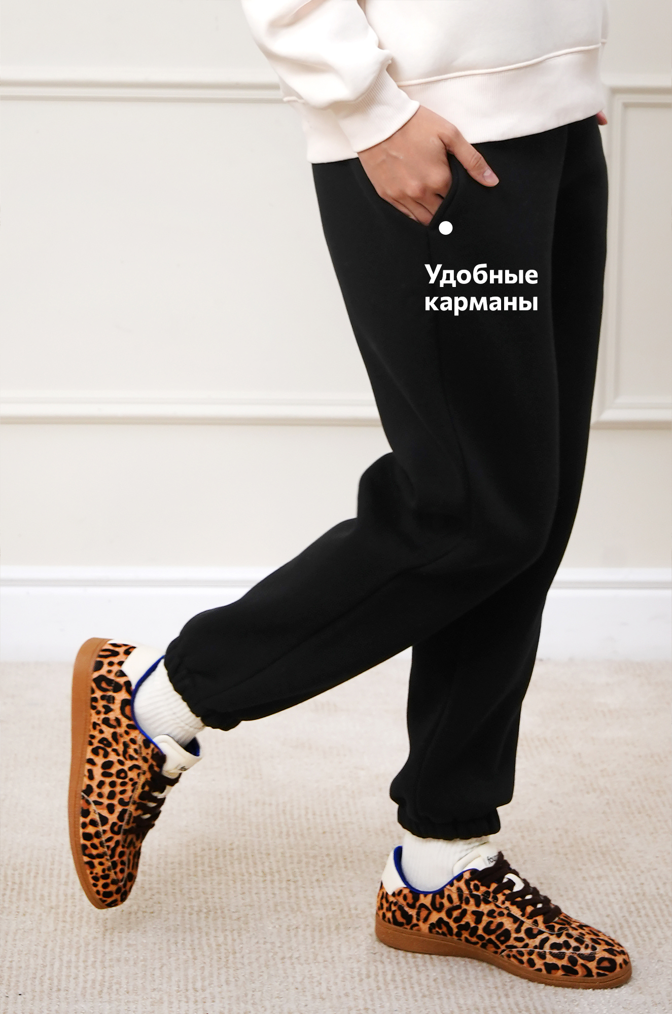 Утепленные женские брюки с начесом — отличный выбор для холодных дней и активного отдыха на природе. Черные однотонные джоггеры выполнены из трикотажа футер с высоким содержанием хлопка и дополнены удобными боковыми карманами.