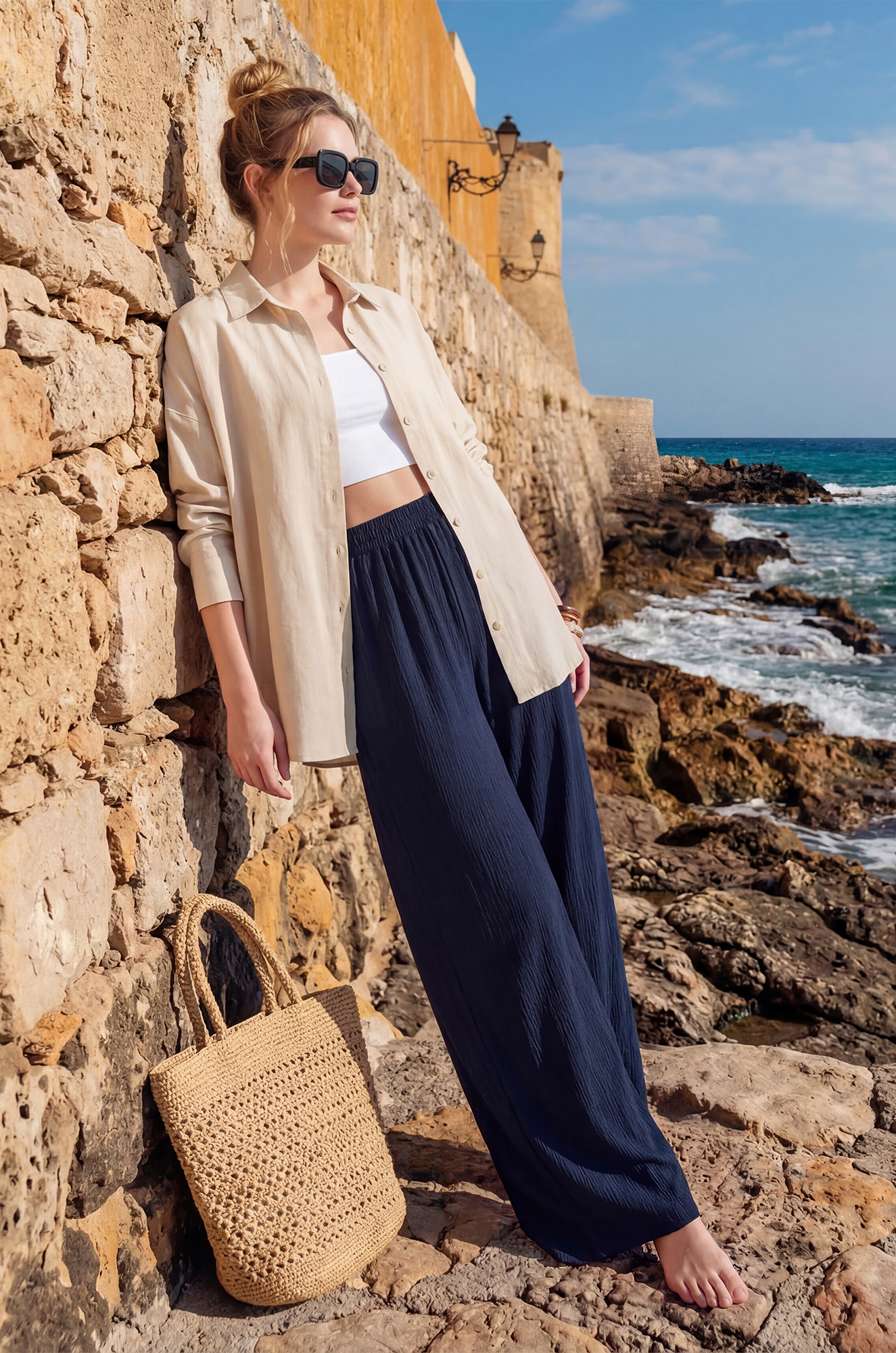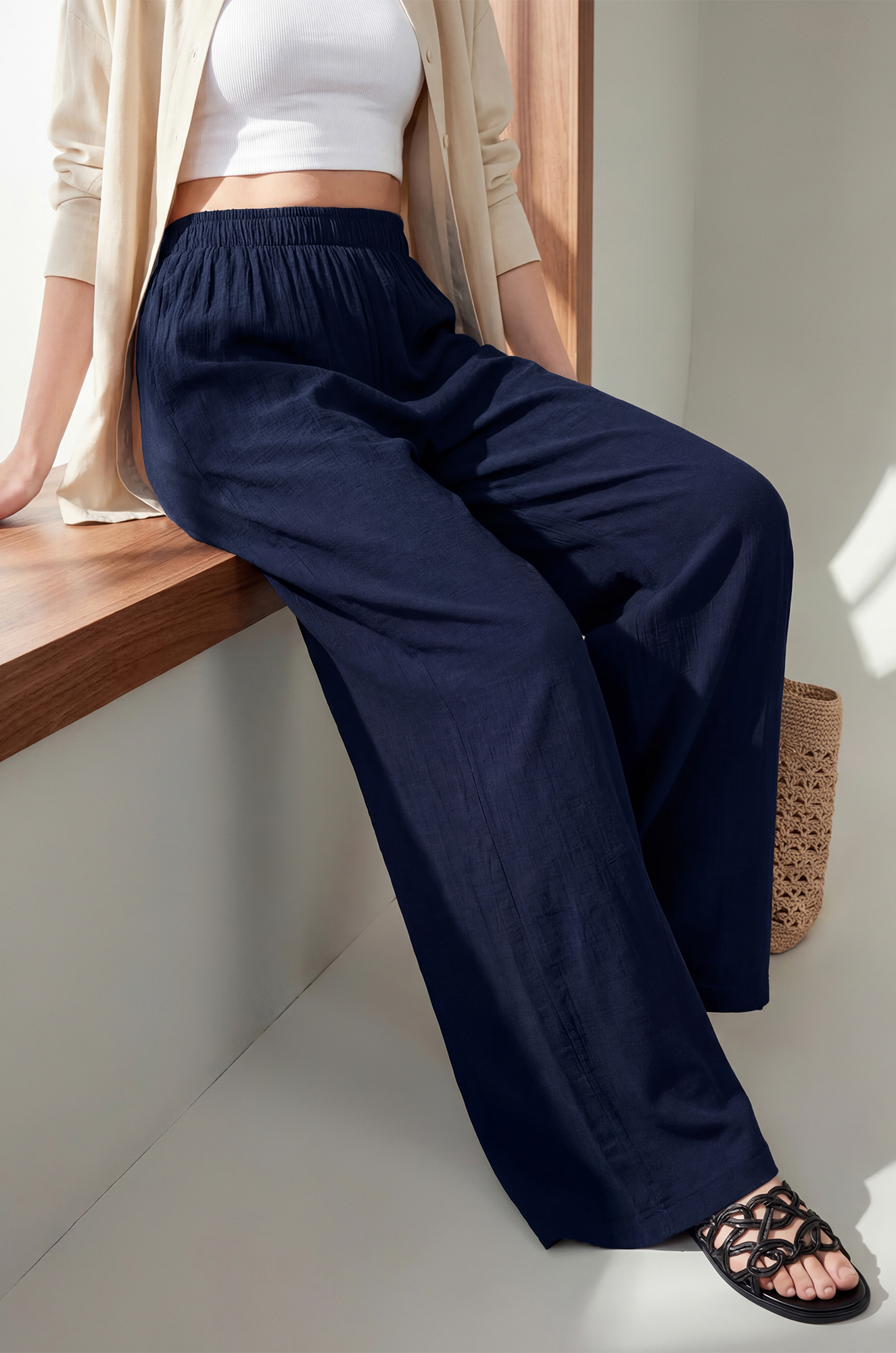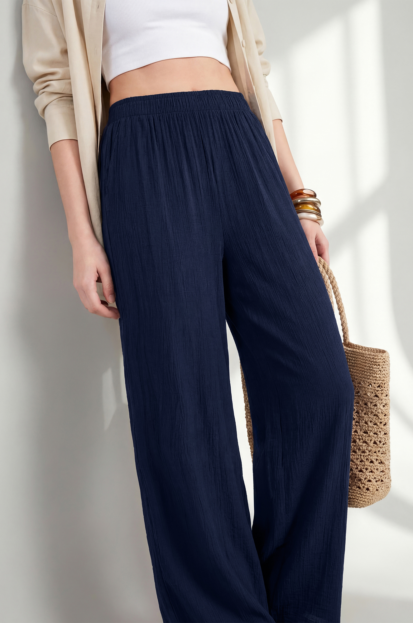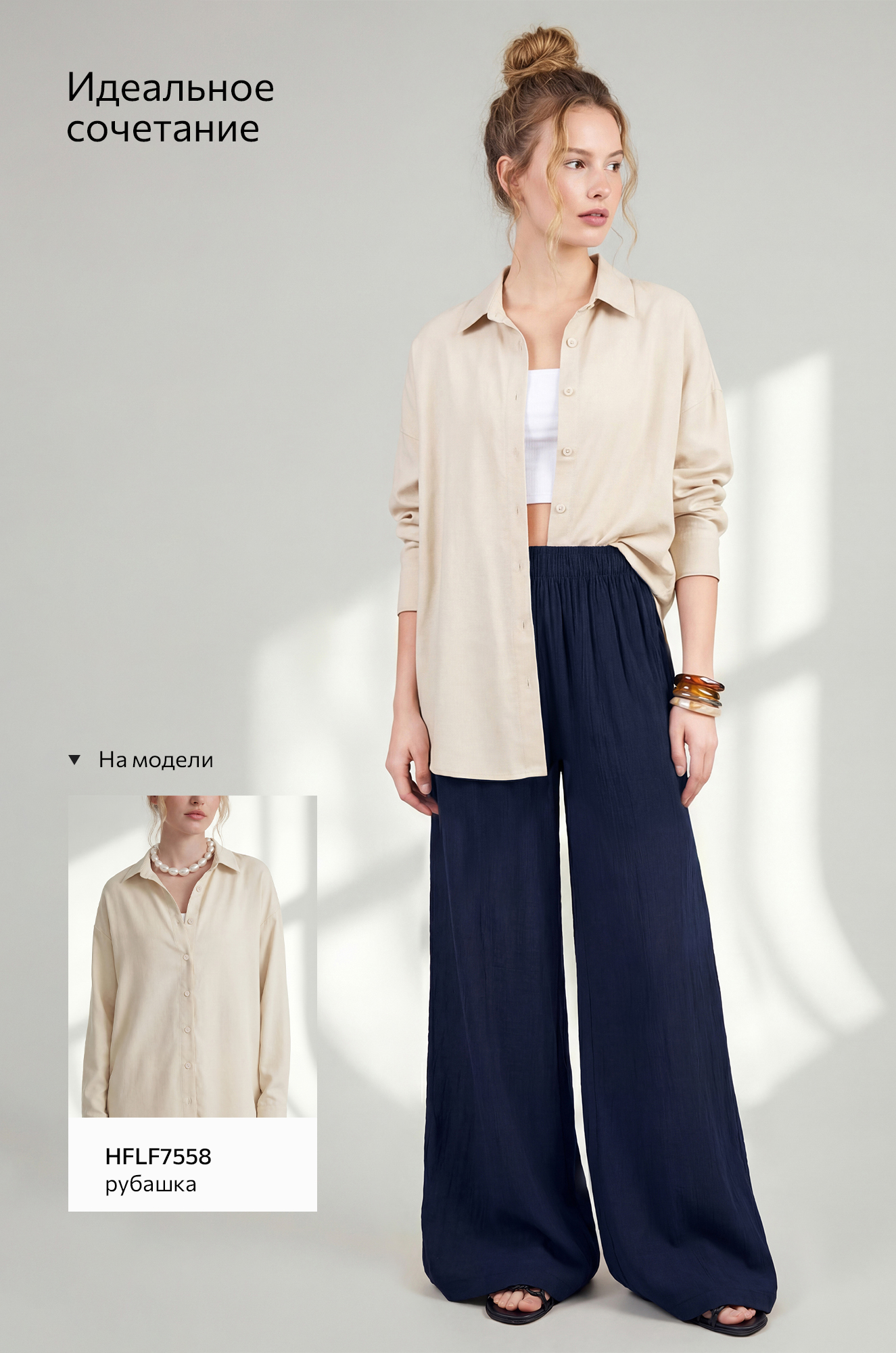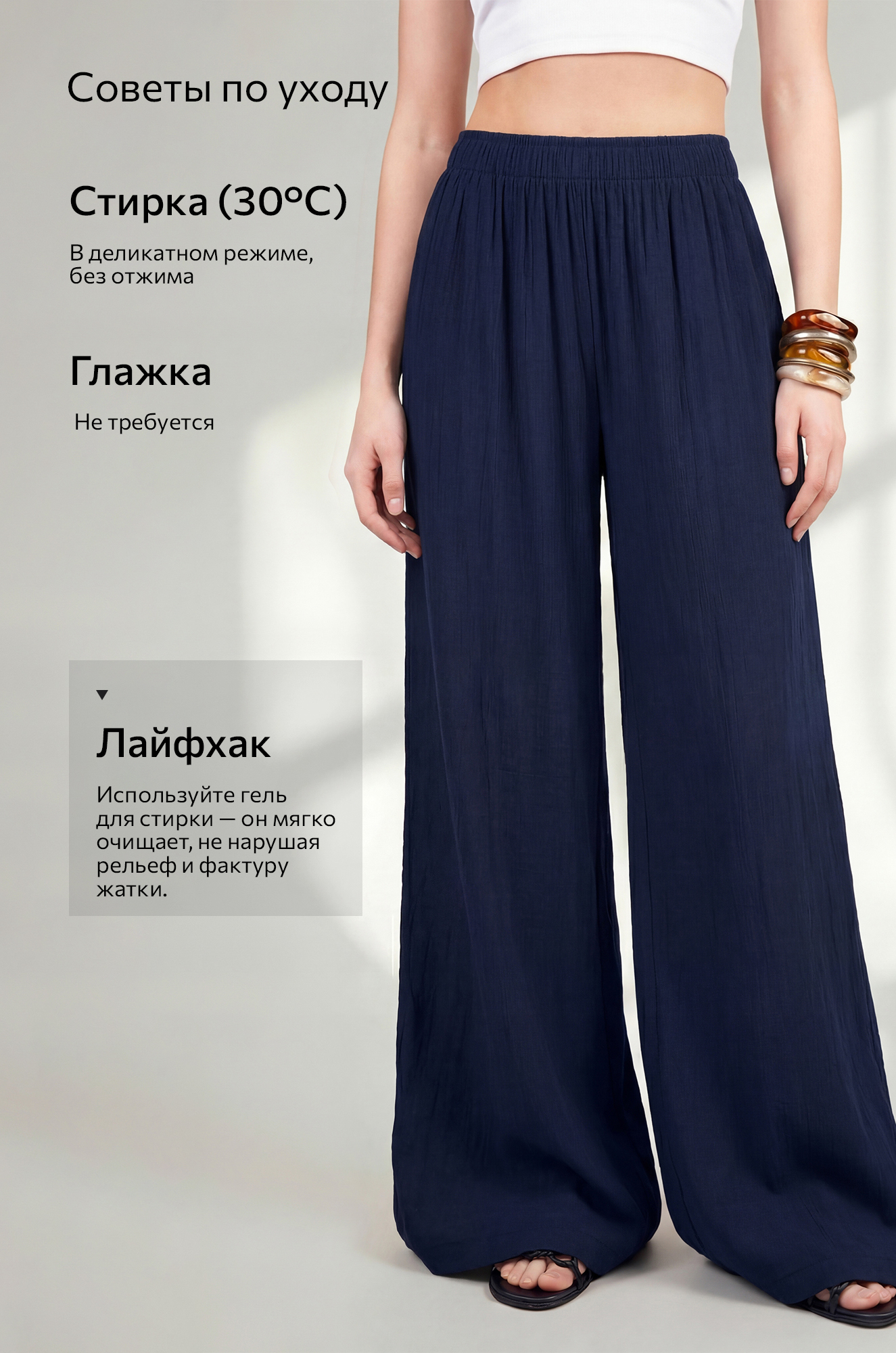 Женские брюки палаццо — комфорт и лёгкость на весь день. Мягкий пояс на резинке позволяет легко отрегулировать посадку по фигуре, а эффектная жатка добавляет стильную фактуру без лишних усилий.