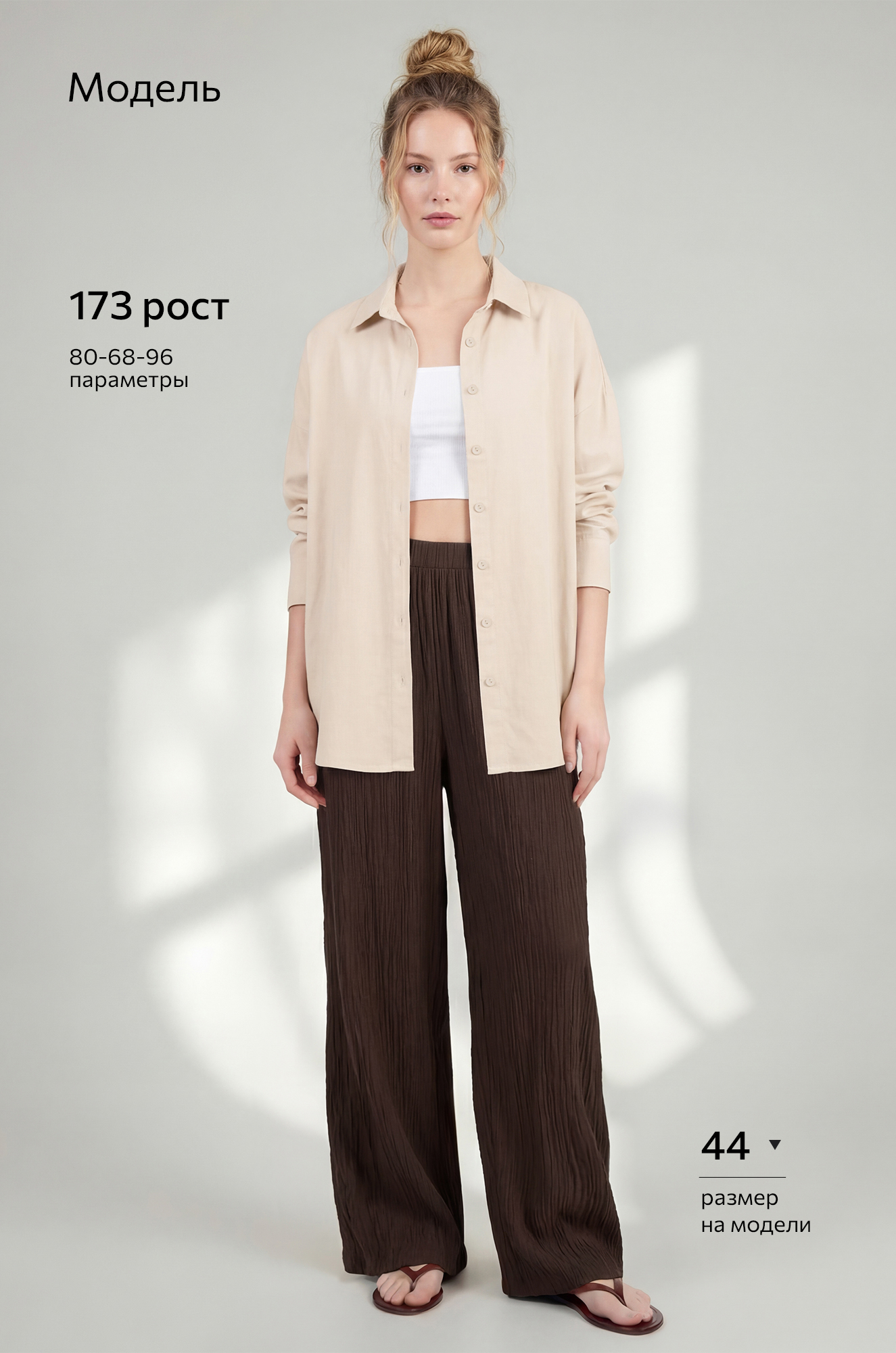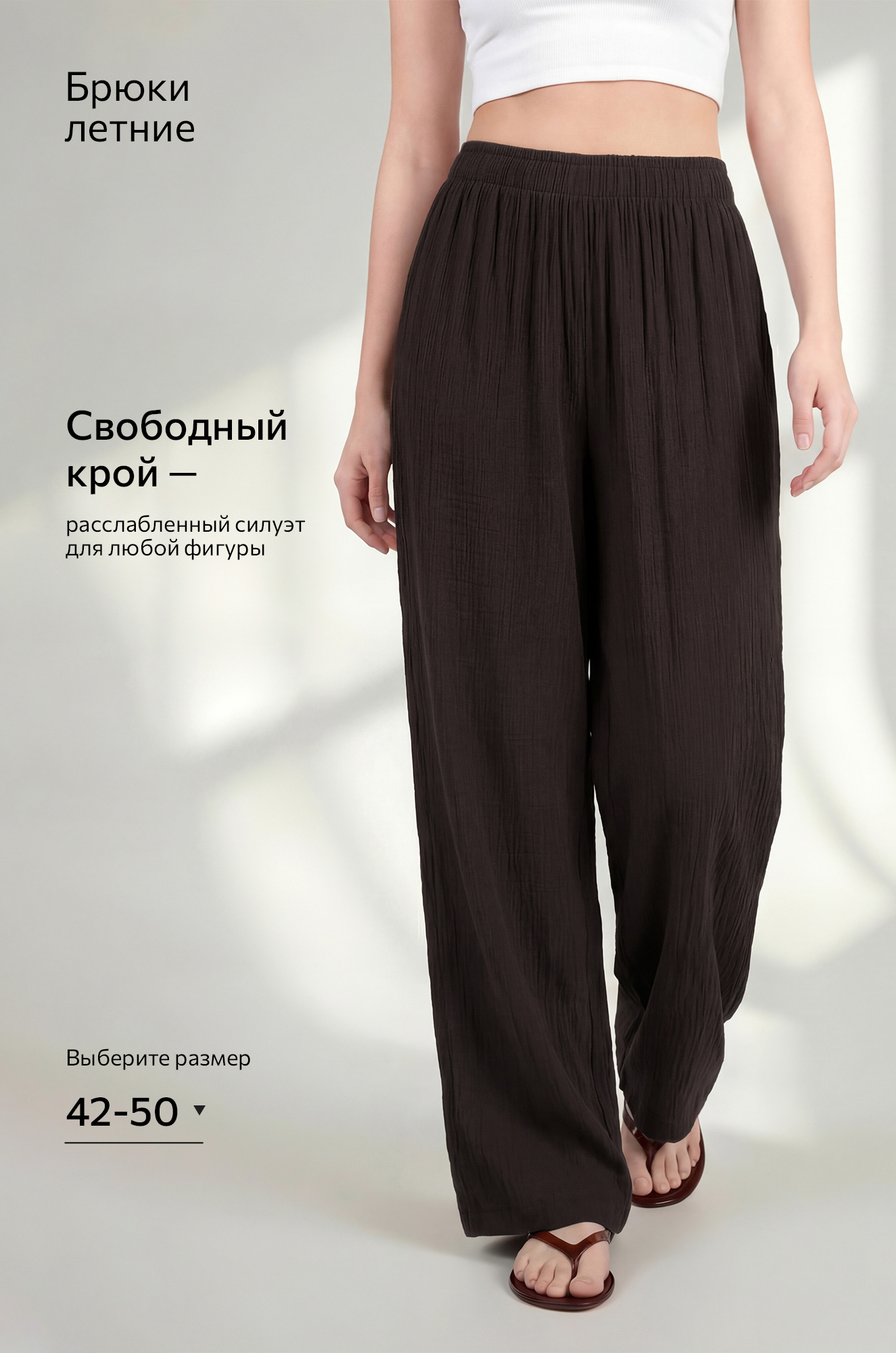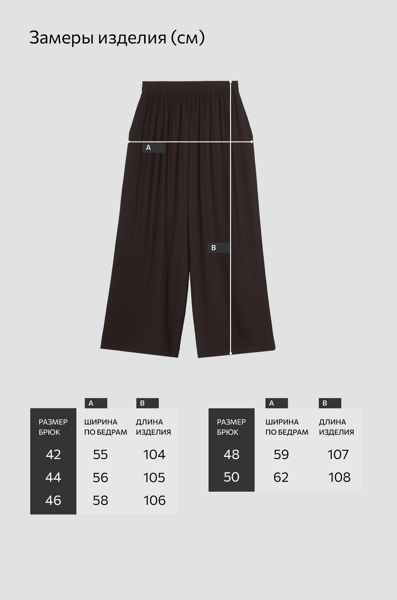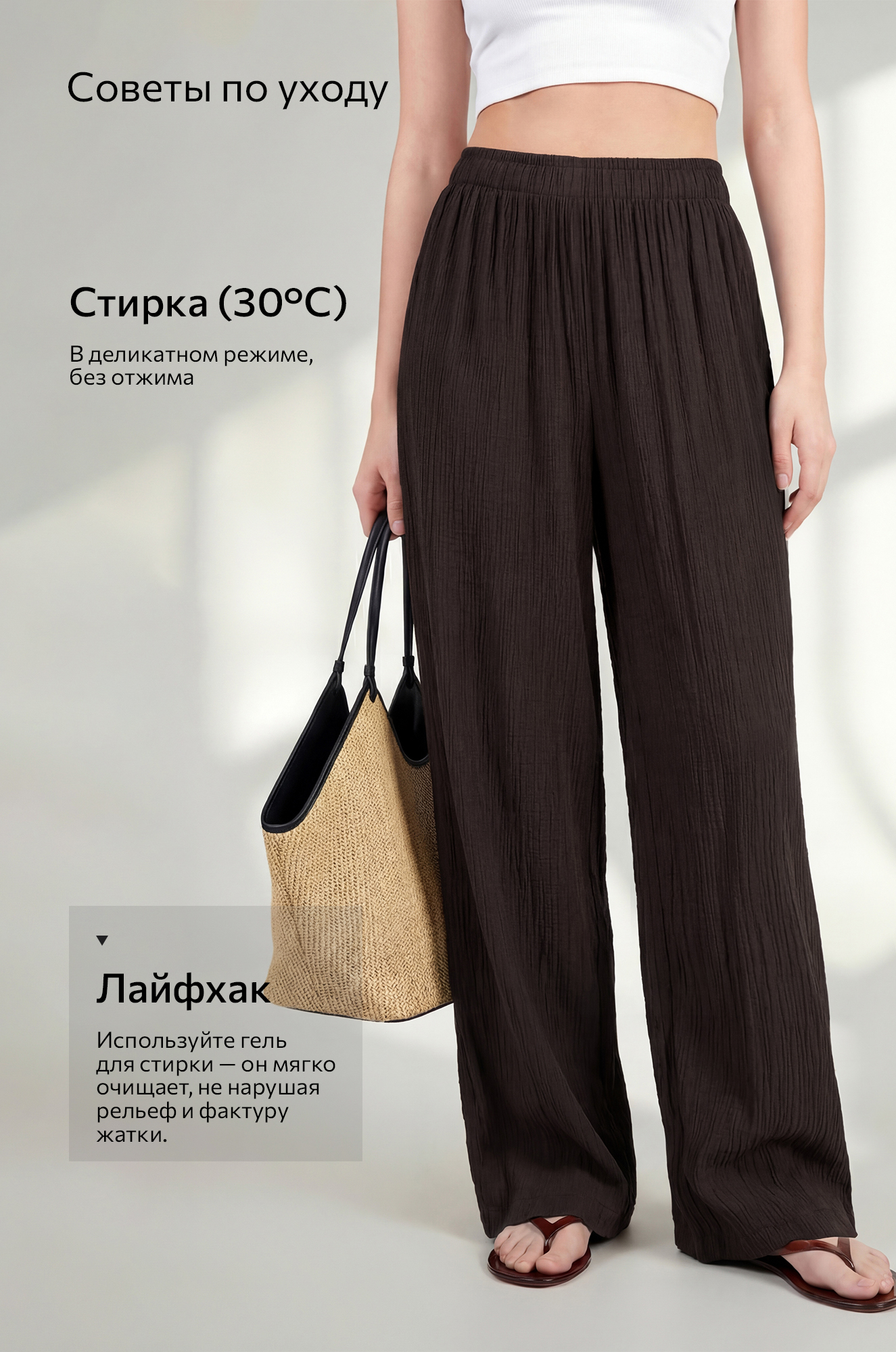 Женские брюки палаццо — комфорт и лёгкость на весь день. Мягкий пояс на резинке позволяет легко отрегулировать посадку по фигуре, а эффектная жатка добавляет стильную фактуру без лишних усилий.
