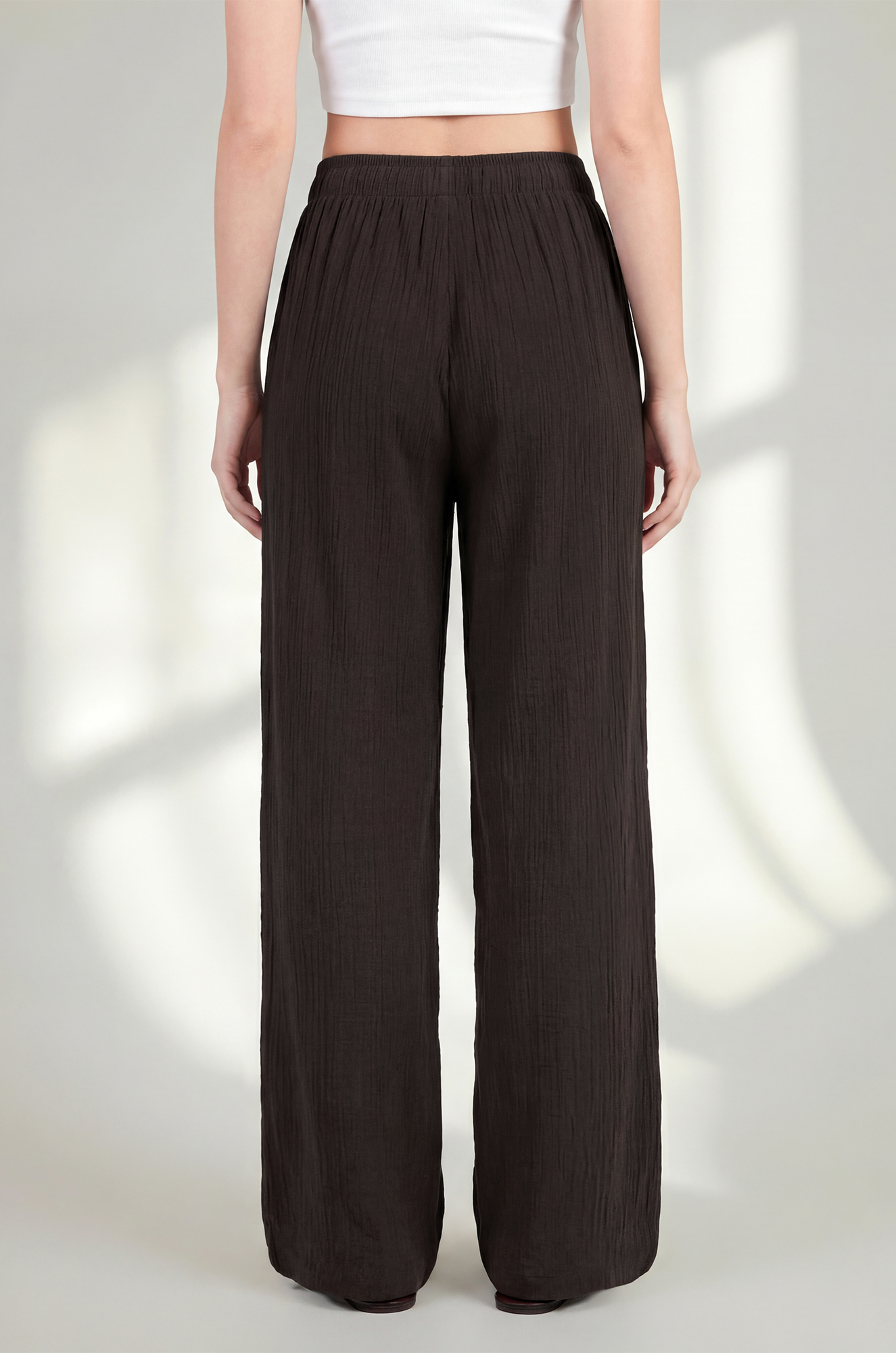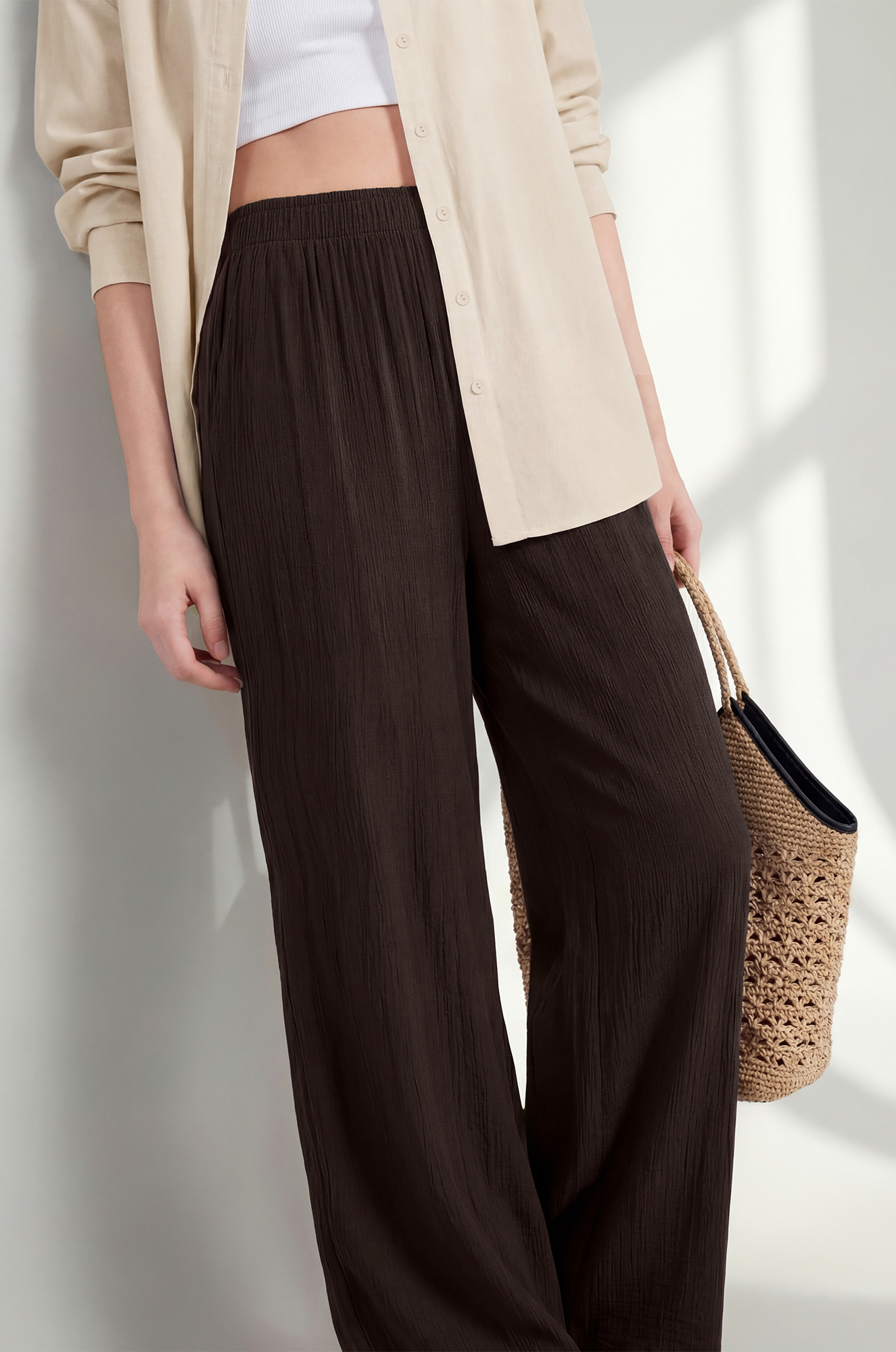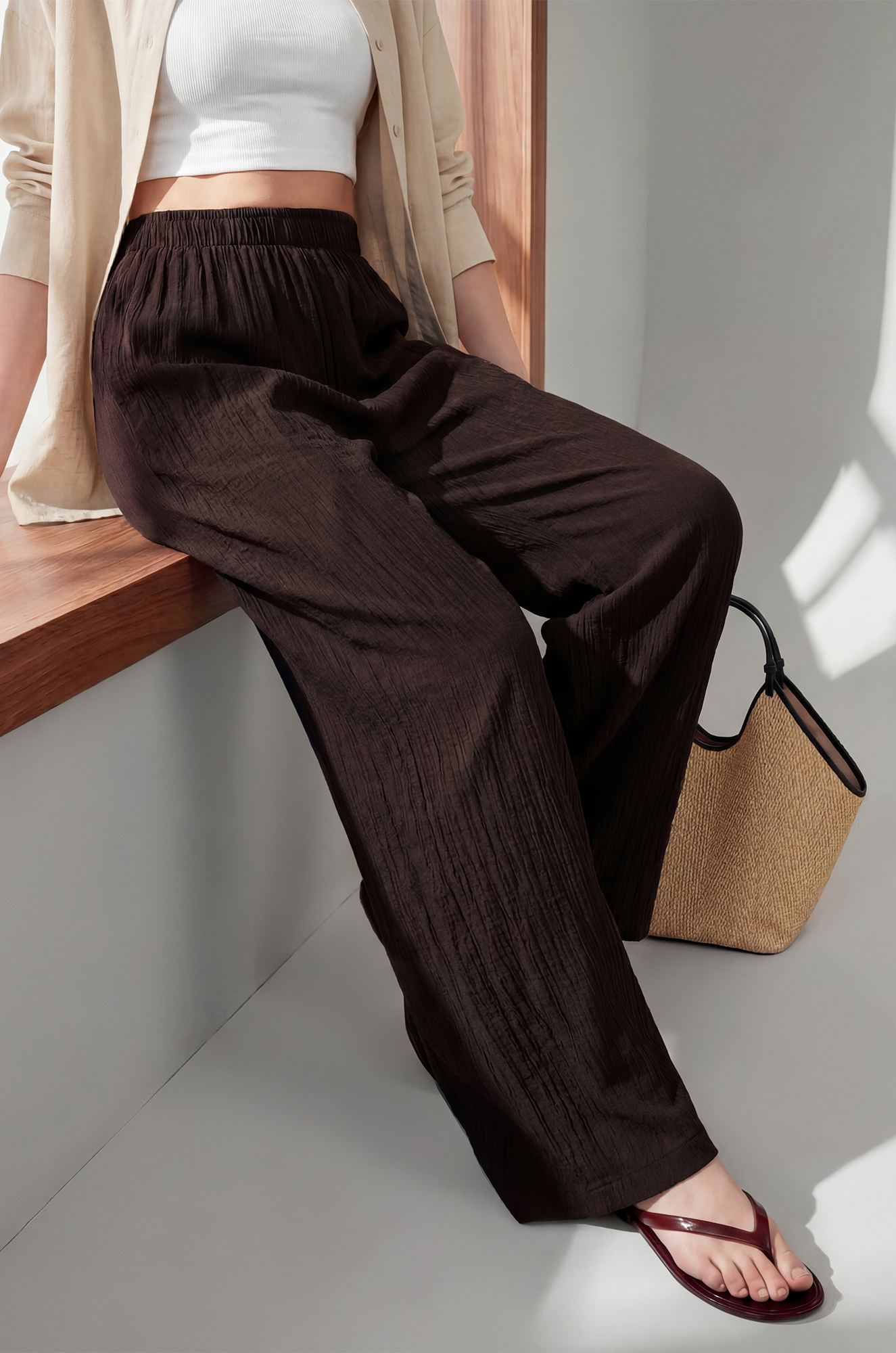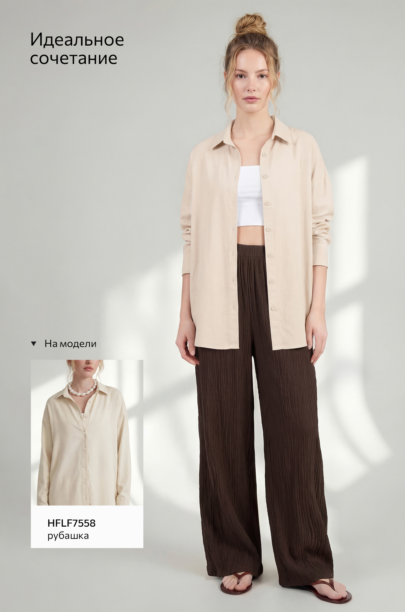 Женские брюки палаццо — комфорт и лёгкость на весь день. Мягкий пояс на резинке позволяет легко отрегулировать посадку по фигуре, а эффектная жатка добавляет стильную фактуру без лишних усилий.