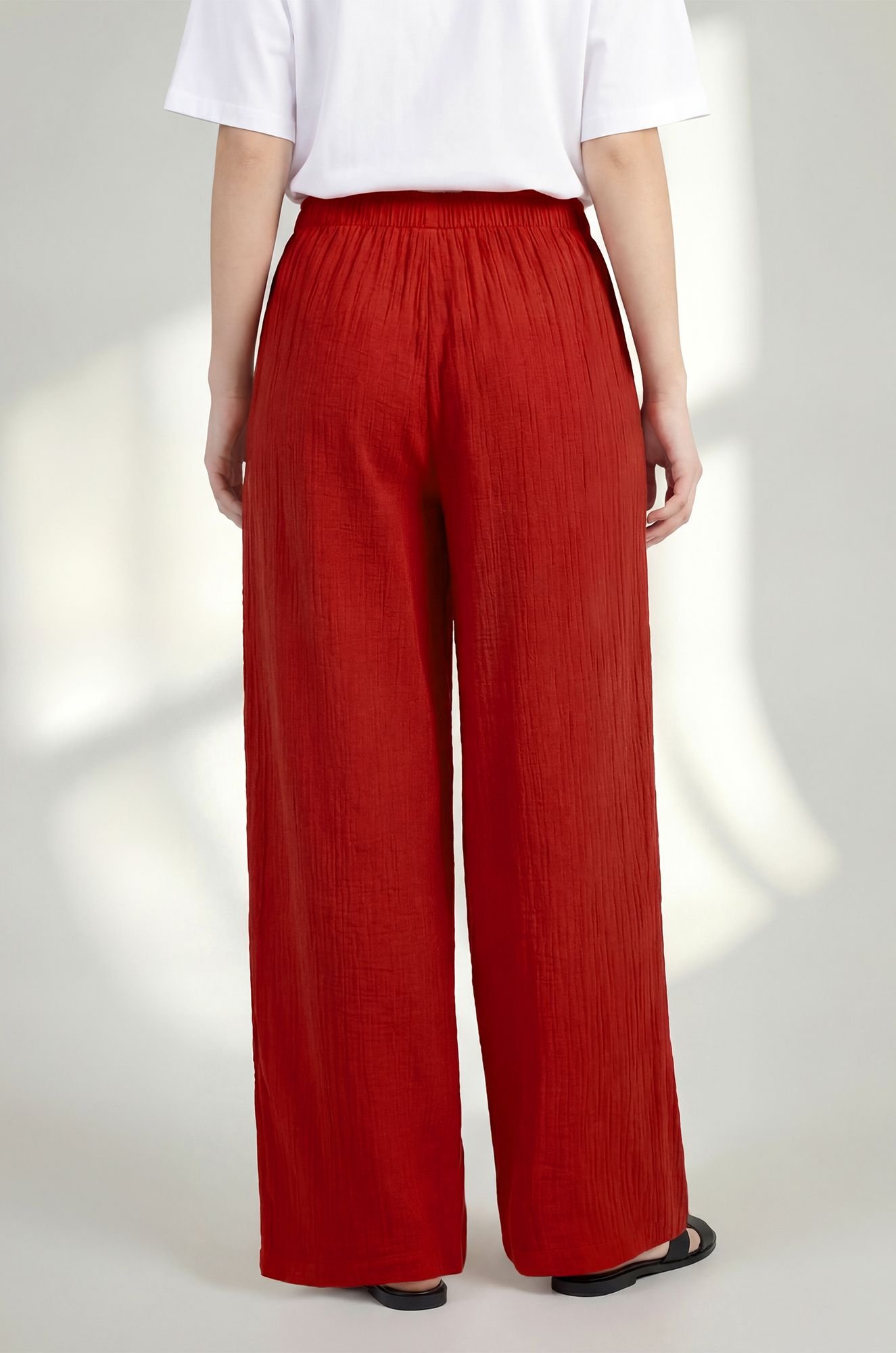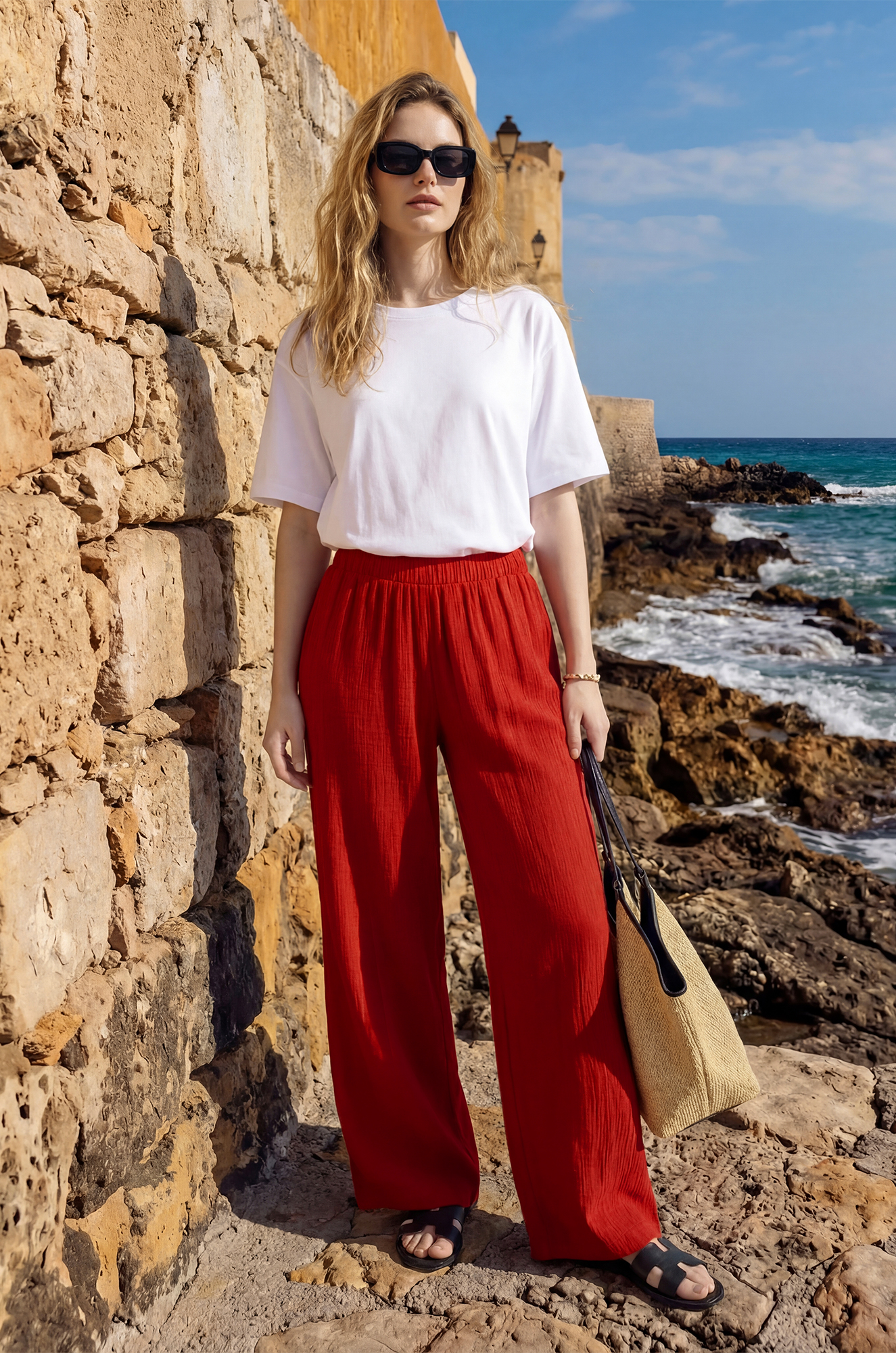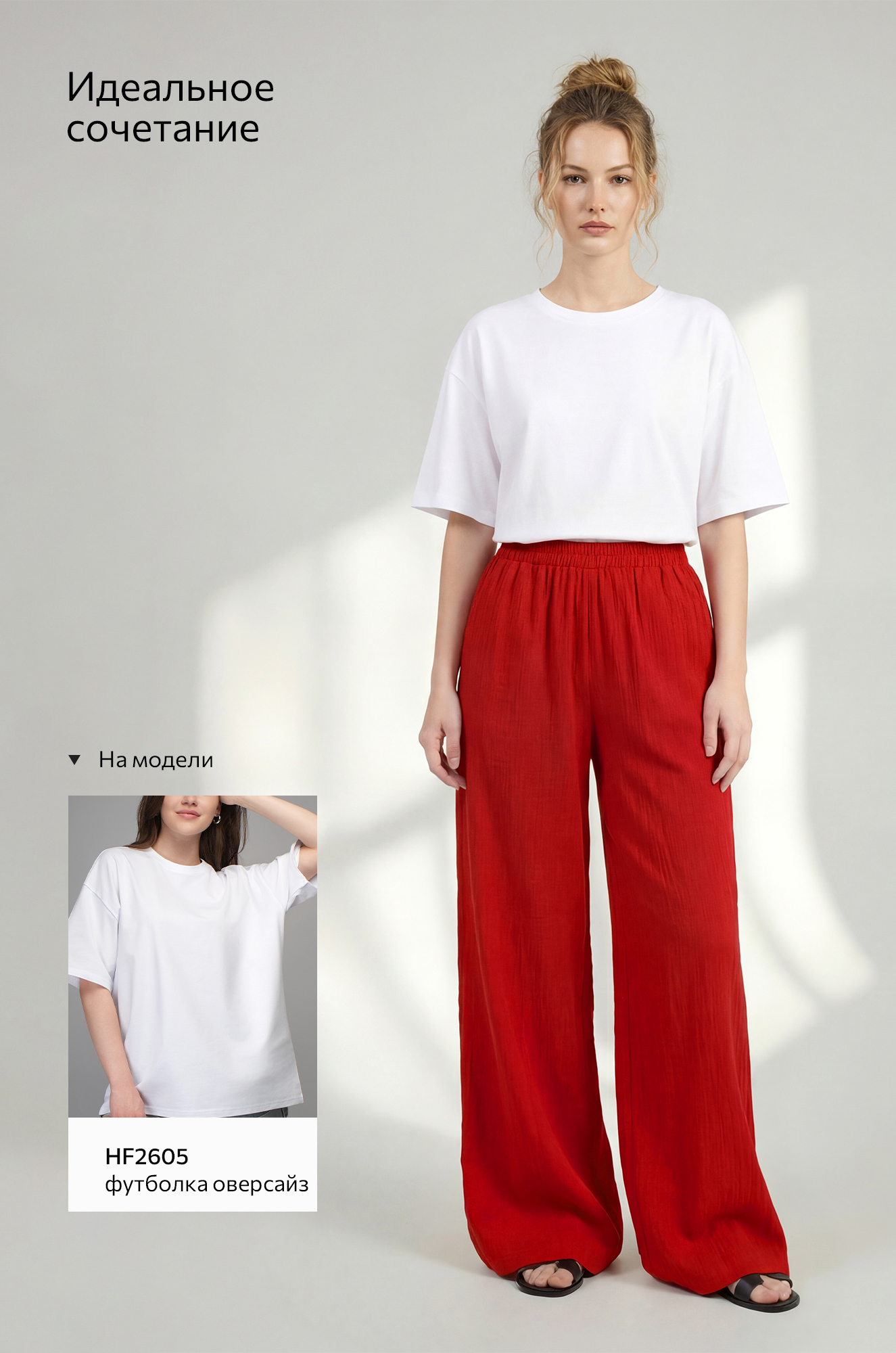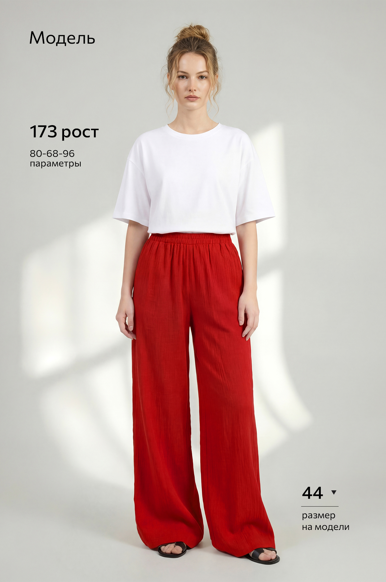 Женские брюки палаццо — комфорт и лёгкость на весь день. Мягкий пояс на резинке позволяет легко отрегулировать посадку по фигуре, а эффектная жатка добавляет стильную фактуру без лишних усилий.