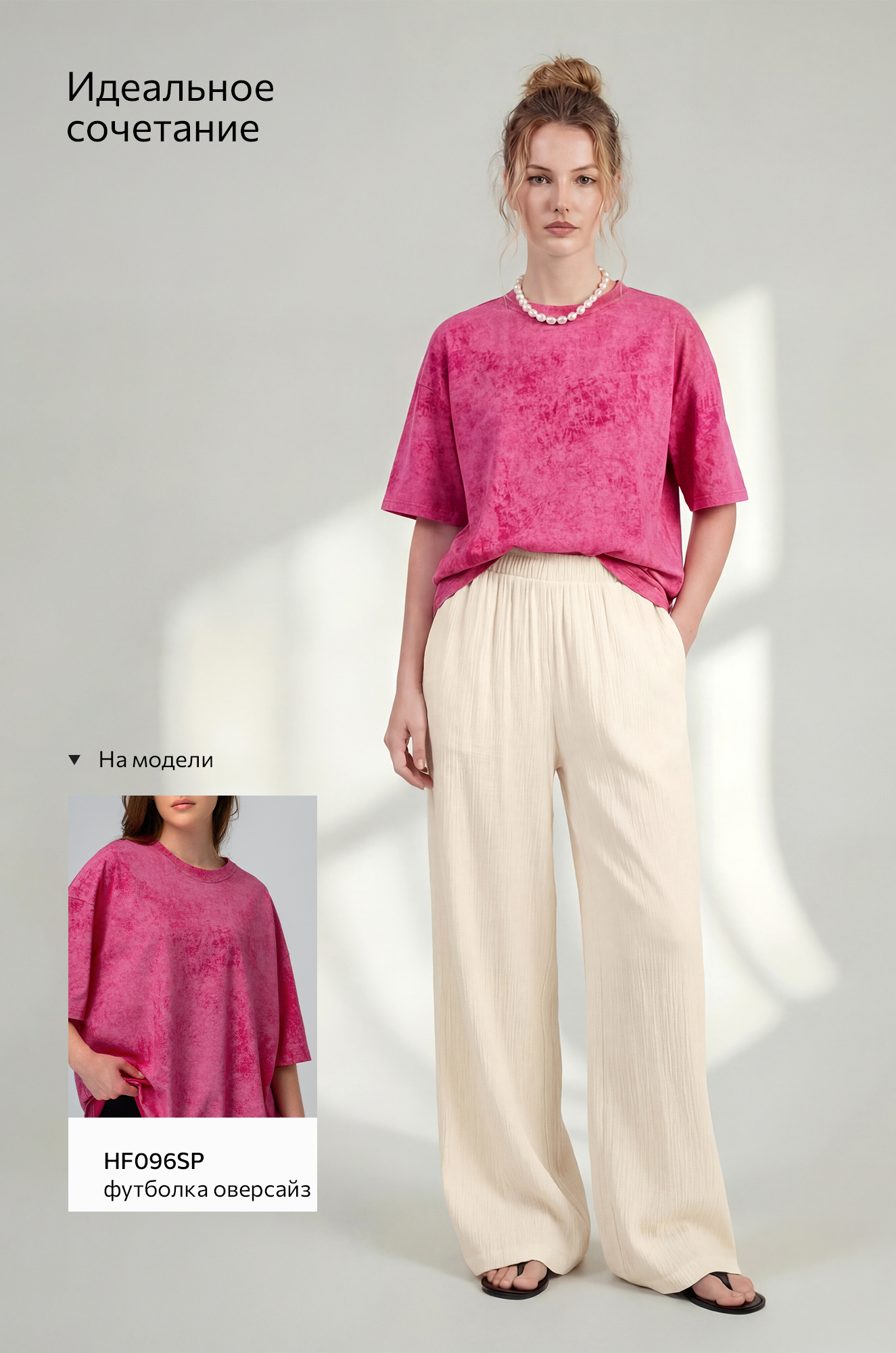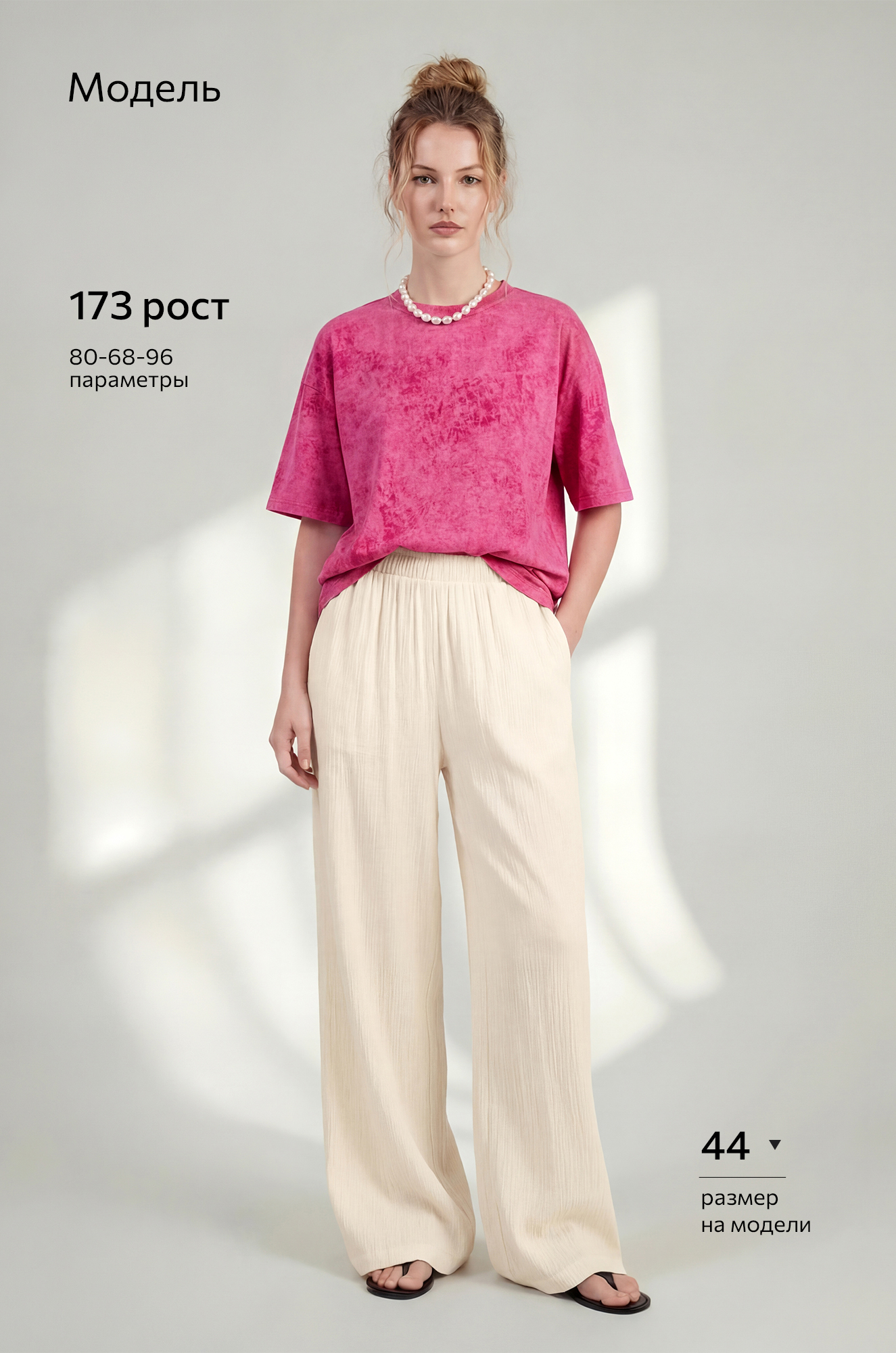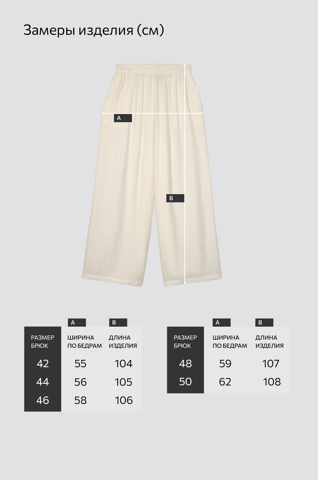 Женские брюки палаццо — комфорт и лёгкость на весь день. Мягкий пояс на резинке позволяет легко отрегулировать посадку по фигуре, а эффектная жатка добавляет стильную фактуру без лишних усилий.