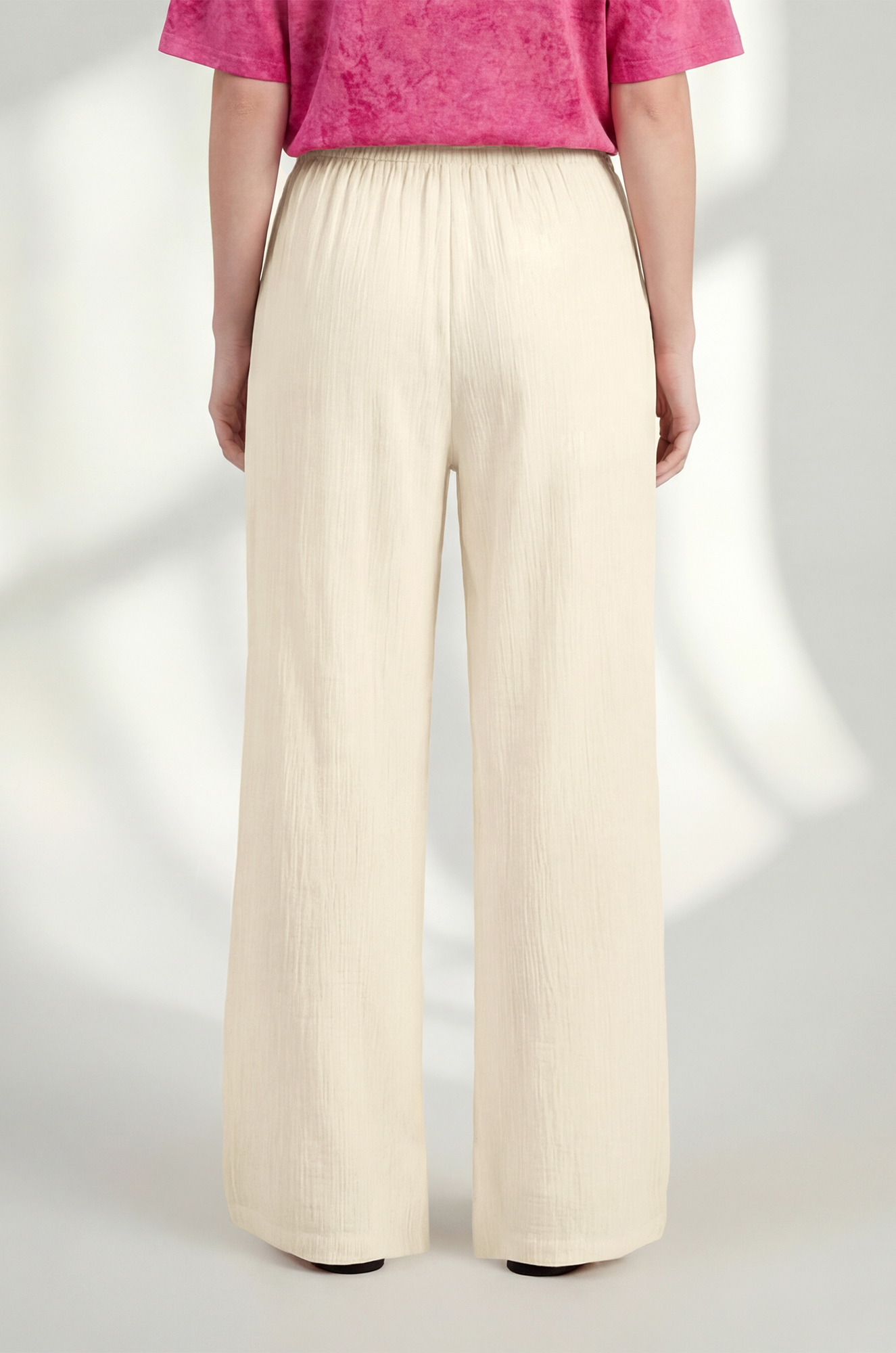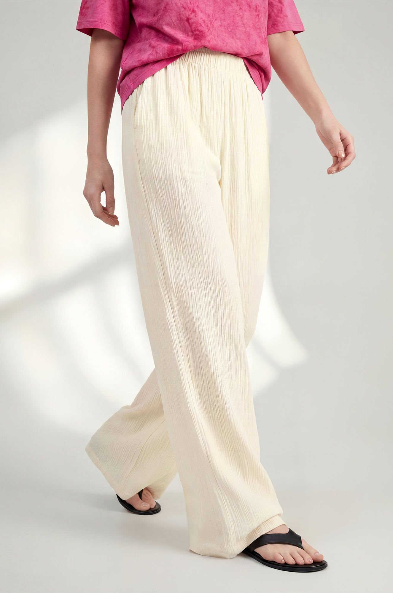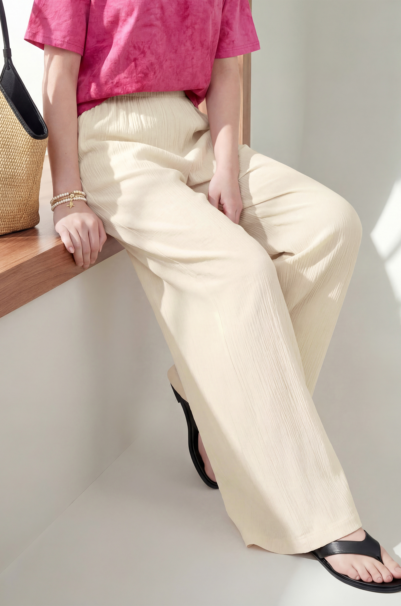 Женские брюки палаццо — комфорт и лёгкость на весь день. Мягкий пояс на резинке позволяет легко отрегулировать посадку по фигуре, а эффектная жатка добавляет стильную фактуру без лишних усилий.