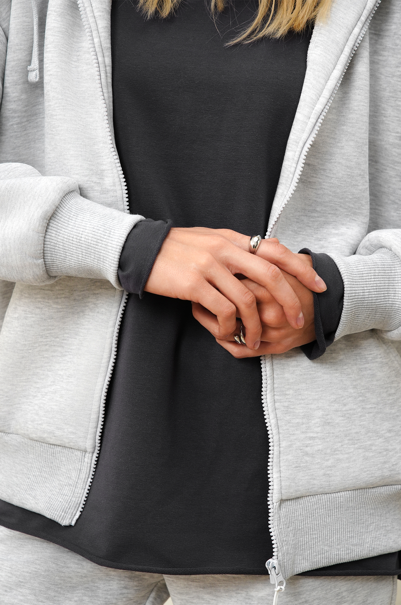 — однотонный светло-серый костюм подойдет для осенних и зимних дней.