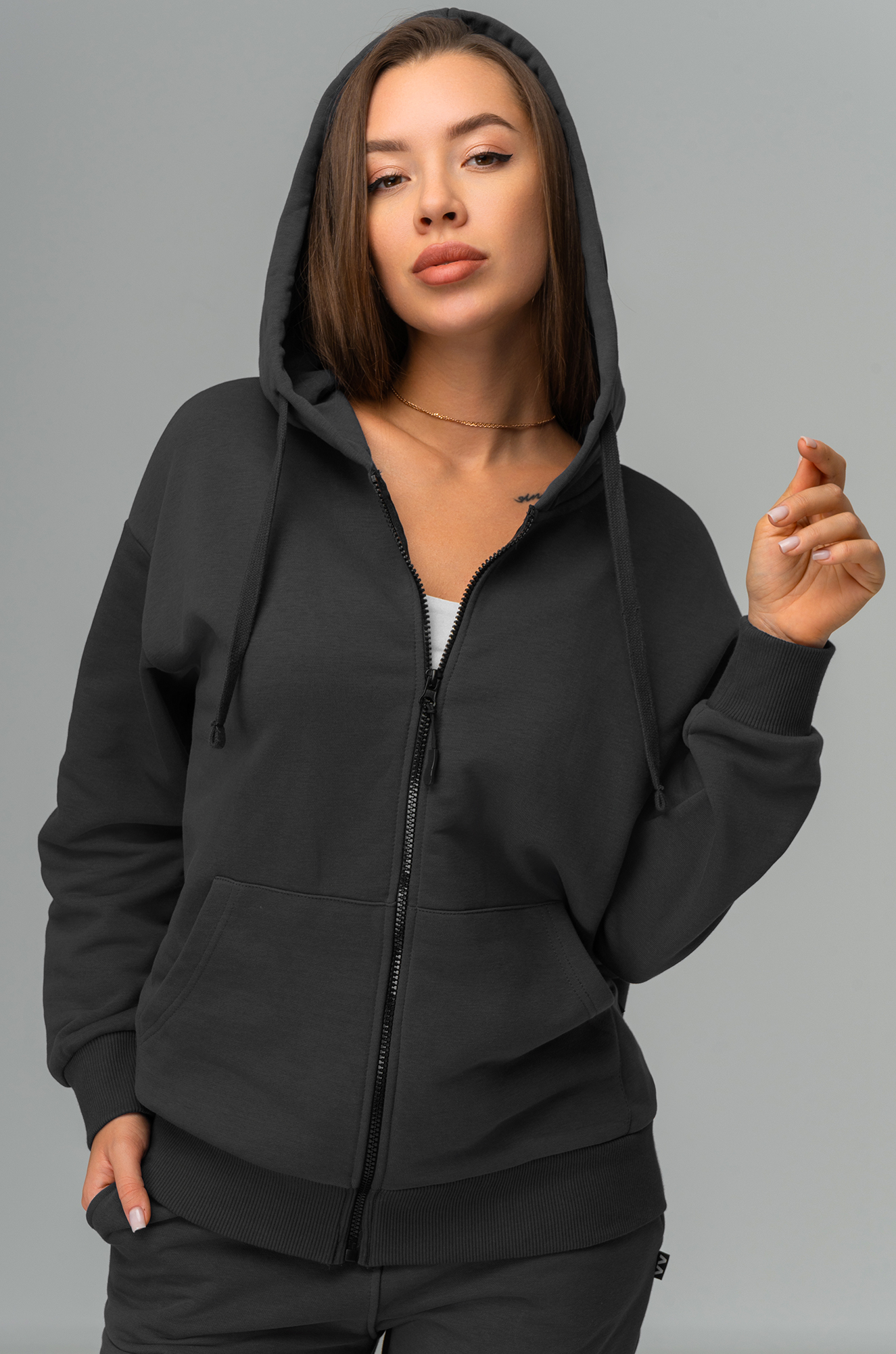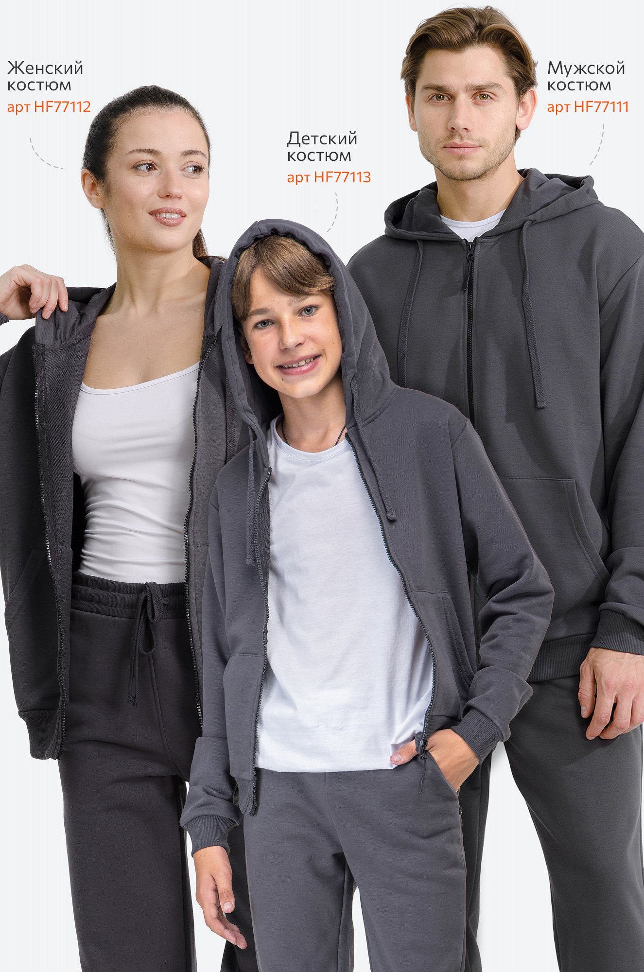— однотонный темно-серый костюм со штанами выполнен из плотного футера трехнитки;
