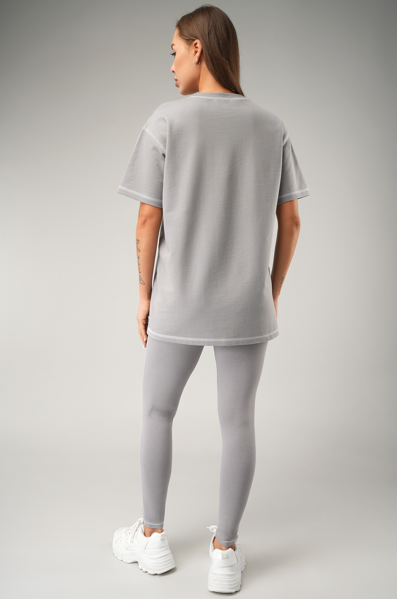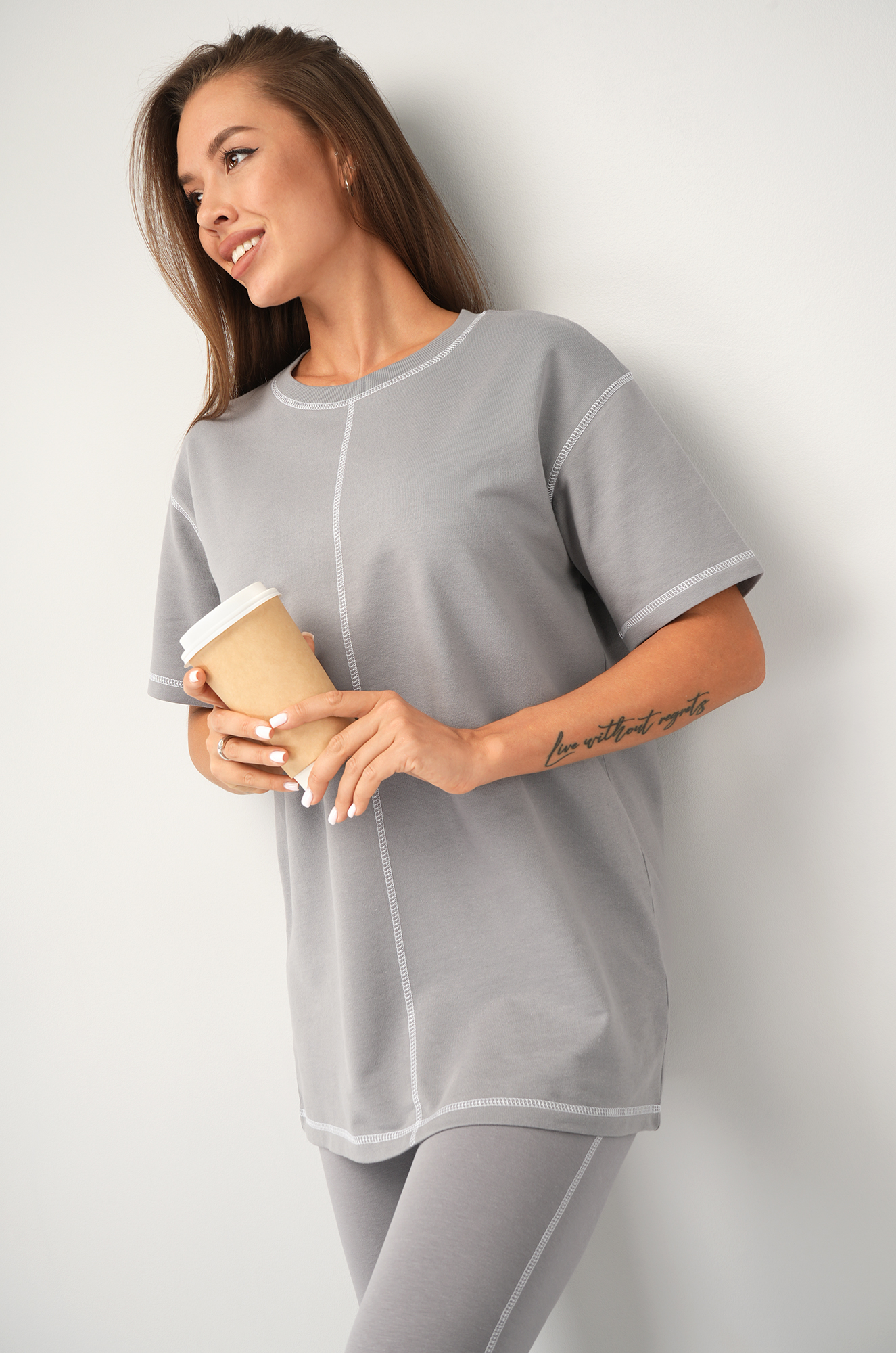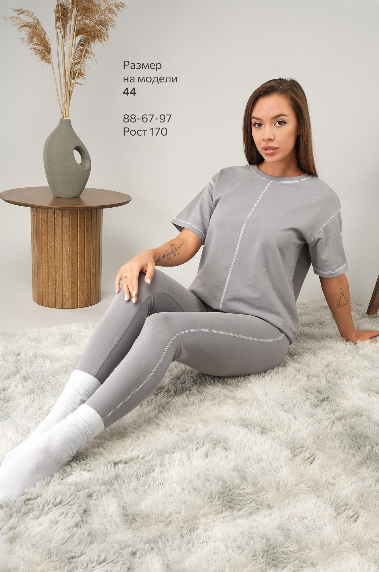 Футболка с круглым вырезом и спущенным плечом создаёт расслабленный силуэт, а лосины подчёркивают фигуру и добавляют динамики образу. Трикотажный костюм для женщин — универсальный выбор: он отлично подойдёт для спортивных занятий в зале и станет удобным домашним комплектом на каждый день.