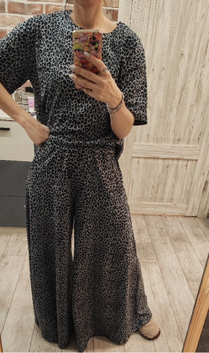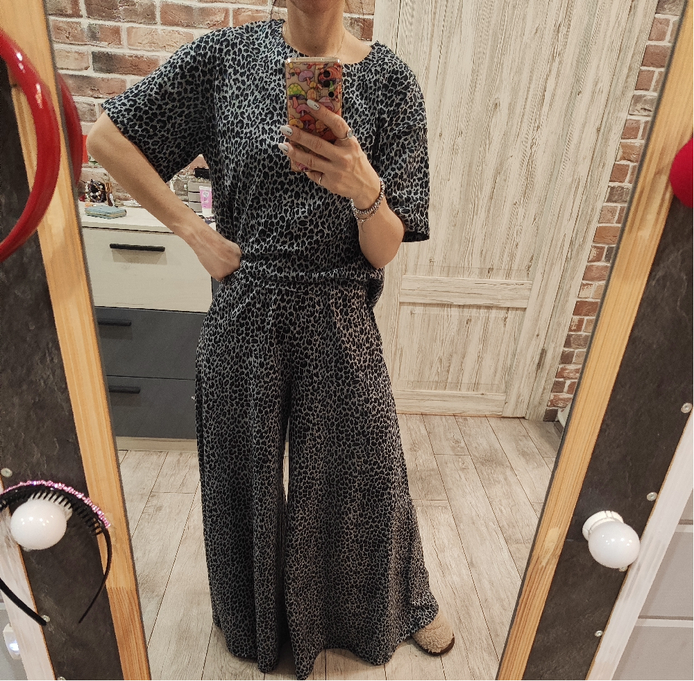 — женский костюм с принтом леопард выполнен из кулирной глади, состоящей из 100% хлопка, что обеспечивает мягкость и комфорт;