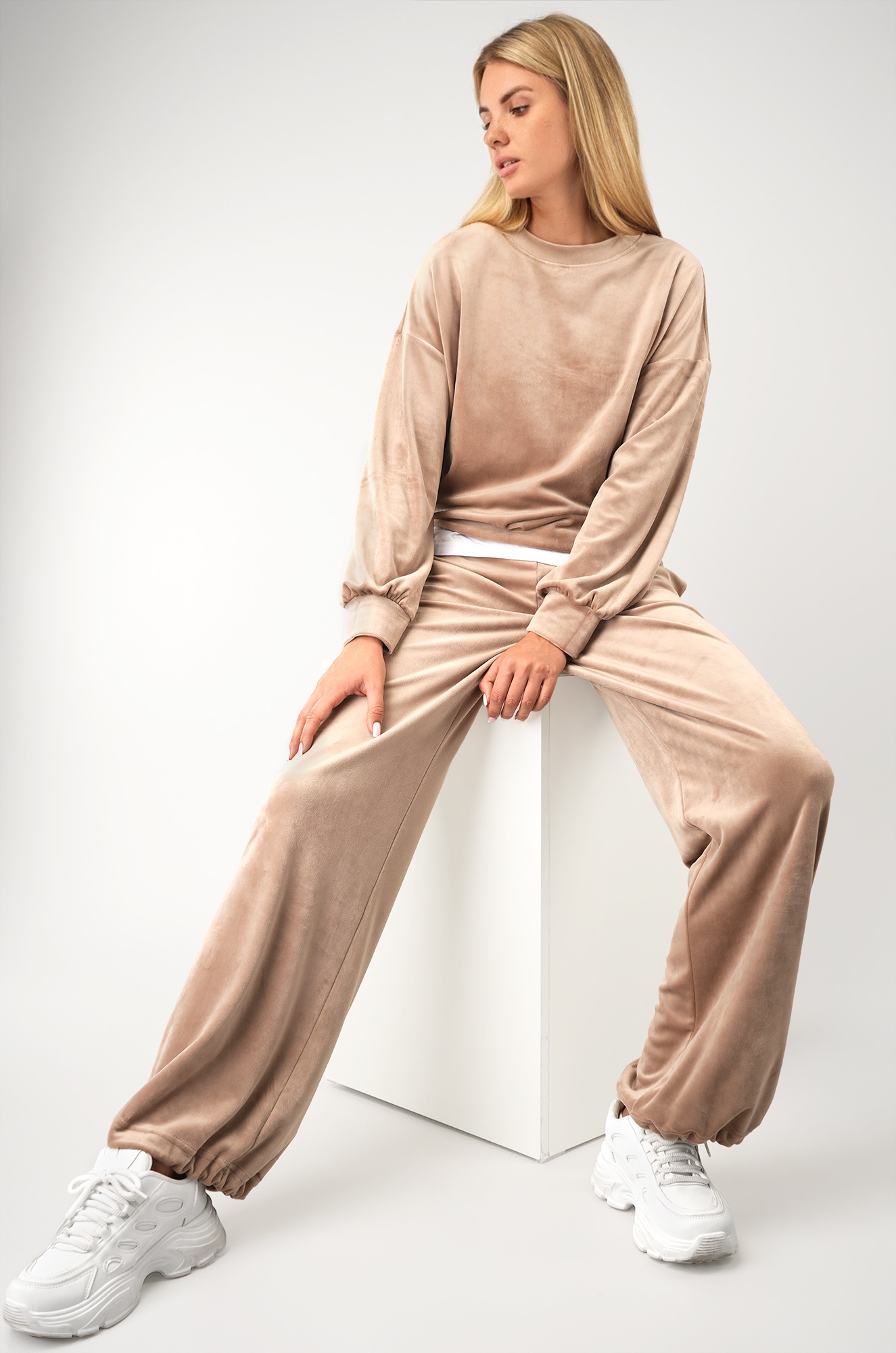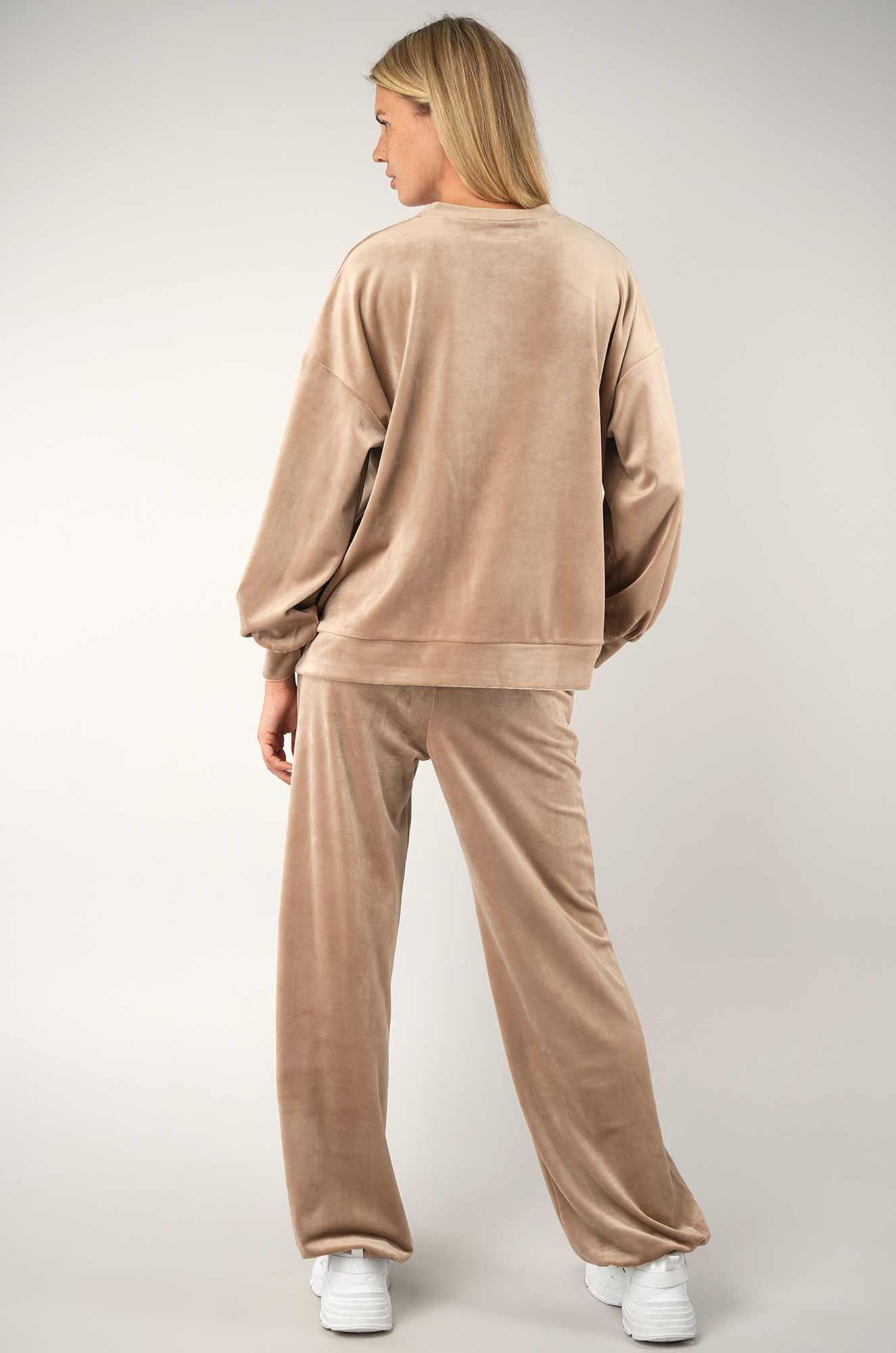 Повседневный велюровый костюм с брюками имеет свободный прямой крой и удобен для дома и прогулок. Бархатный костюм подойдет для путешествий и домашнего уюта.