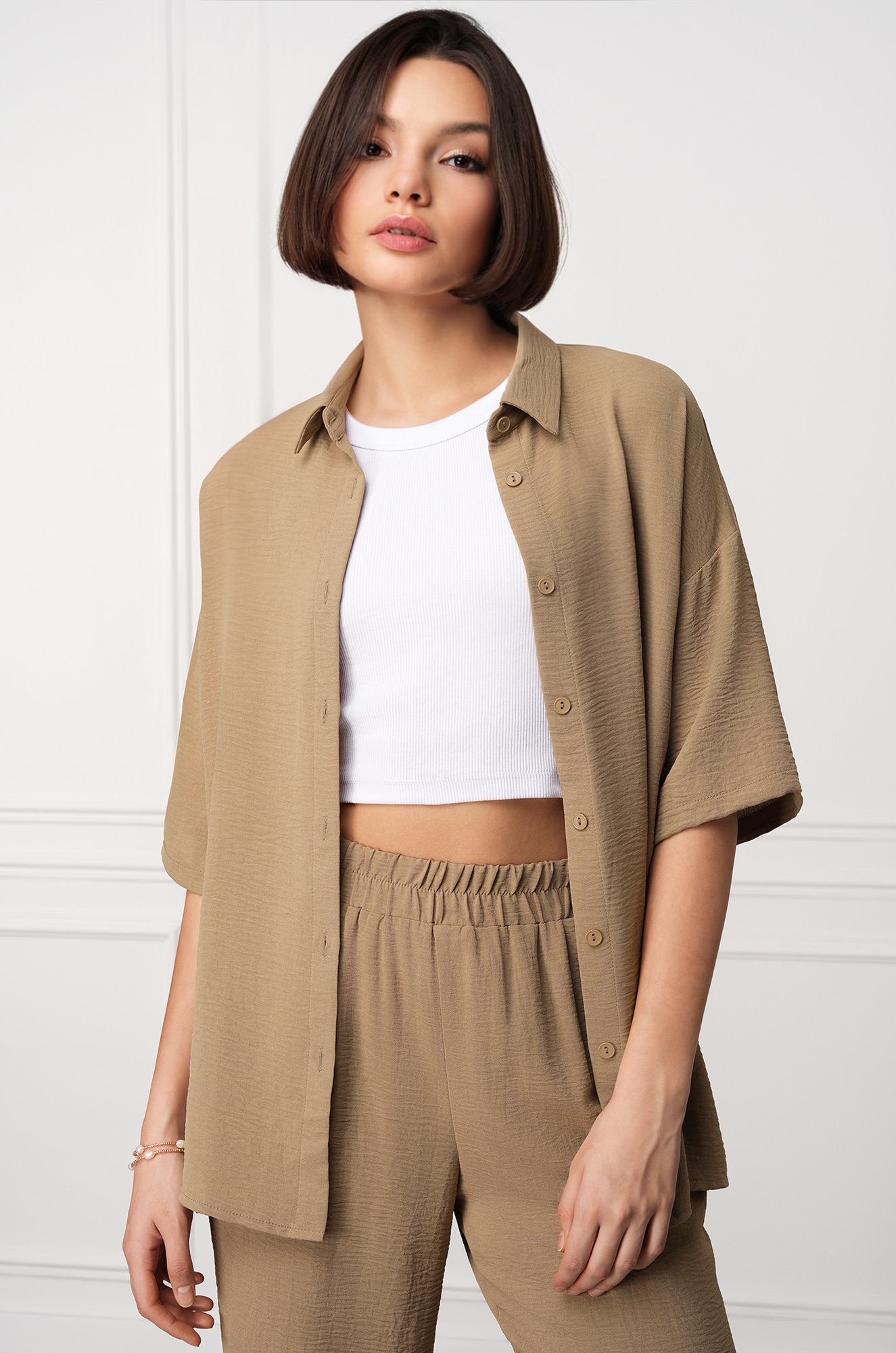 Легкий женский костюм с брюками и рубашкой оверсайз — простое и красивое решение на лето. Модель выполнена из фактурной ткани жатка, которая не мнётся и создает мягкий и свободный силуэт. Брючный костюм бежевого цвета сочетает комфорт и элегантность, позволяя чувствовать себя уверенно в любой ситуации.