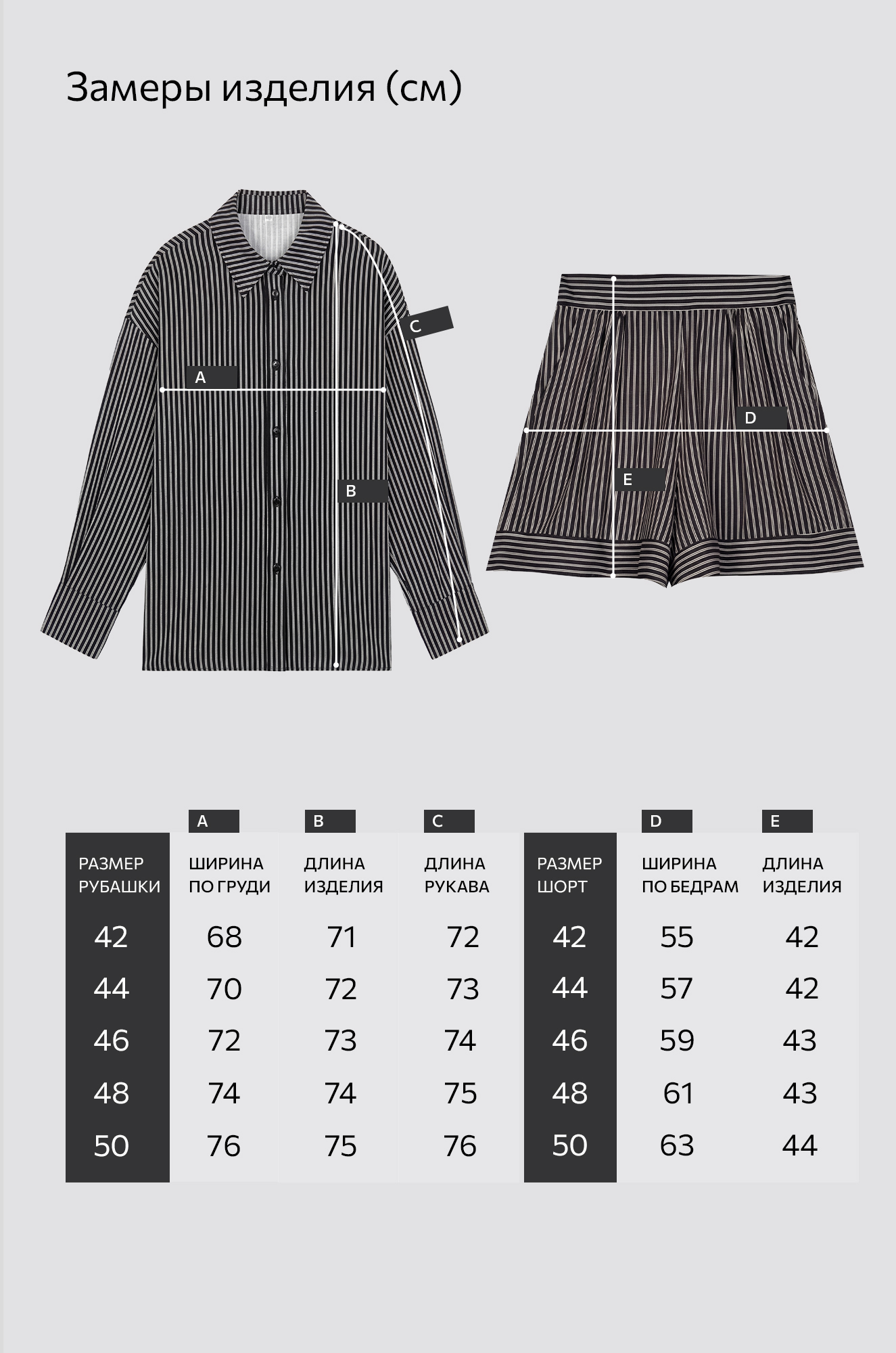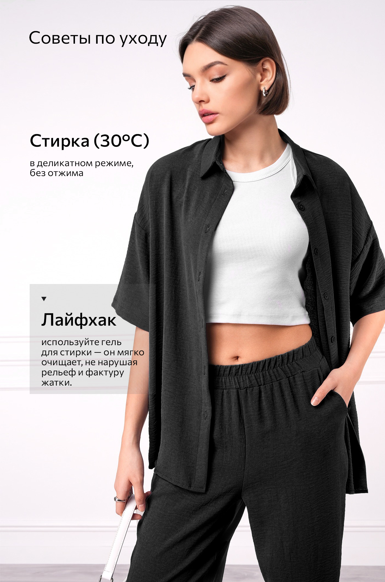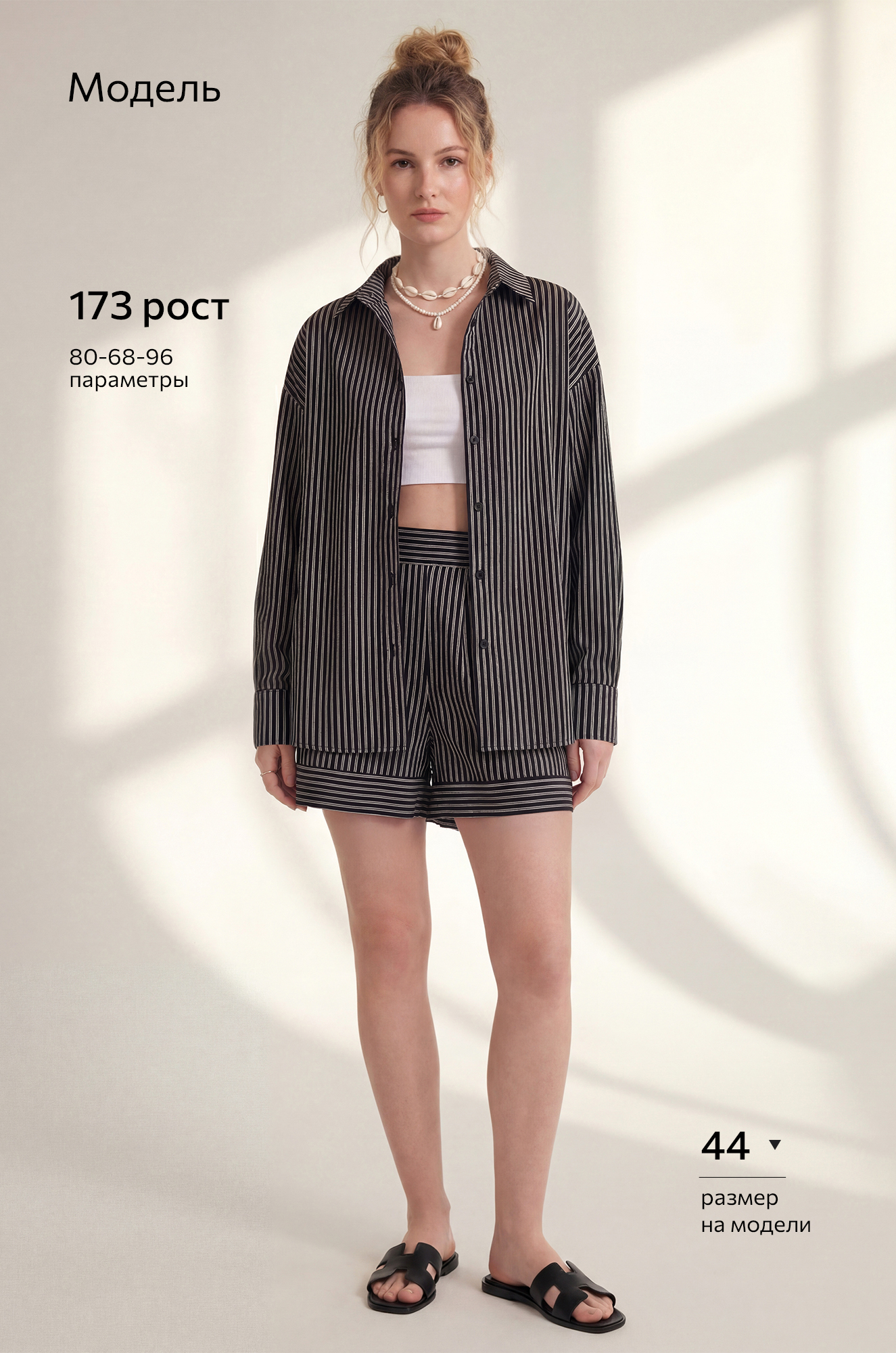 Женский костюм с шортами и рубашкой создан для тех, кто любит выглядеть стильно и с комфортом. Рубашка свободного прямого кроя со спущенным плечом и отложным воротником дополнена длинным рукавом на манжетах, а шорты с высокой посадкой и мягкой резинкой сзади выигрышно подчёркивают силуэт. Боковые карманы, застежка на молнию и аккуратные складки спереди добавляют образу индивидуальности.