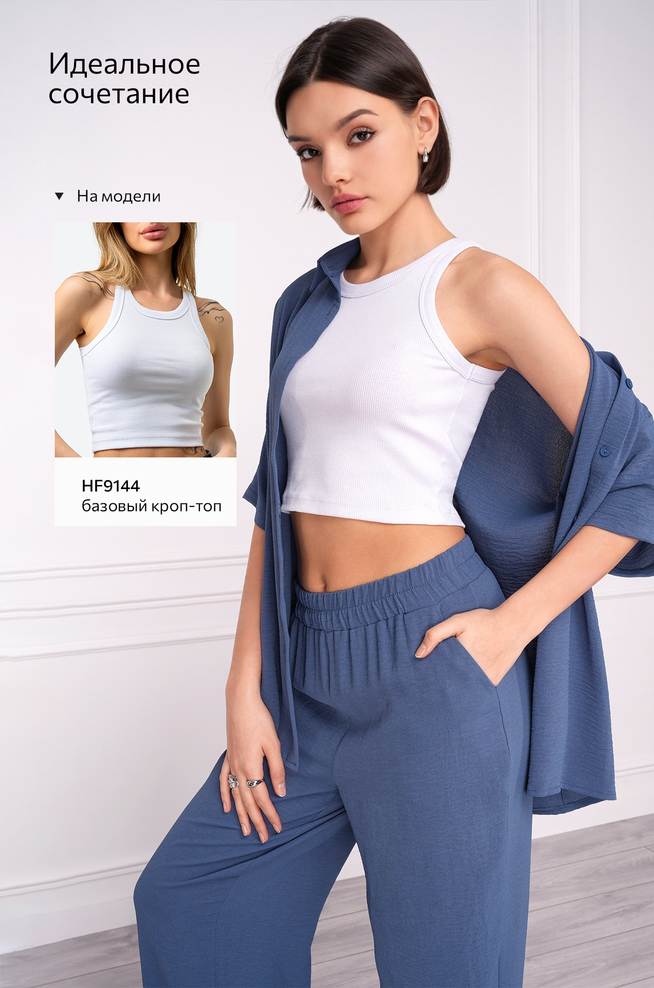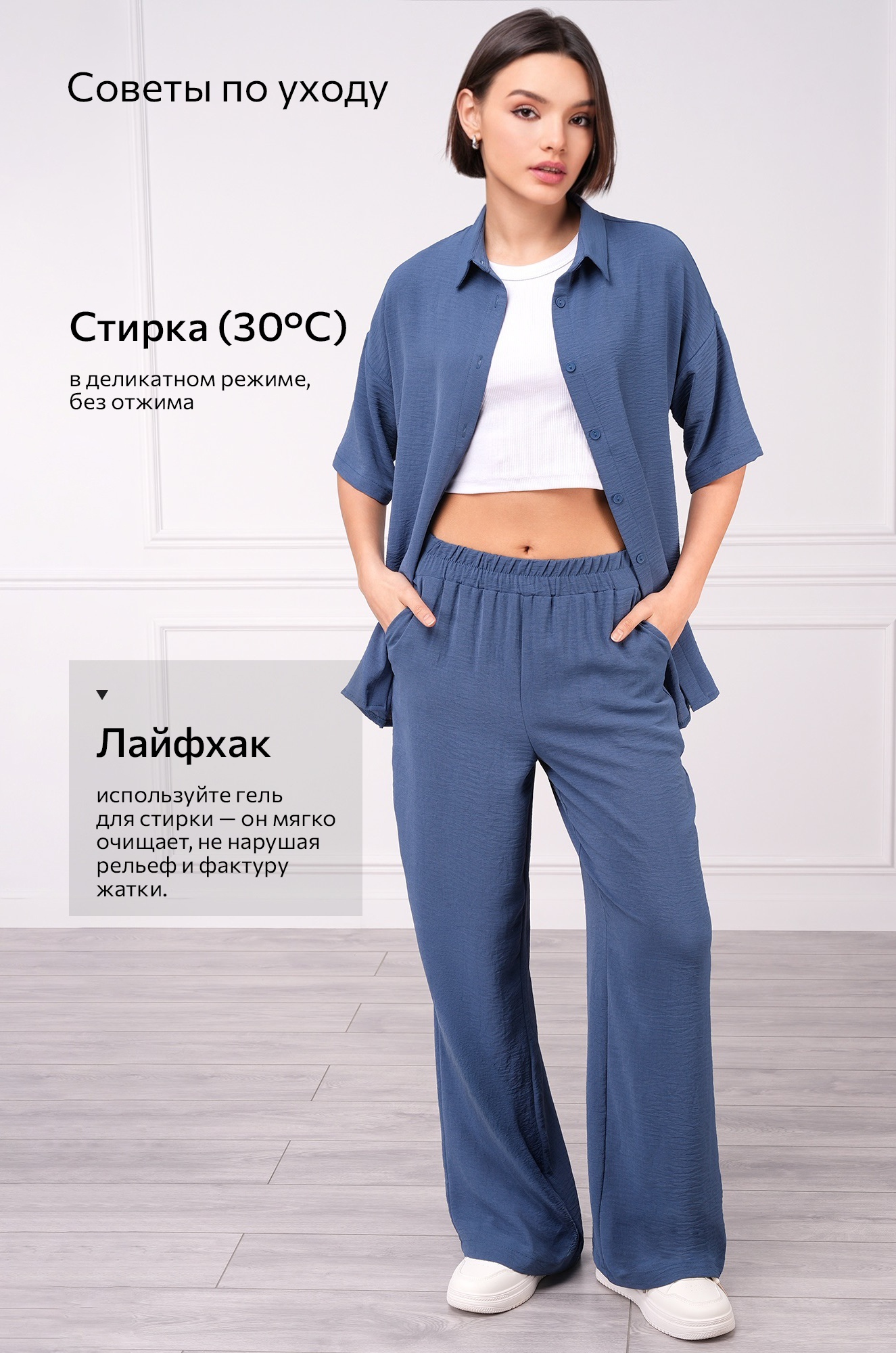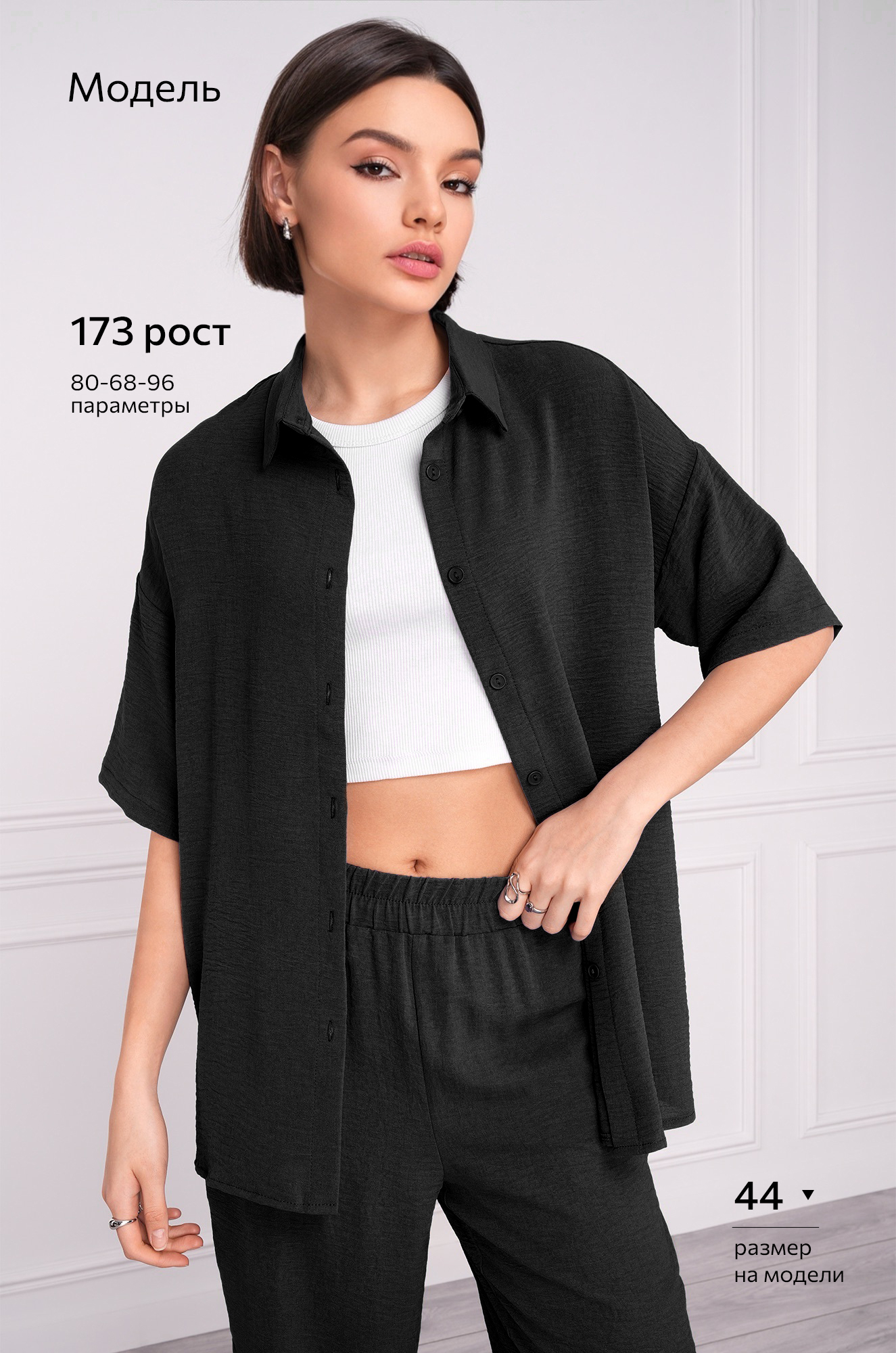 Женский костюм с шортами и рубашкой создан для тех, кто любит выглядеть стильно и с комфортом. Рубашка свободного прямого кроя со спущенным плечом и отложным воротником дополнена длинным рукавом на манжетах, а шорты с высокой посадкой и мягкой резинкой сзади выигрышно подчёркивают силуэт. Боковые карманы, застежка на молнию и аккуратные складки спереди добавляют образу индивидуальности.