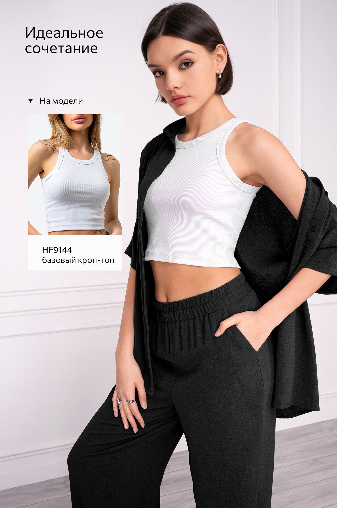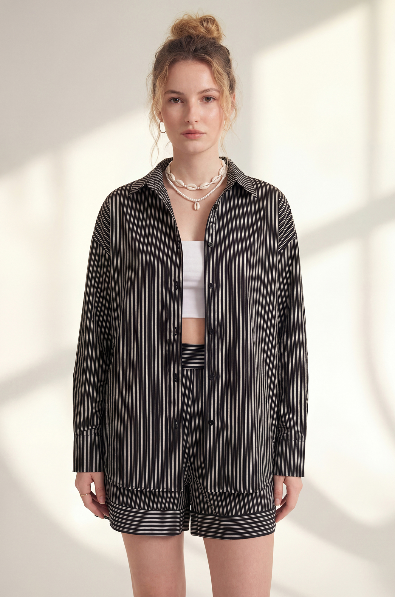 Черный полосатый костюм двойка — отличный выбор для женщин: в нём одинаково хорошо и на пляжный променад, и на повседневные встречи в городе, ведь лето подходит для таких легких и элегантных образов.