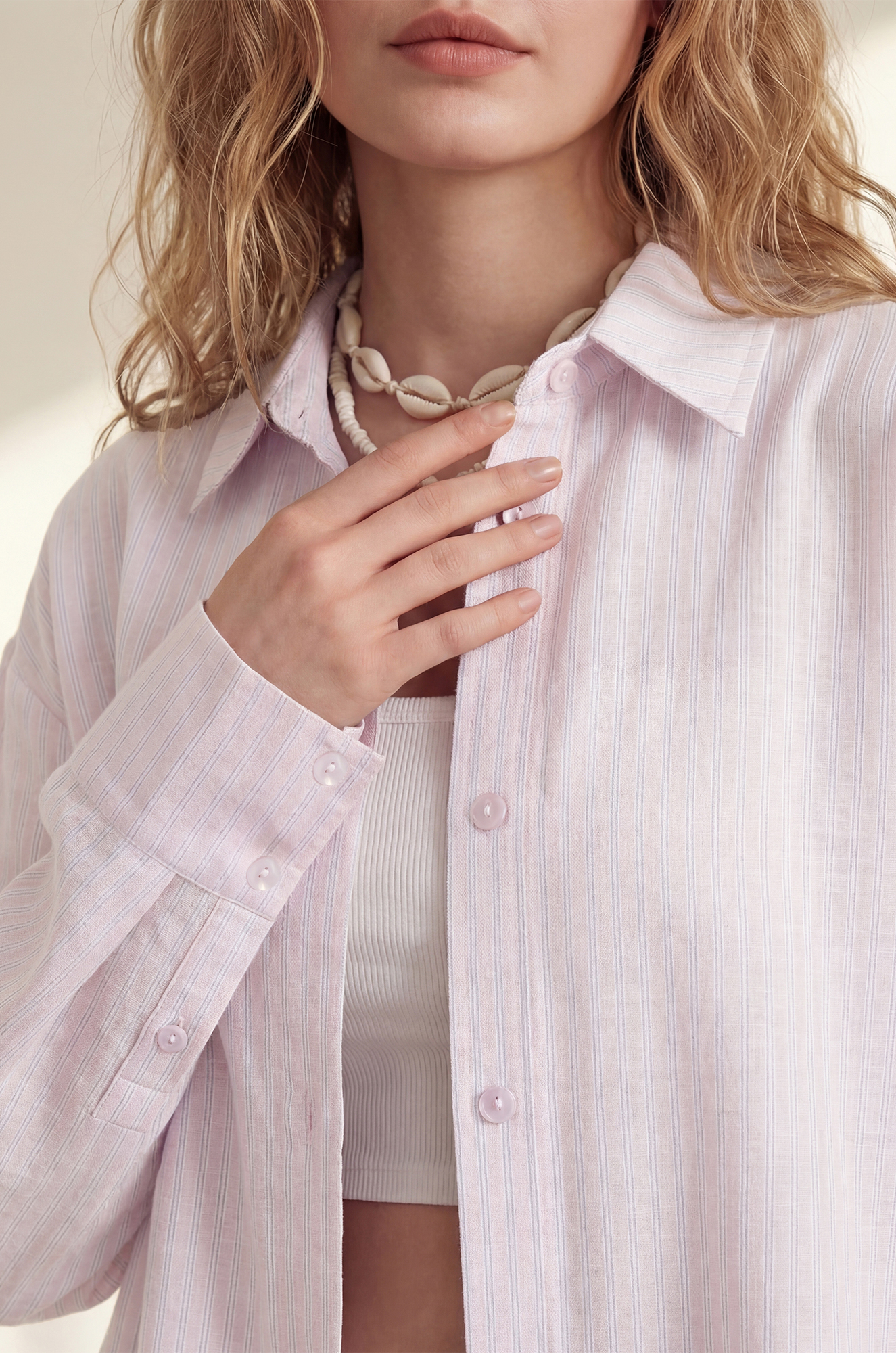 — универсальный молочный цвет в тонкую вертикальную полоску стройнит и легко комбинируется с любимыми аксессуарами;