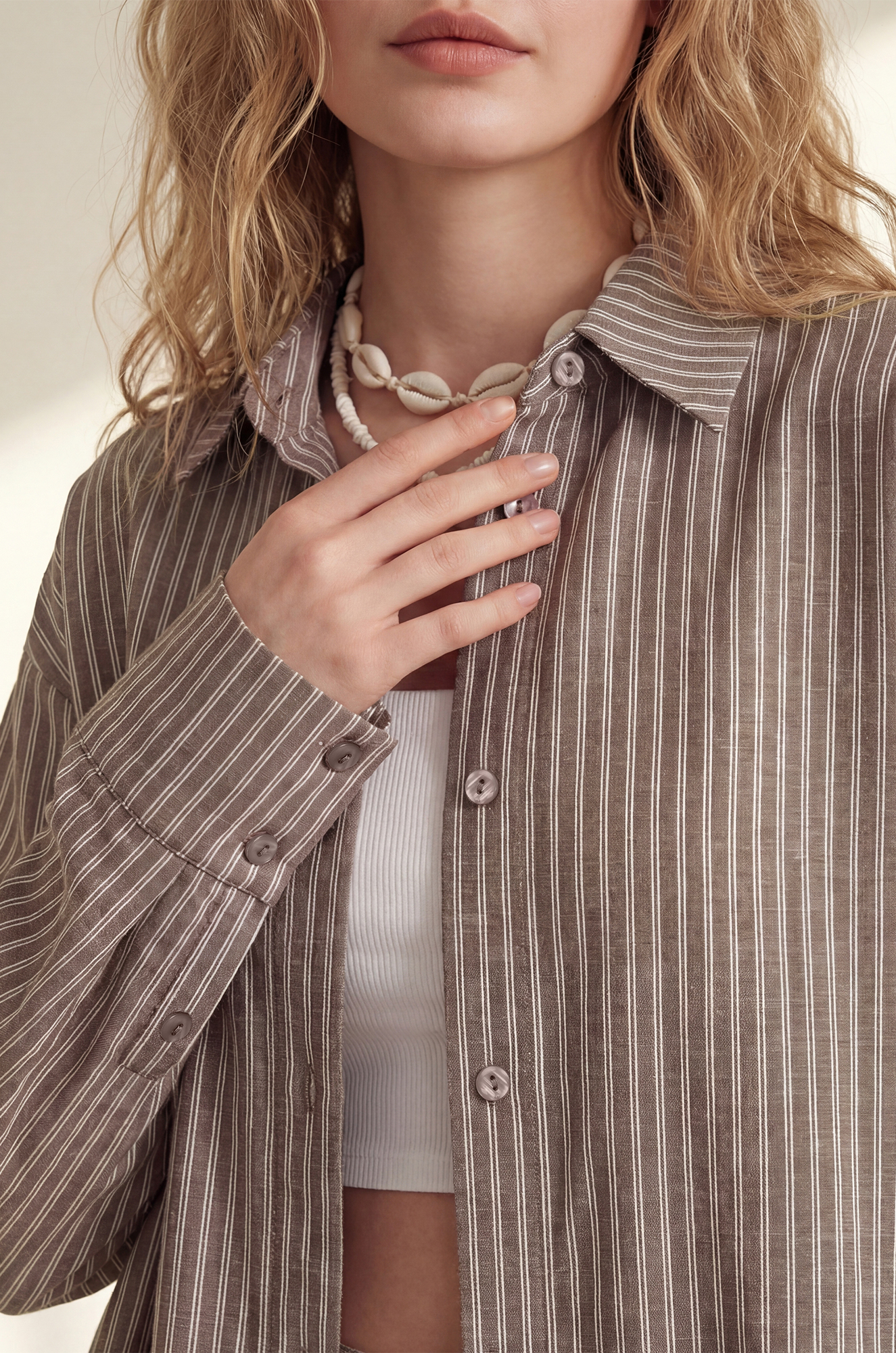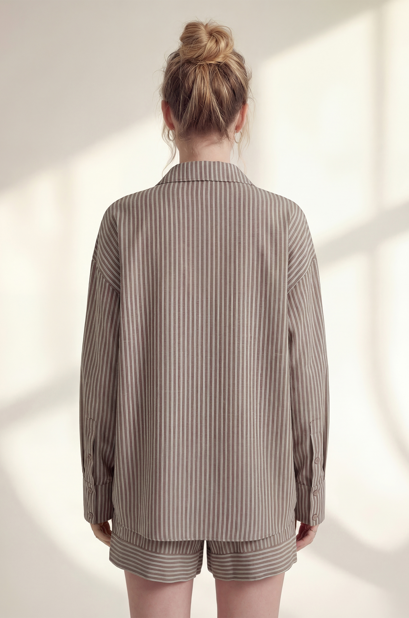 — универсальный цвет мокко в тонкую вертикальную полоску стройнит и легко комбинируется с любимыми аксессуарами;