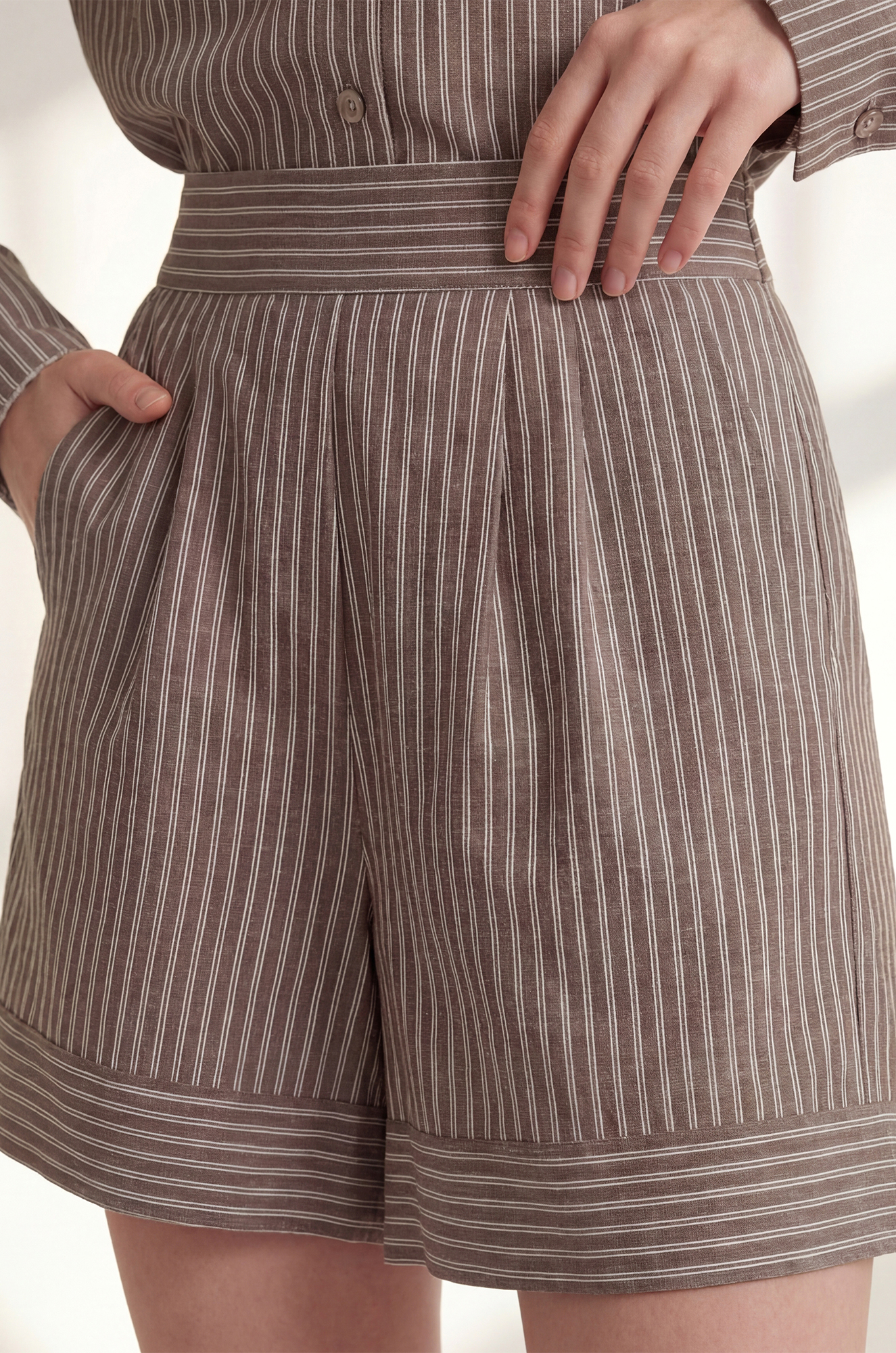 Коричневый полосатый костюм двойка — отличный выбор для женщин: в нём одинаково хорошо и на пляжный променад, и на повседневные встречи в городе, ведь лето подходит для таких легких и элегантных образов.