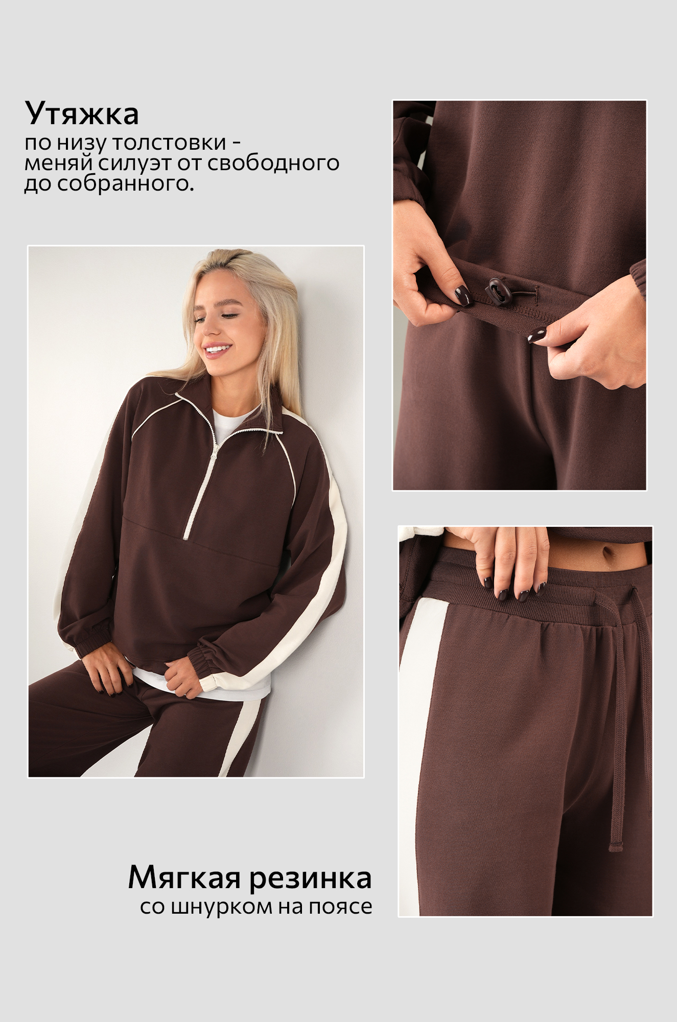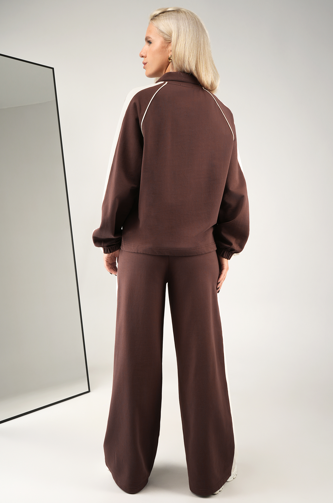 Коричневый женский костюм с контрастной отделкой выглядит стильно и элегантно. Свободная мастерка с молнией и воротником-стойкой регулируется по объему кулиской. Широкие брюки палаццо с поясом на резинке со шнурком.