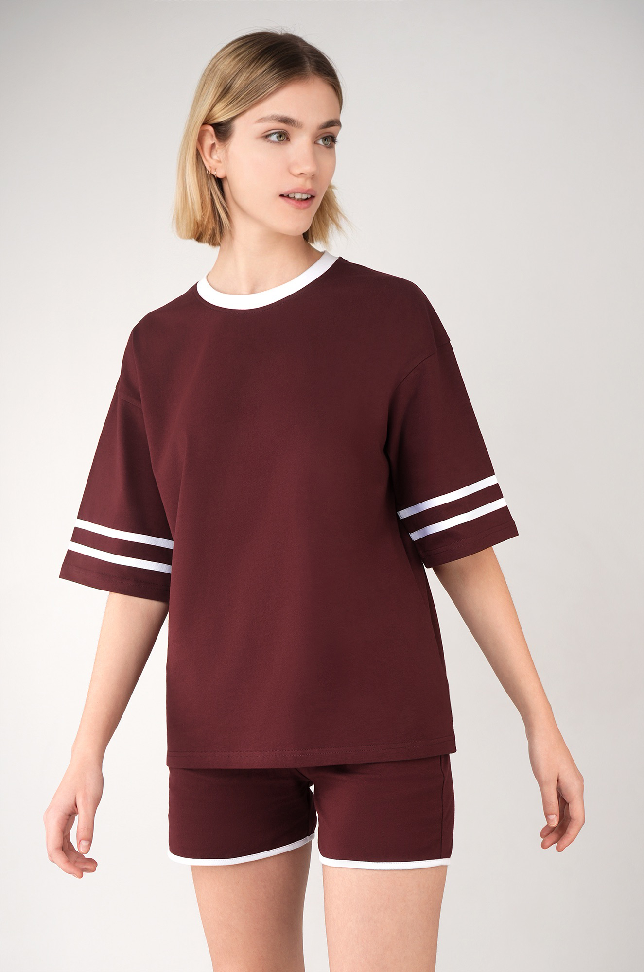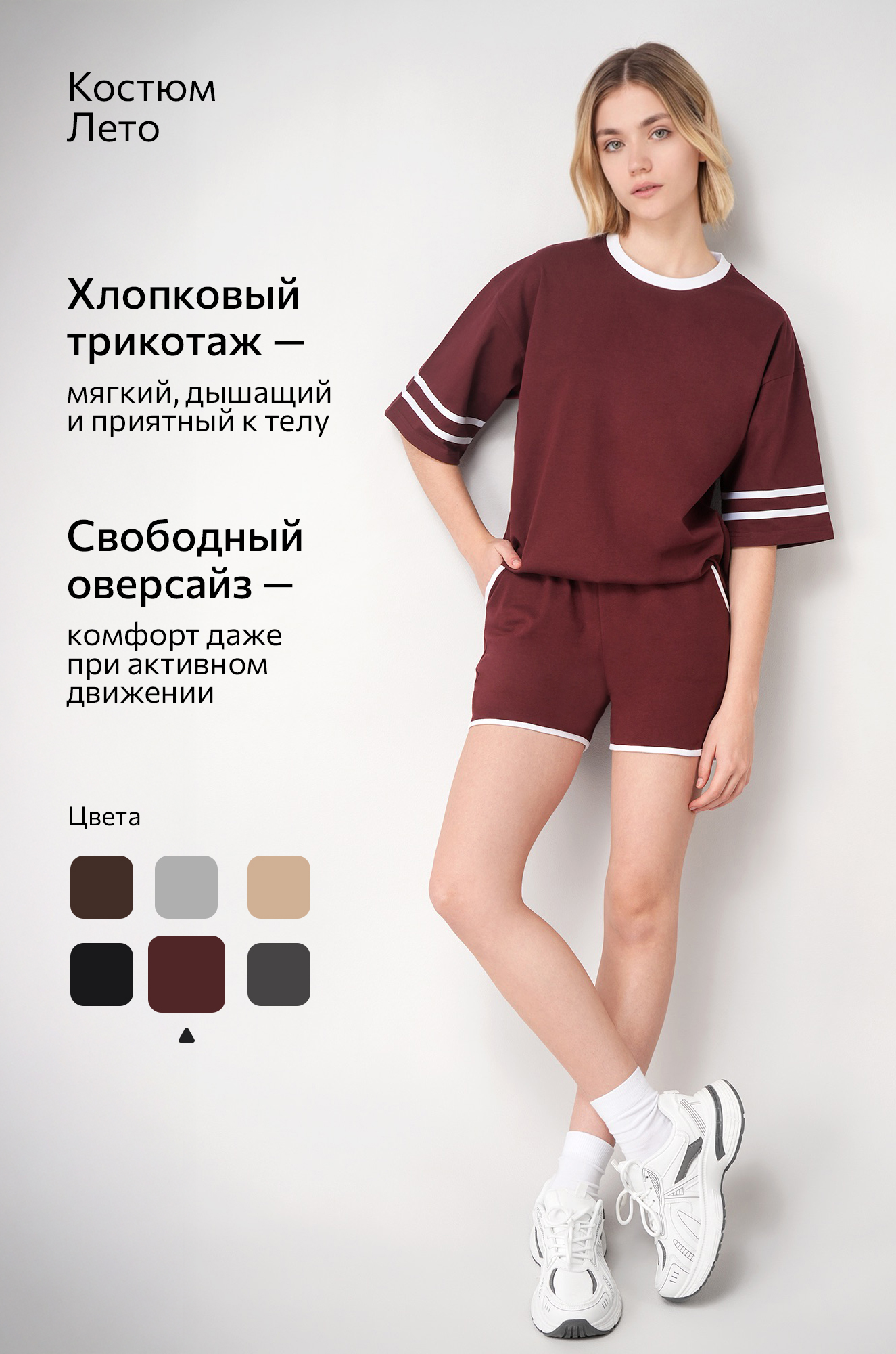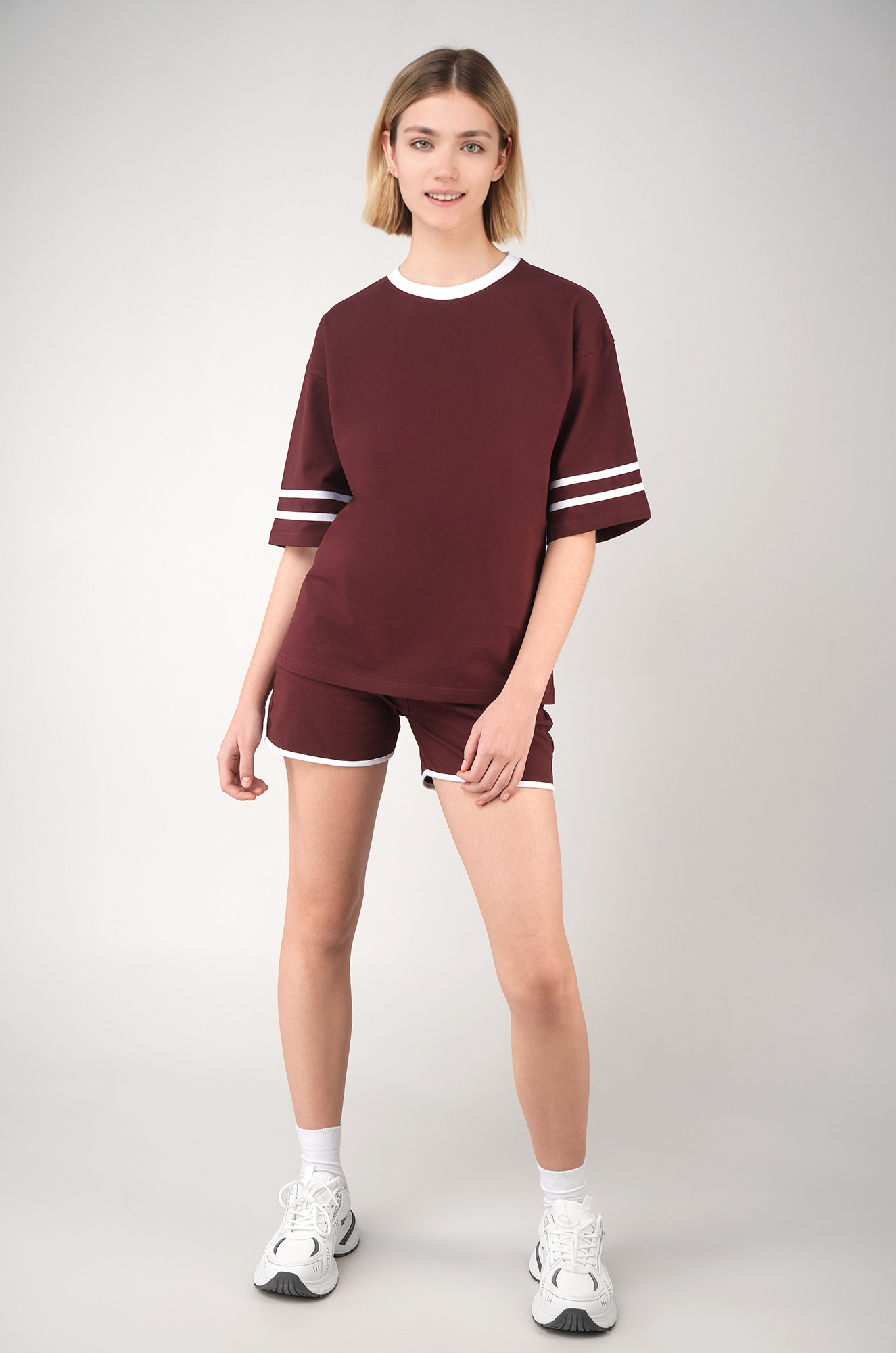 Женский костюм с шортами — стильный и удобный вариант для активного образа жизни. Бордовый костюм двойка для девушек идеально подходит для тренировок, фитнеса, прогулок и повседневного отдыха.