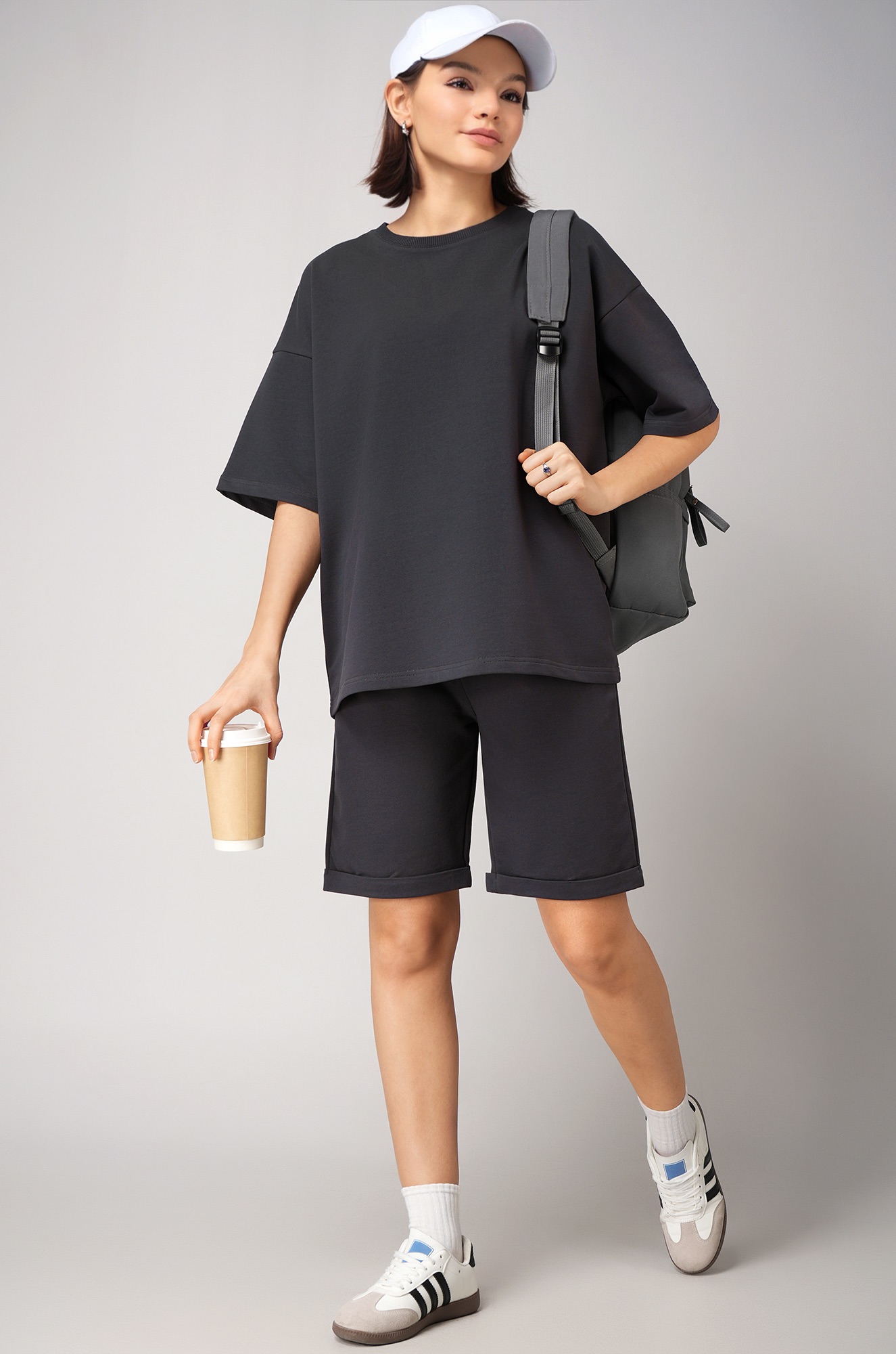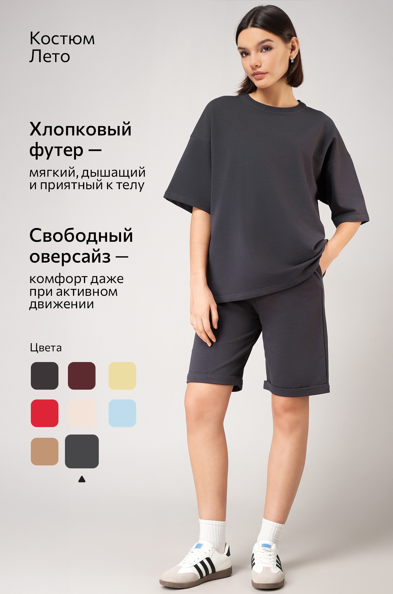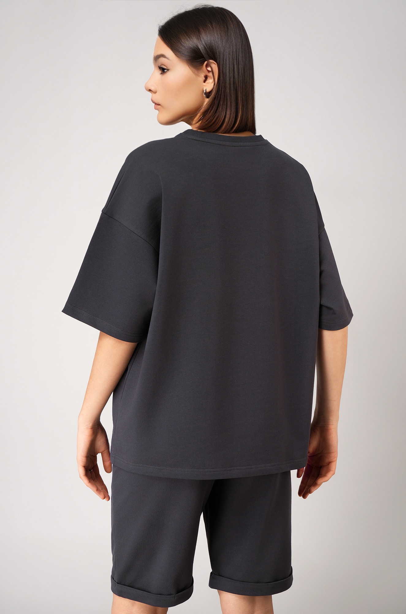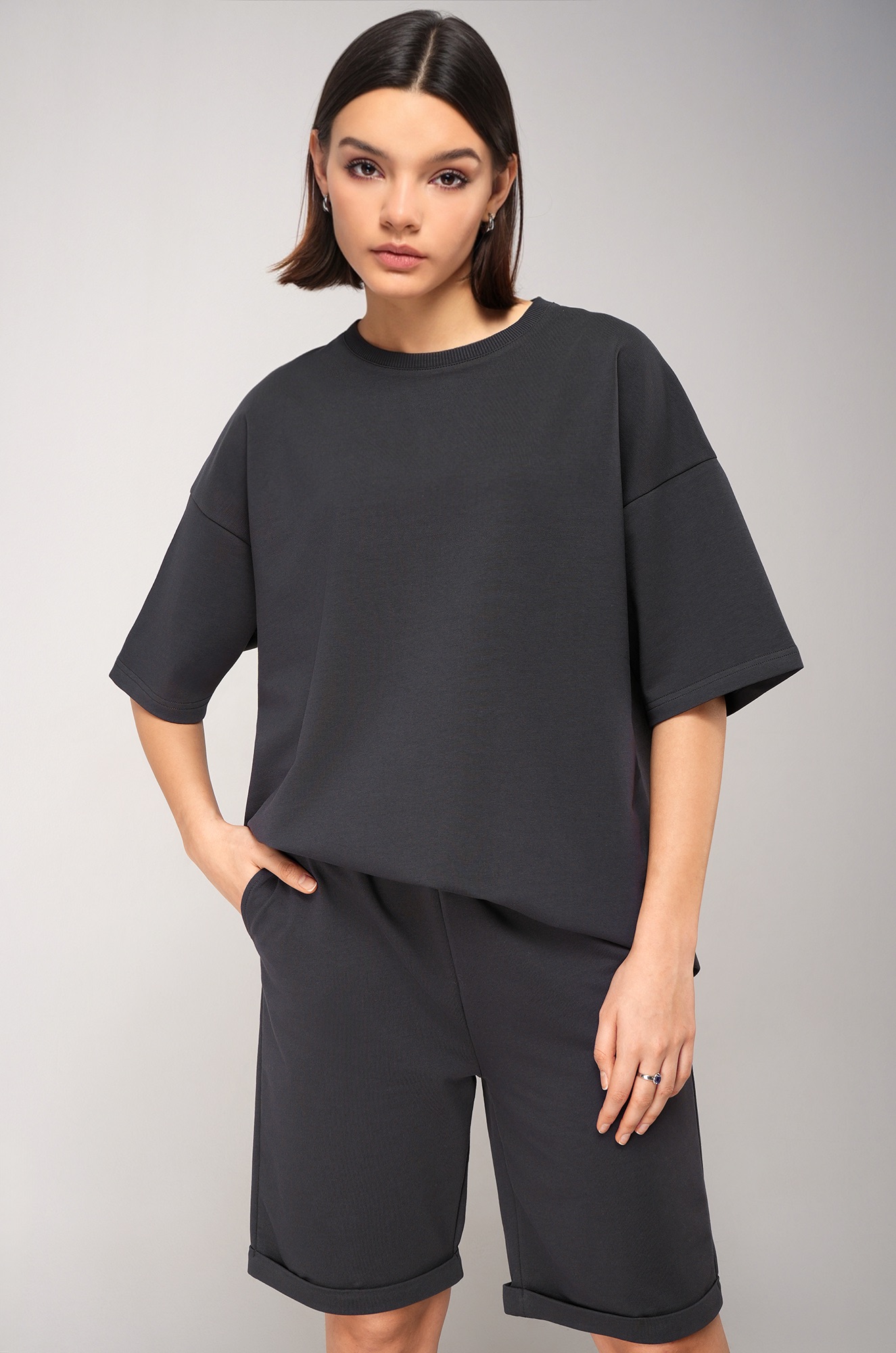 Женский костюм в сером цвете — воплощение сдержанного стиля и комфорта! Однотонный костюм оверсайз с удлиненной футболкой и практичными шортами дарит полную свободу движений. Летний комплект двойка выполнен из мягкого трикотажного футера с высоким содержанием хлопка.