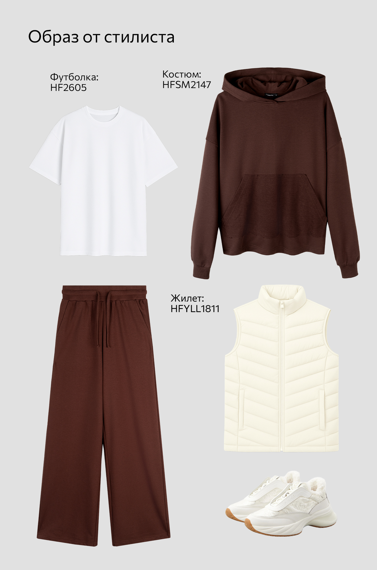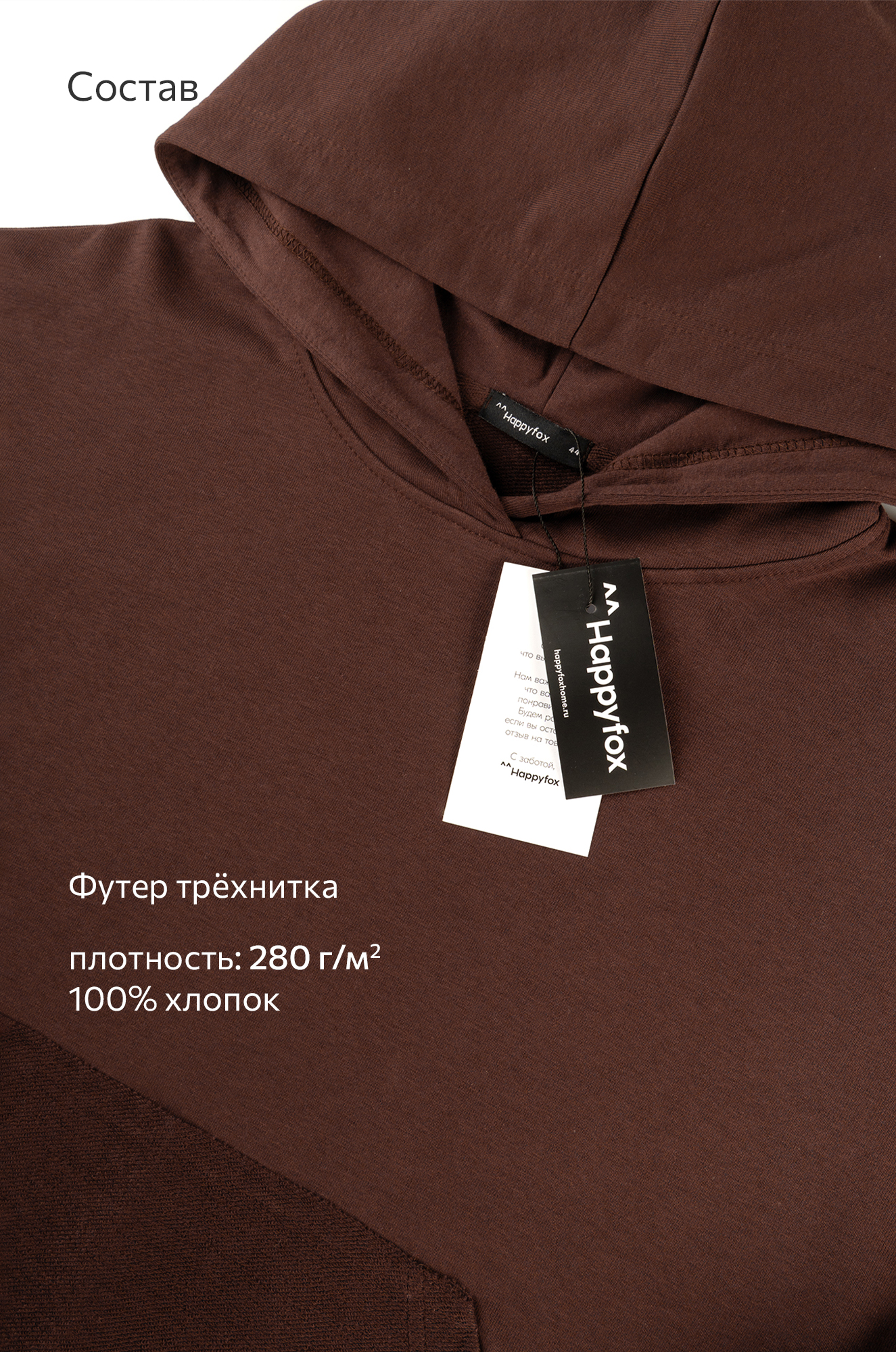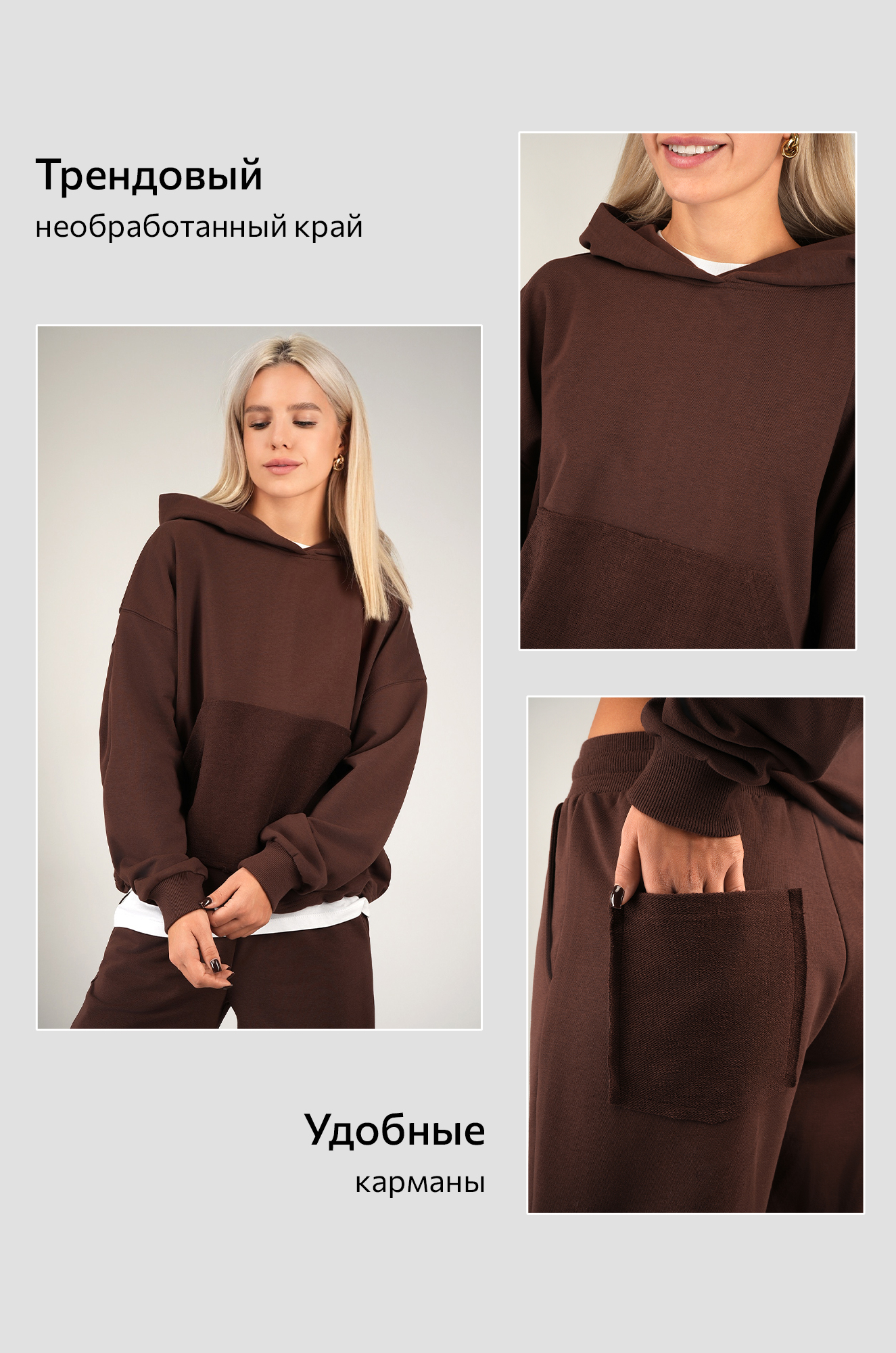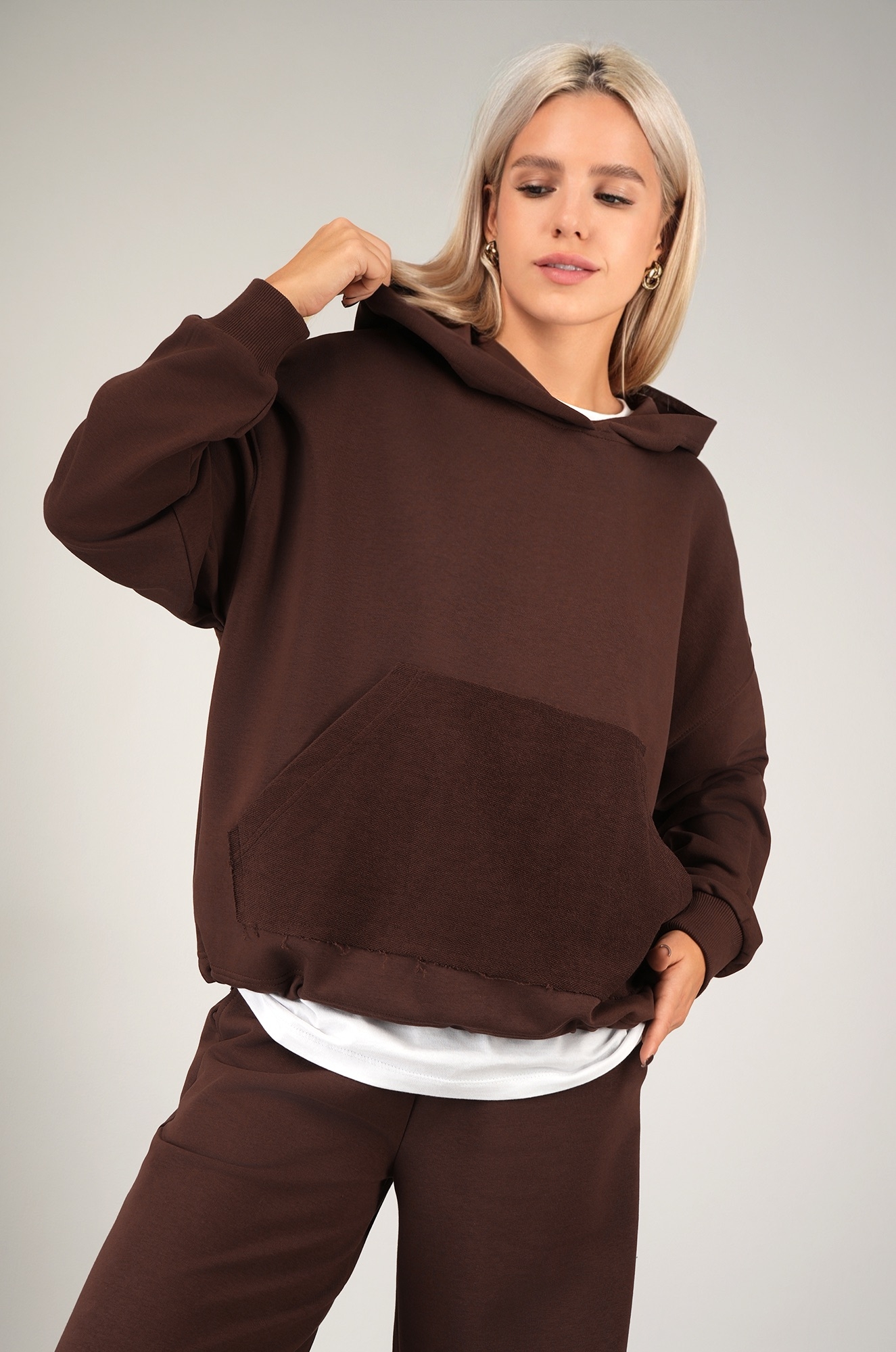 Теплый костюм в шоколадном цвете сразу создает ощущение комфорта. Худи оверсайз с глубоким капюшоном и кулиской по низу легко меняет силуэт — от свободного до более собранного. Удобный карман кенгуру добавляет комплекту практичности. Широкие брюки палаццо регулируются шнурком по талии. Штаны также утягиваются по низу, позволяя играть с формой.