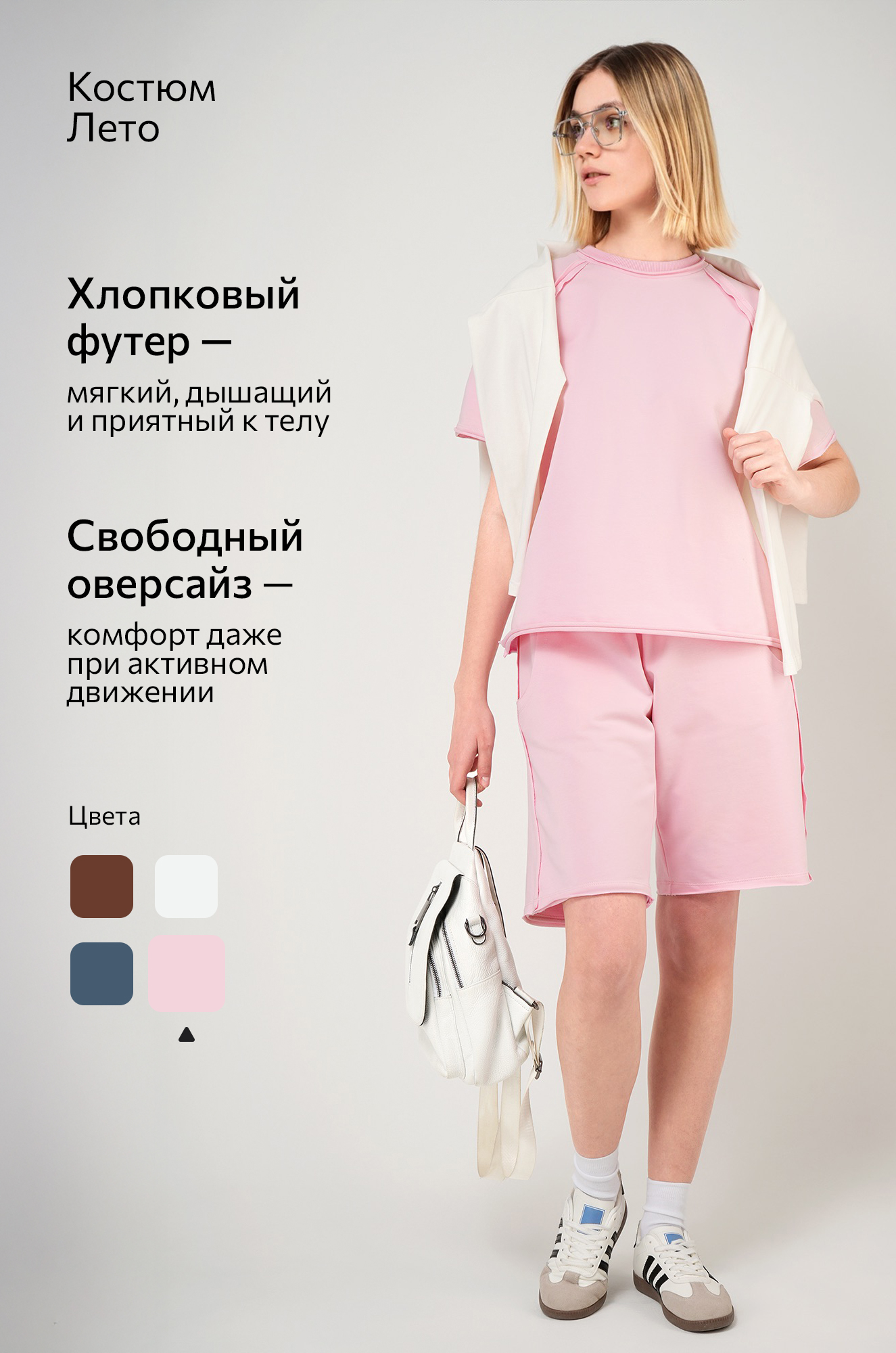 — костюм оверсайз выполнен из хлопка с добавлением эластана, натуральная ткань дышит и обеспечивает комфорт в течение дня;