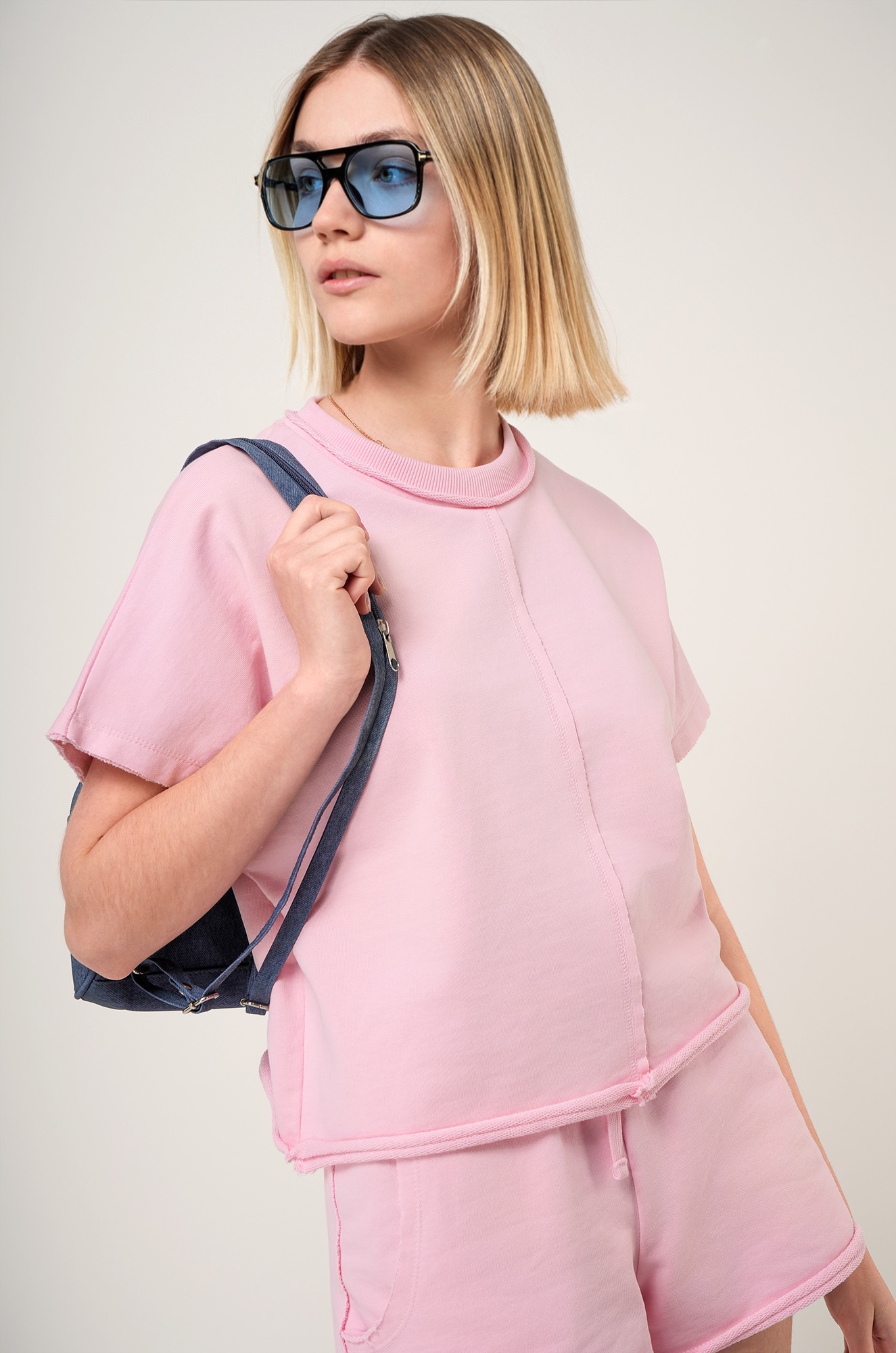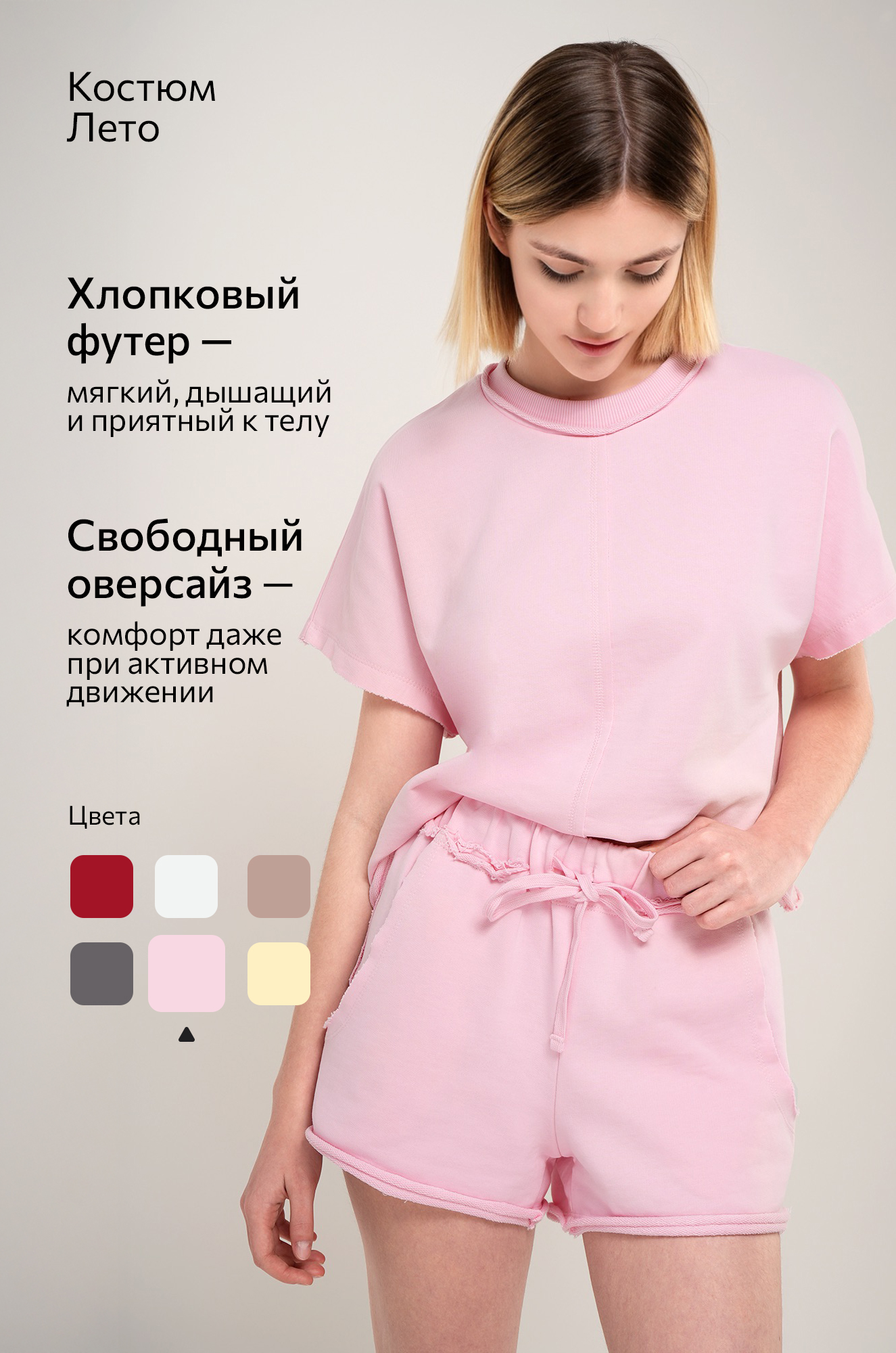 — костюм оверсайз выполнен из хлопка с добавлением эластана, натуральная ткань дышит и обеспечивает комфорт в течение дня;