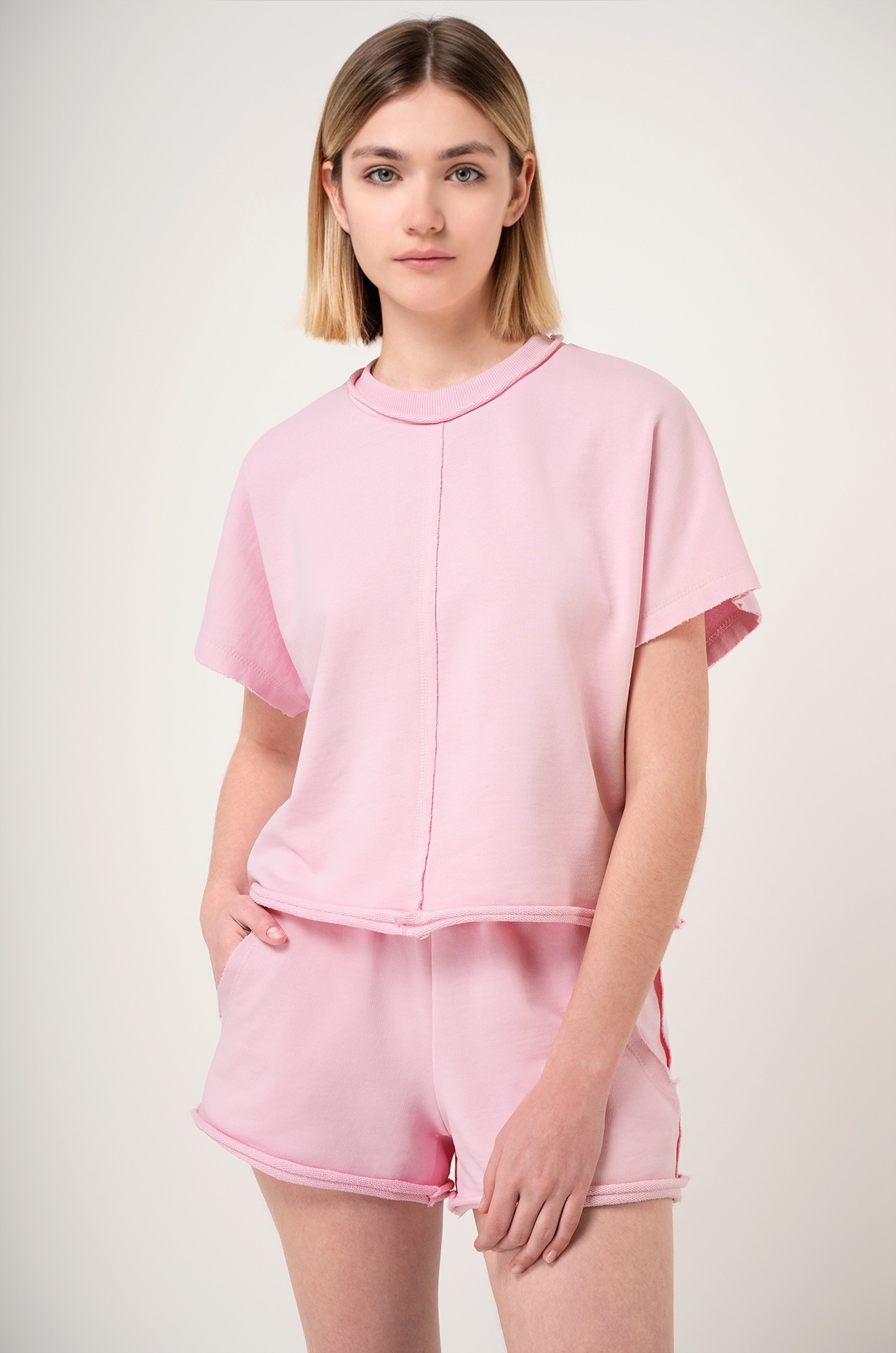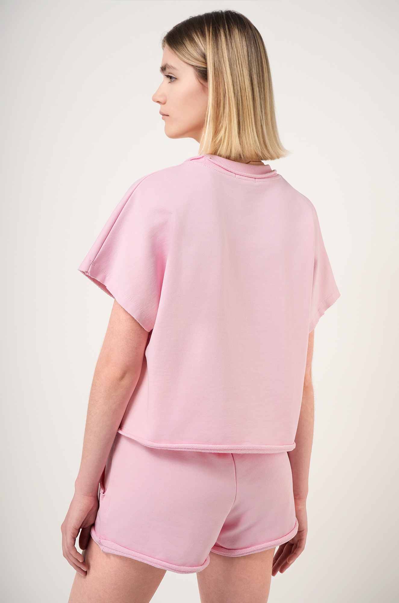 Женский спортивный костюм с шортами — комфортное и стильное решение для активного отдыха. Однотонный розовый костюм сочетает практичность, актуальный крой и приятный к телу трикотаж.