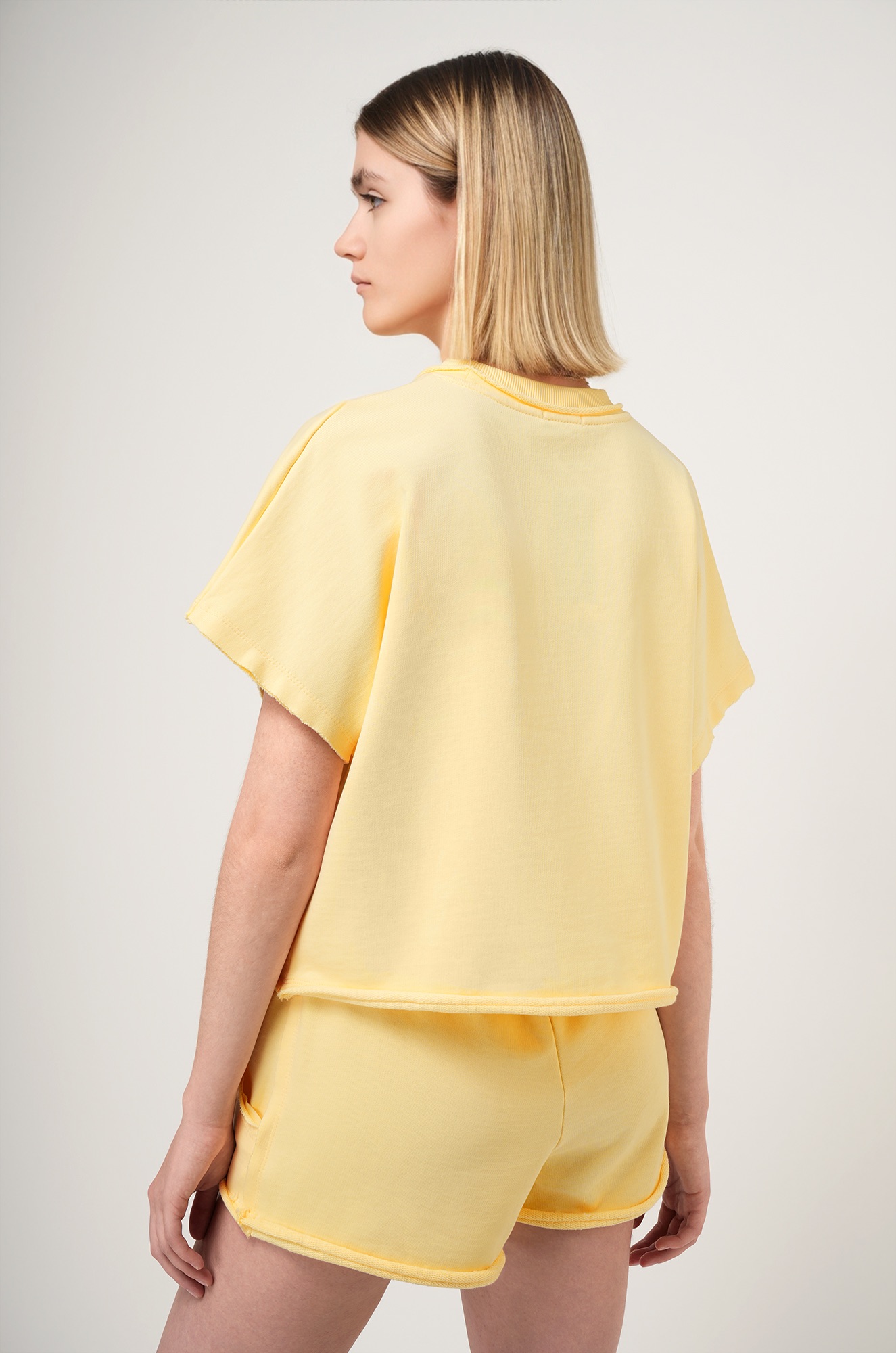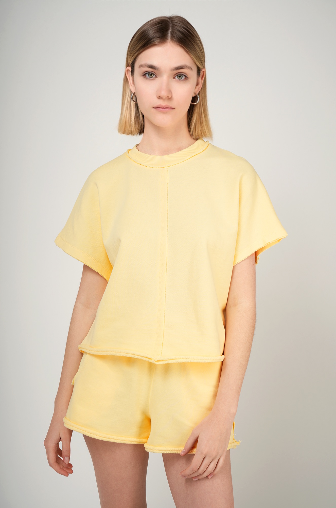 Женский спортивный костюм с шортами — комфортное и стильное решение для активного отдыха. Однотонный желтый костюм сочетает практичность, актуальный крой и приятный к телу трикотаж.