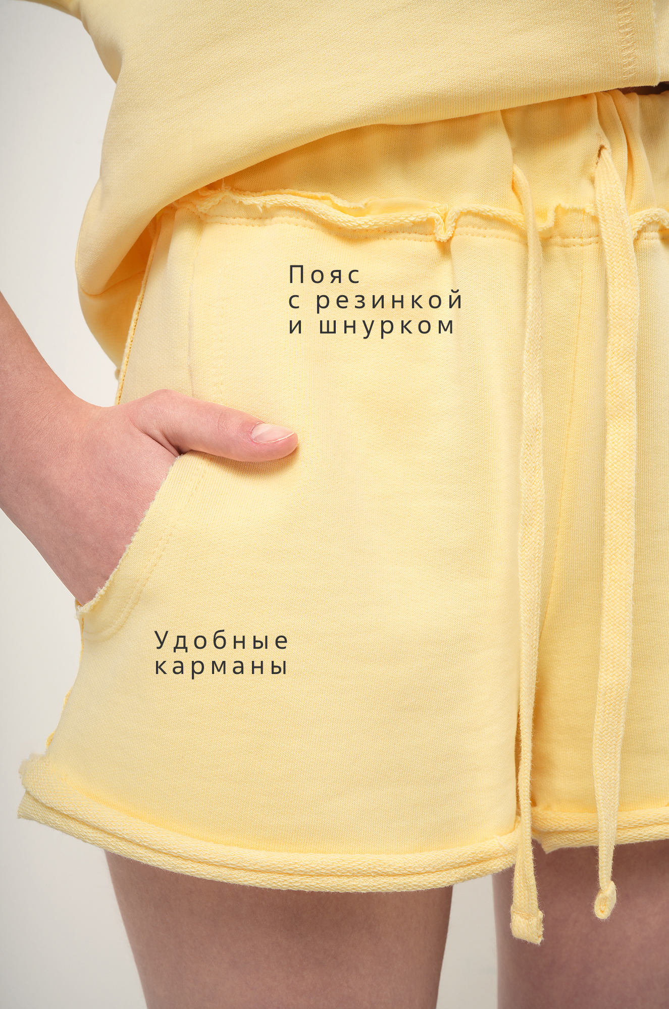 — короткие шорты с эластичным поясом и шнурком обеспечивают комфортную посадку;