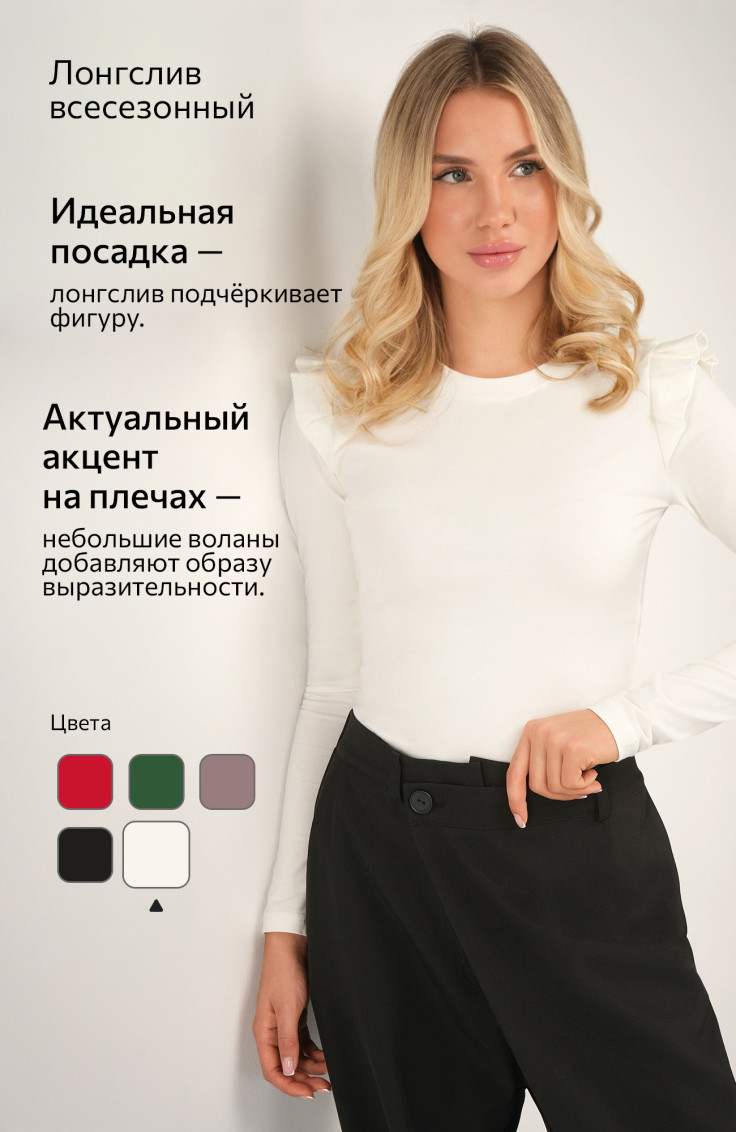 • Базовые лонгсливы — однотонные, с лаконичным кроем. Отлично сочетаются с джинсами, брюками и юбками — незаменимы для повседневных образов.