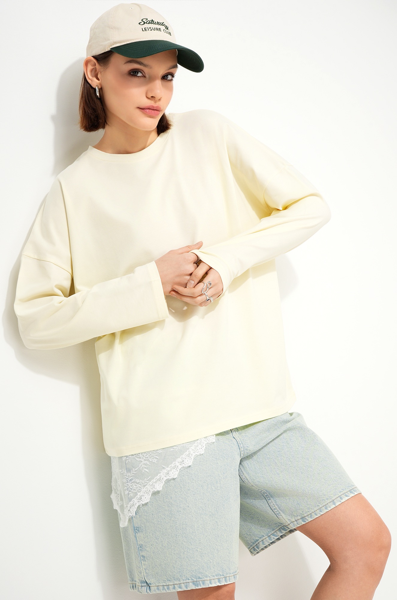 Однотонный лонг светло-желтого цвета смотрится стильно и сдержанно, а хлопковый трикотаж делает его невероятно приятным к телу. Демисезонный джемпер прямого кроя со спущенным плечом и круглым вырезом легко впишется в любой стиль.