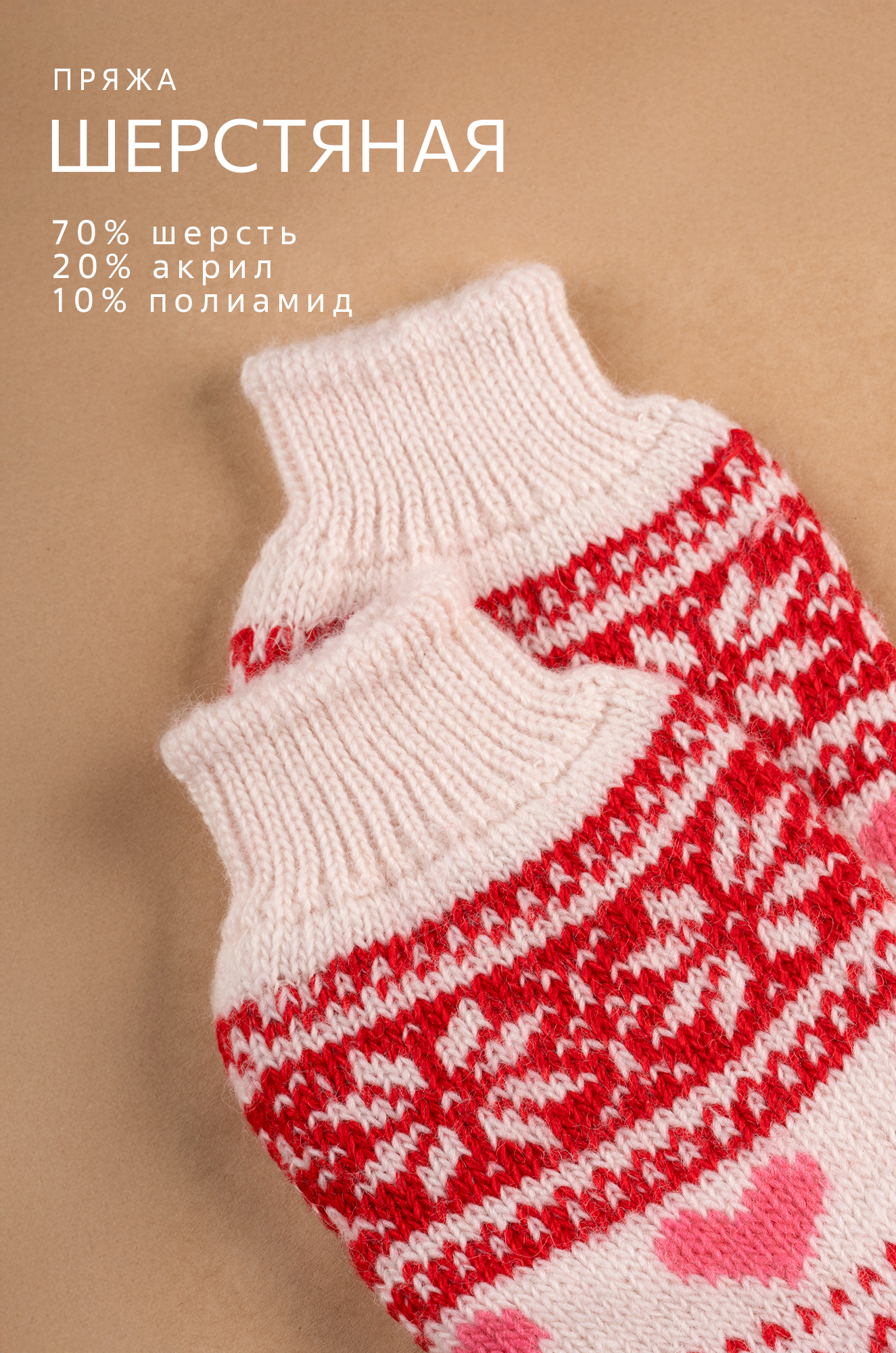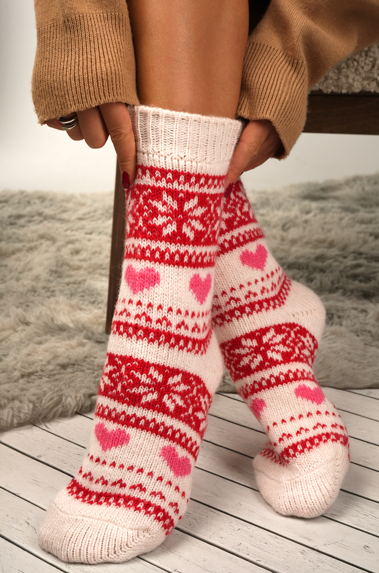 Уютные носочки для зимы! Красно-белые шерстяные носки с рисунком Снежинки и Сердечки подарят тепло и нежность в холодные дни. Высокие женские носки связаны из мягкой шерсти и отлично держат тепло.