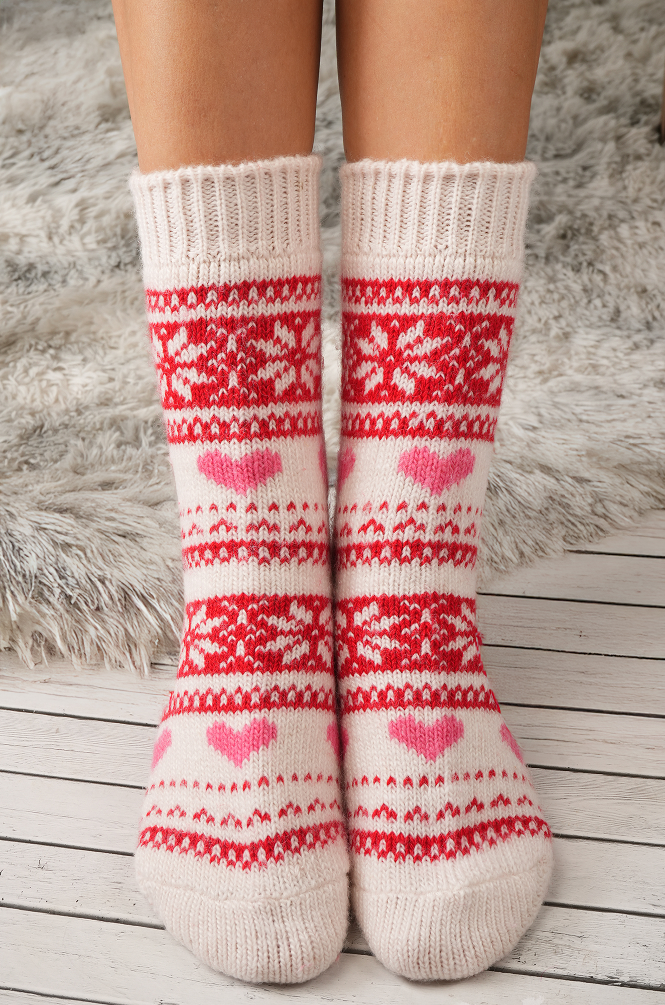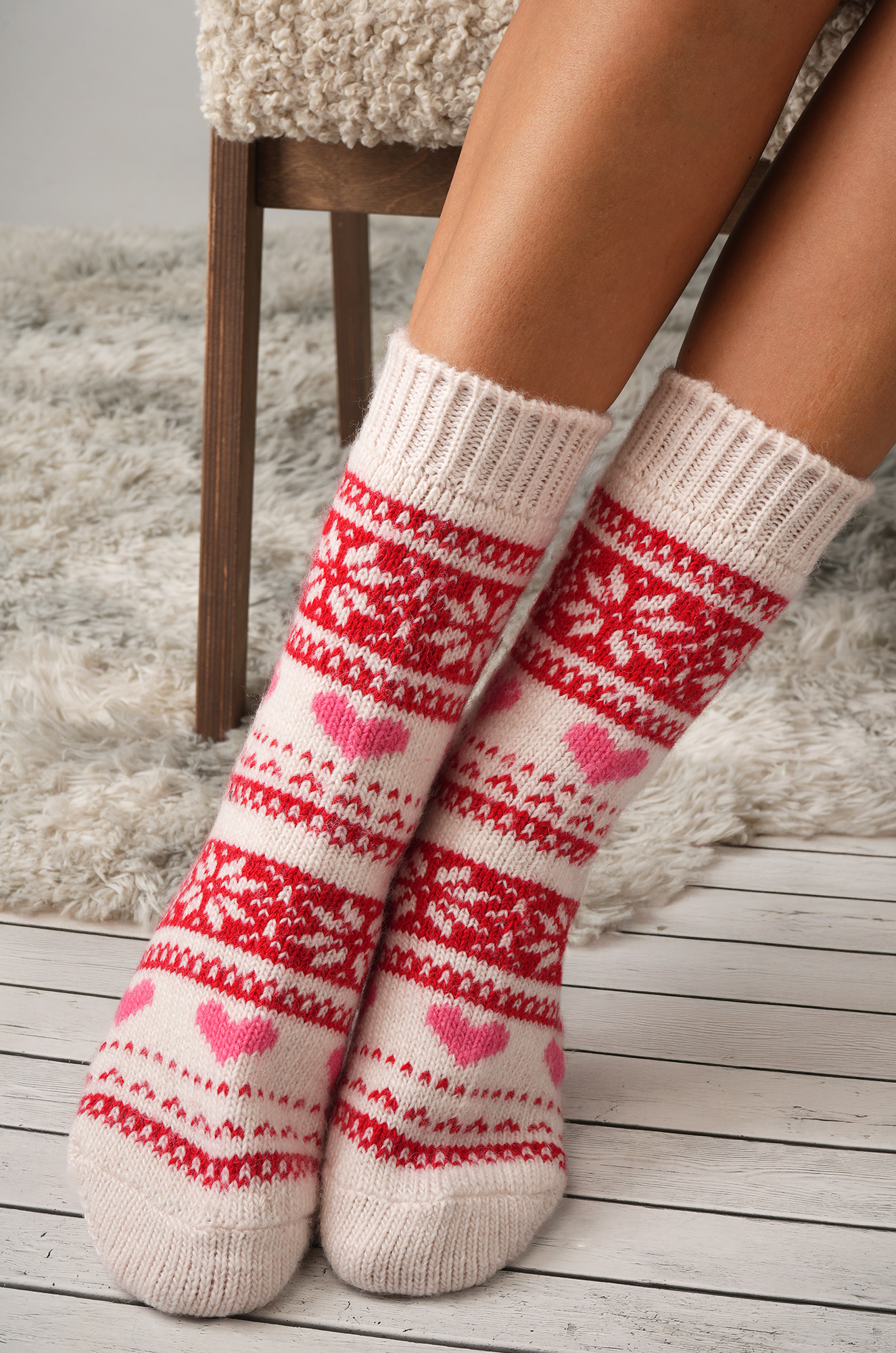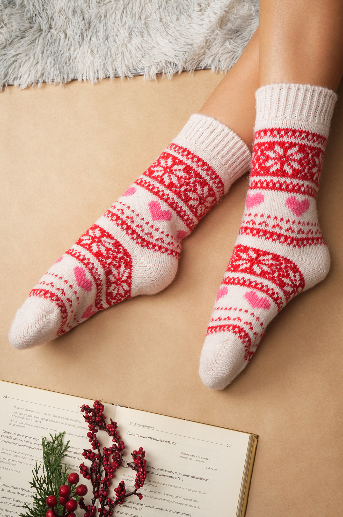 Теплые носки с орнаментом создадут праздничное настроение на Новый год и Рождество. Вязаные шерстяные носочки подойдут для женщин, которые хотят чувствовать себя уютно дома у камина или на прогулке в снежный день.