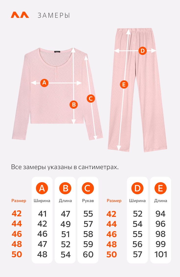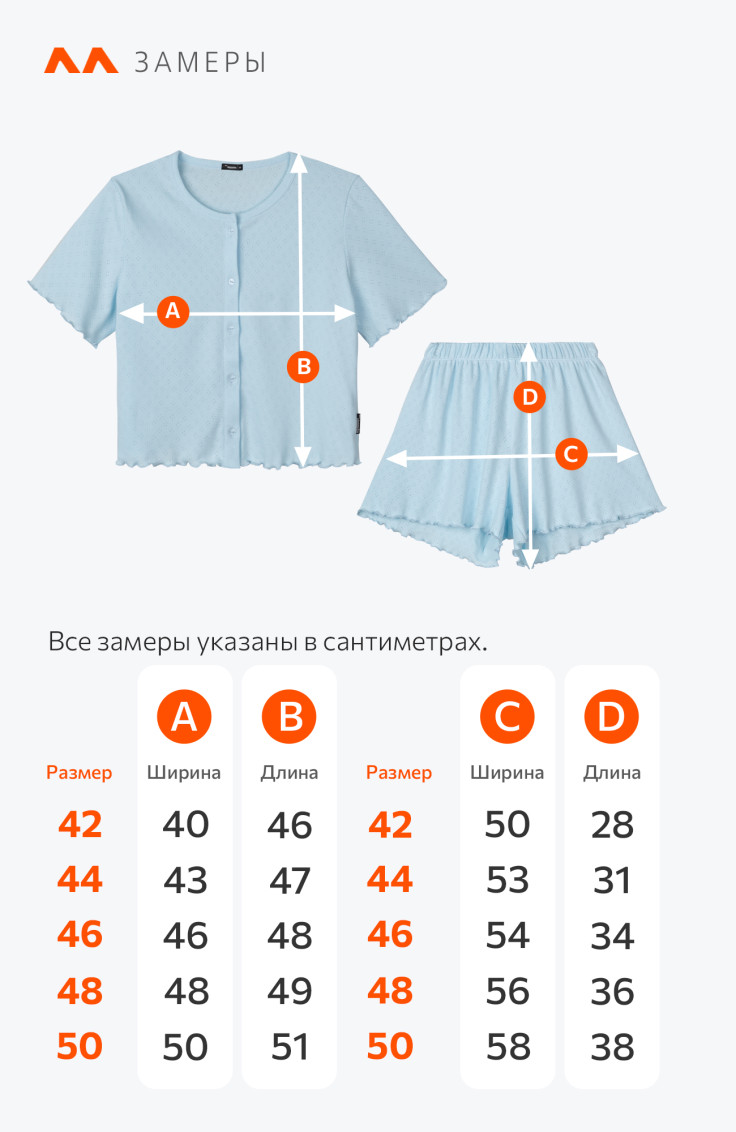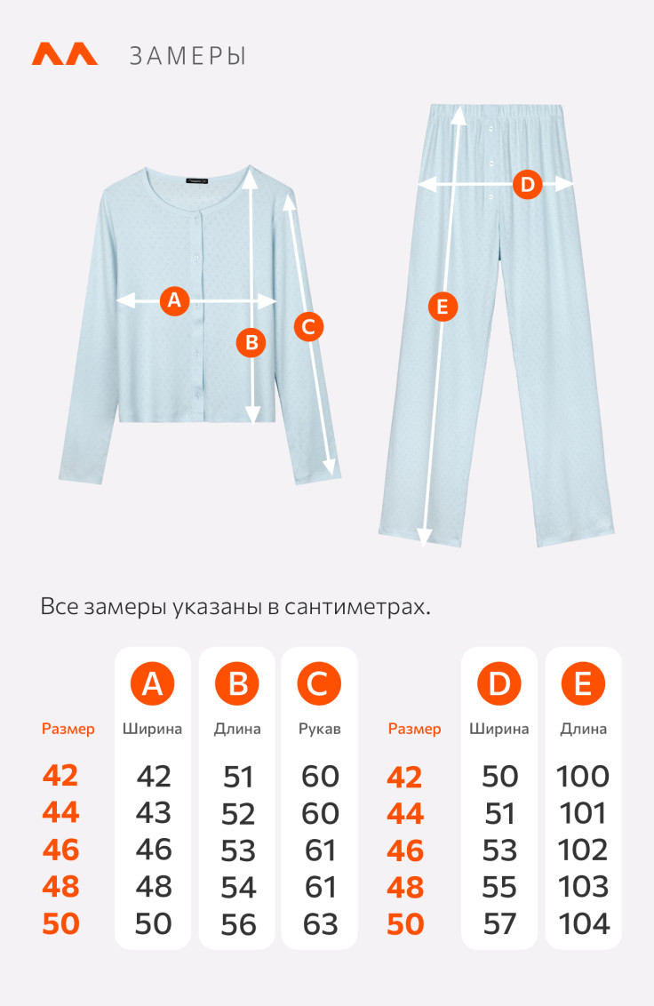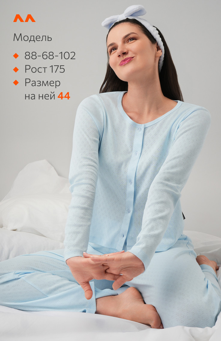 • Не забывайте про размер: пижама должна быть удобной и не стеснять движений.Обратите внимание на таблицу размеров с актуальными замерами, которую найдёте в каждой карточке товара.
