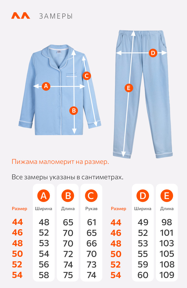 - Не забывайте про размер: пижама должна быть удобной и не стеснять движений.Обратите внимание на таблицу размеров с актуальными замерами, которую найдёте в каждой карточке товара.