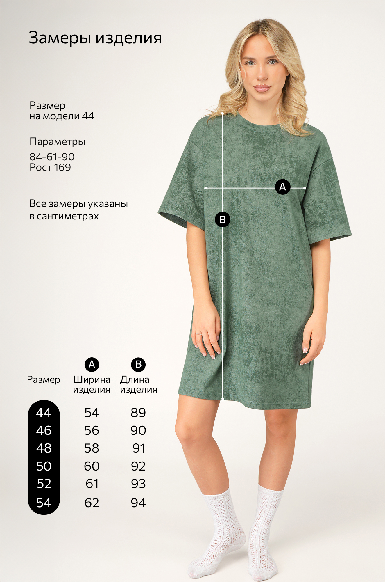 Модель Анфиса, рост 170, параметры: 88-67-97. На ней размер 44.