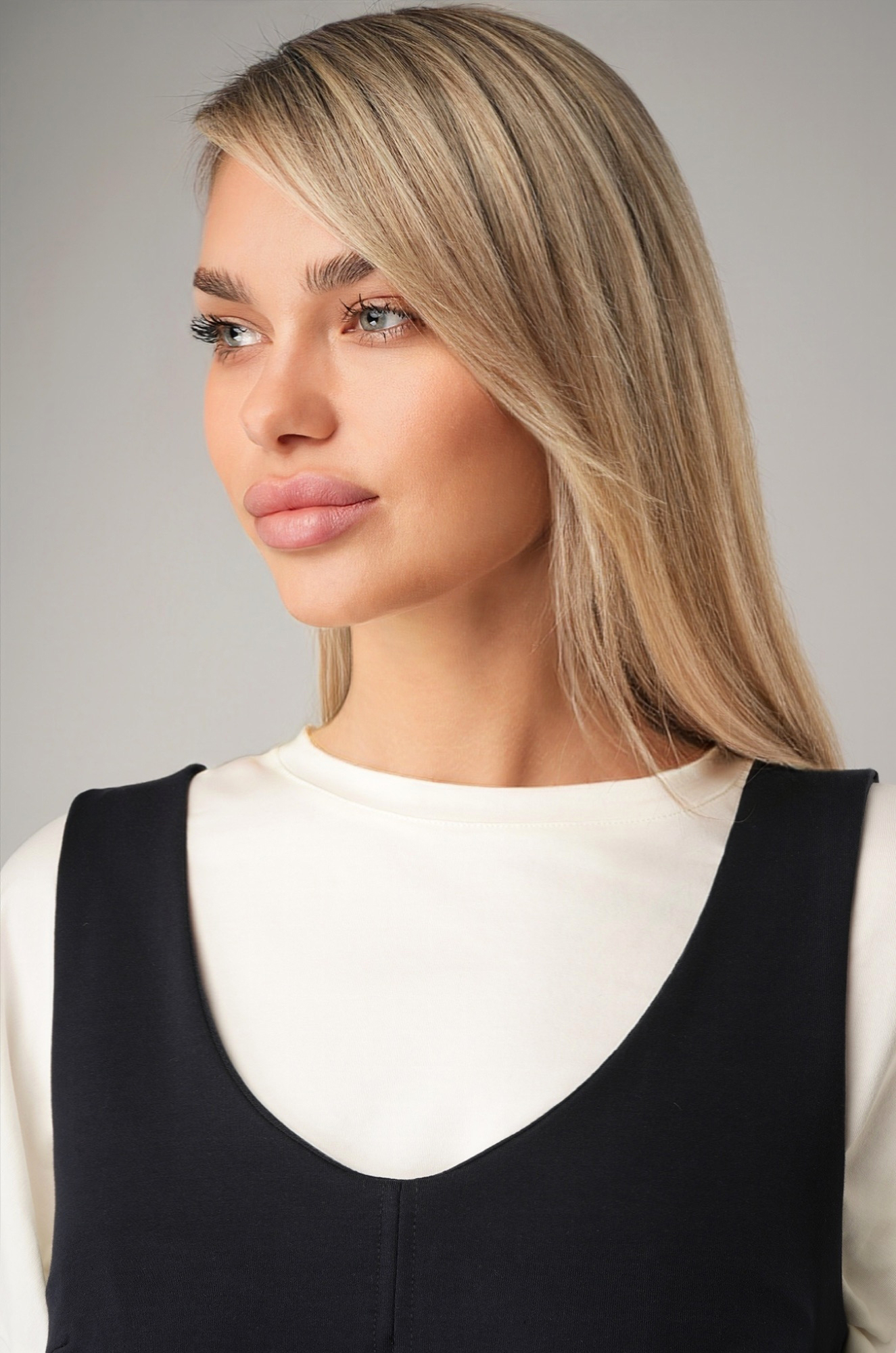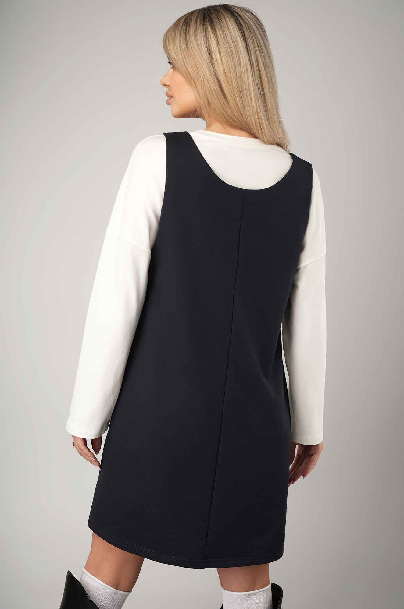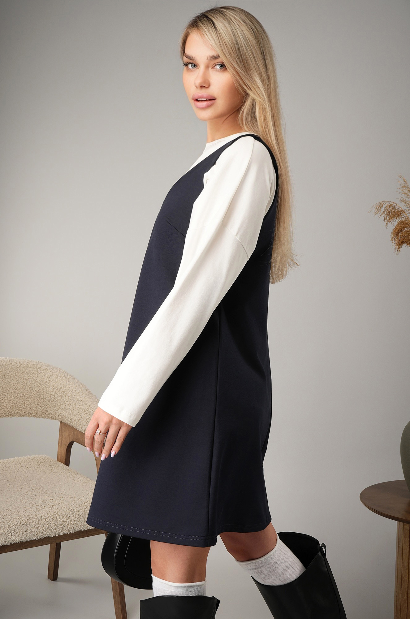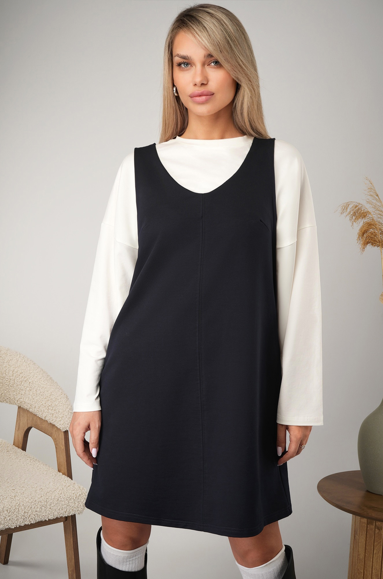 Свободный силуэт оверсайз, глубокий круглый вырез и отсутствие рукавов делают трикотажный сарафан воплощением современного минимализма. Хлопковое синее платье создано для женщин, которые ценят гармонию комфорта и стиля — на работе, на прогулке или в любом повседневном моменте.