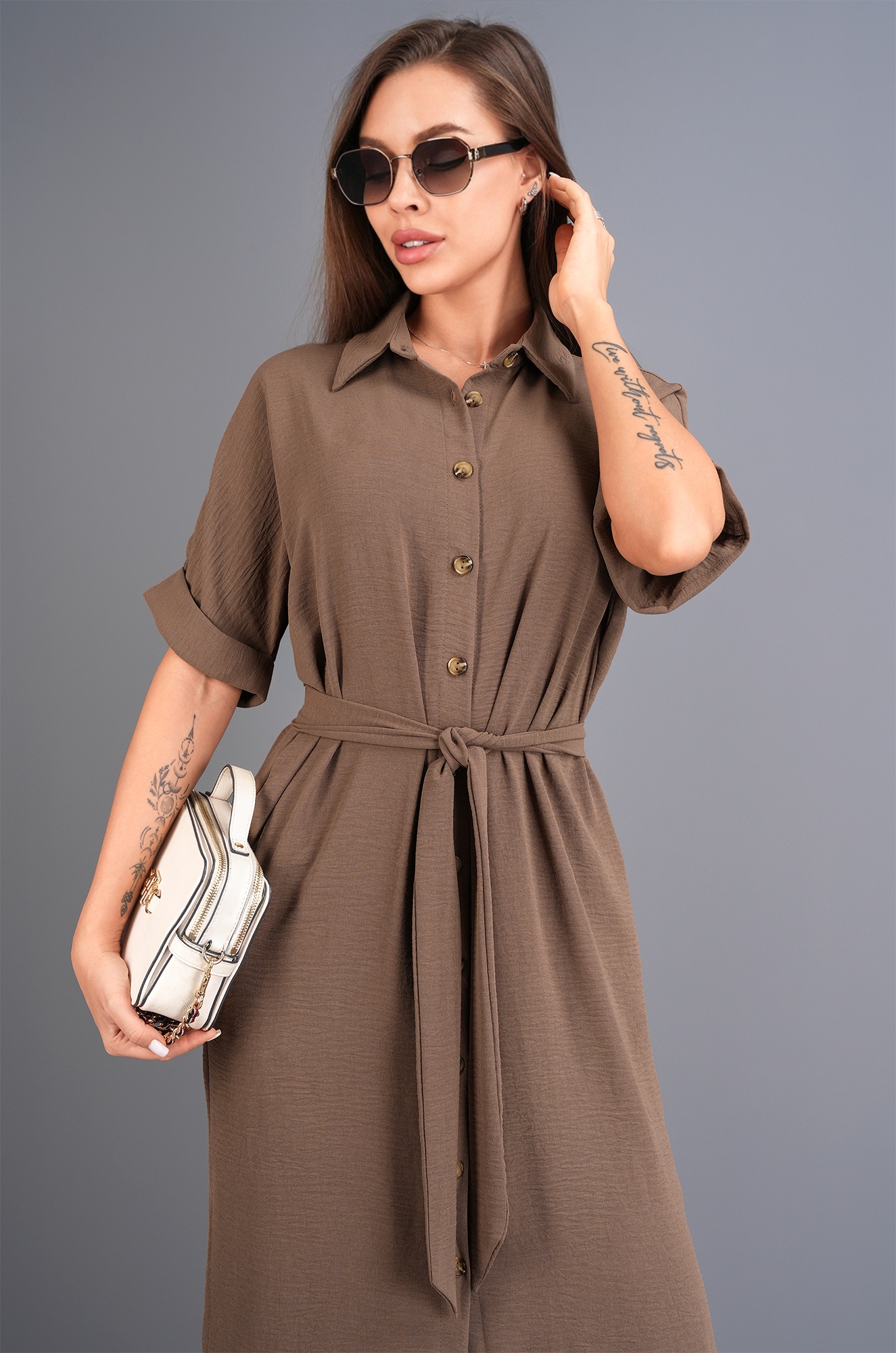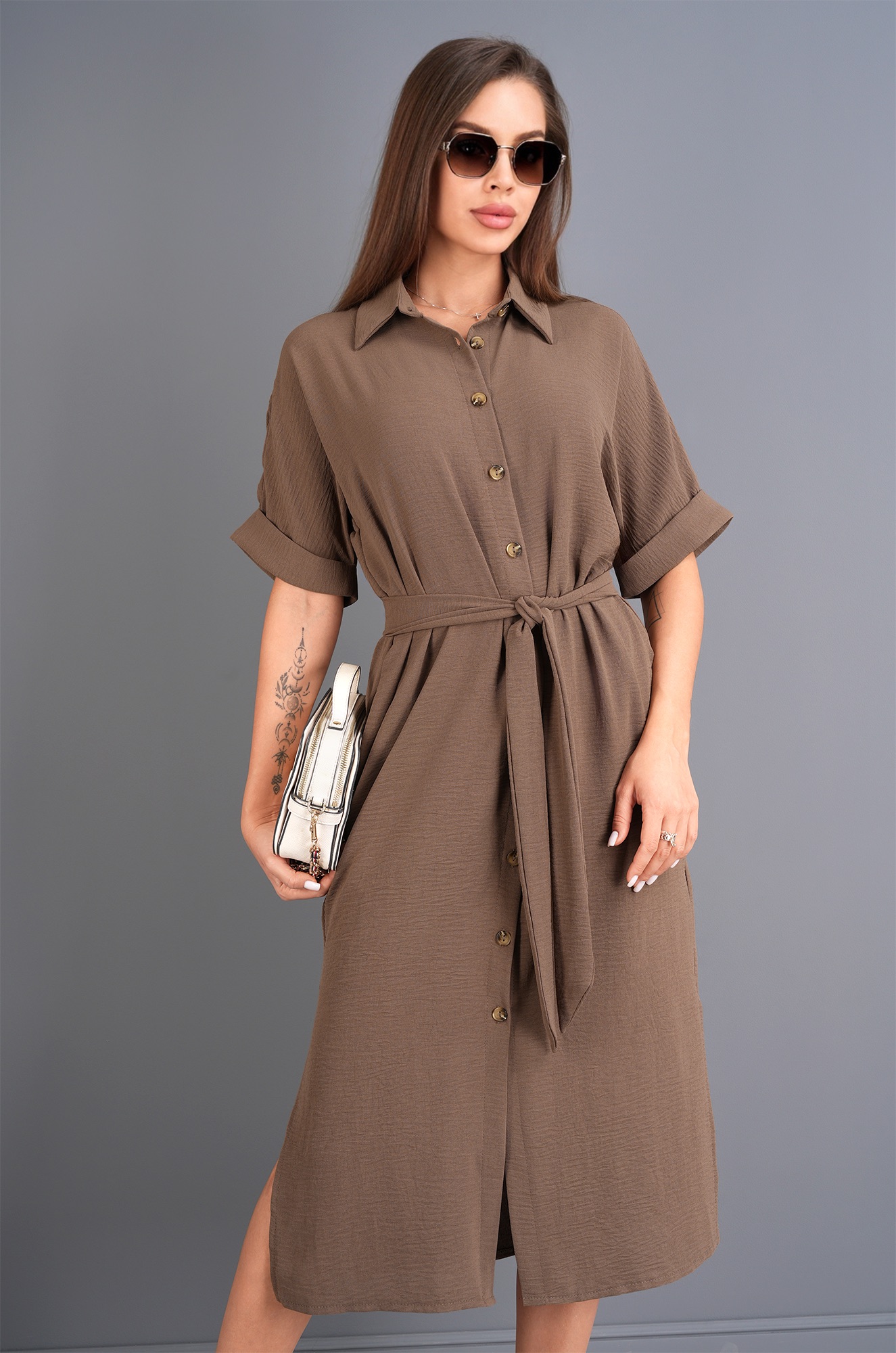 Женское платье-рубашка — легкое и красивое решение для жаркого лета. Модель шоколадного цвета выполнена из фактурной ткани жатка, которая не мнётся и красиво драпируется, создавая мягкий, свободный силуэт. Повседневное платье для женщин сочетает комфорт и элегантность, позволяя чувствовать себя уверенно в любой ситуации.