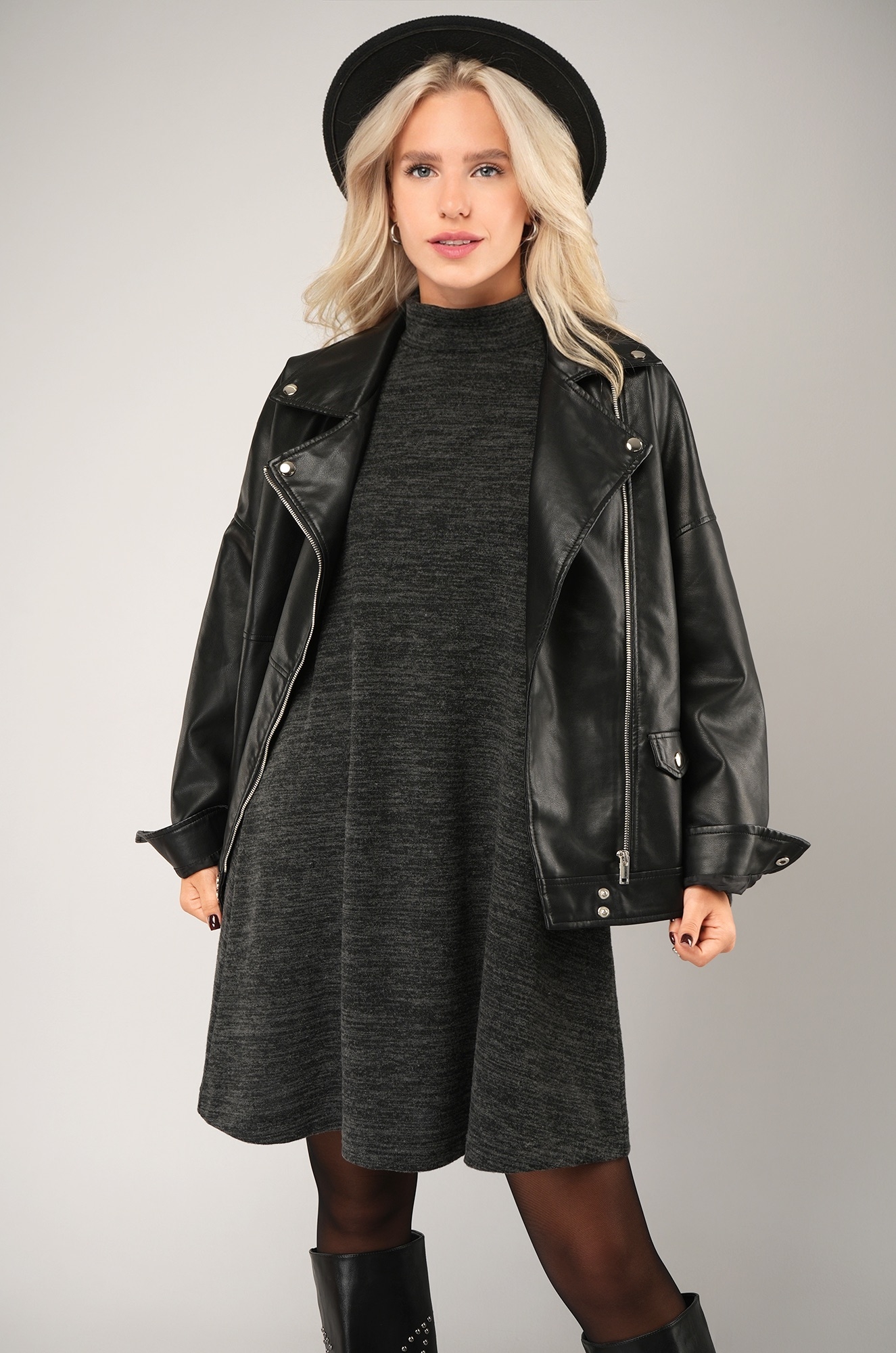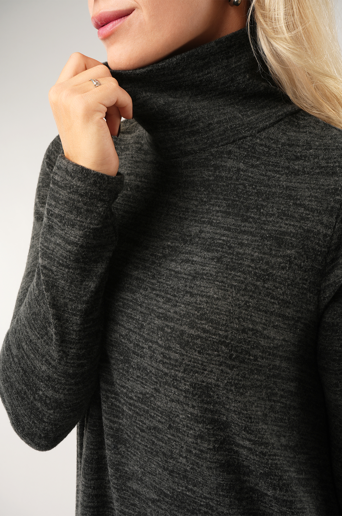 Темно-серое платье-водолазка станет универсальной основой для стильных образов осенью и весной.