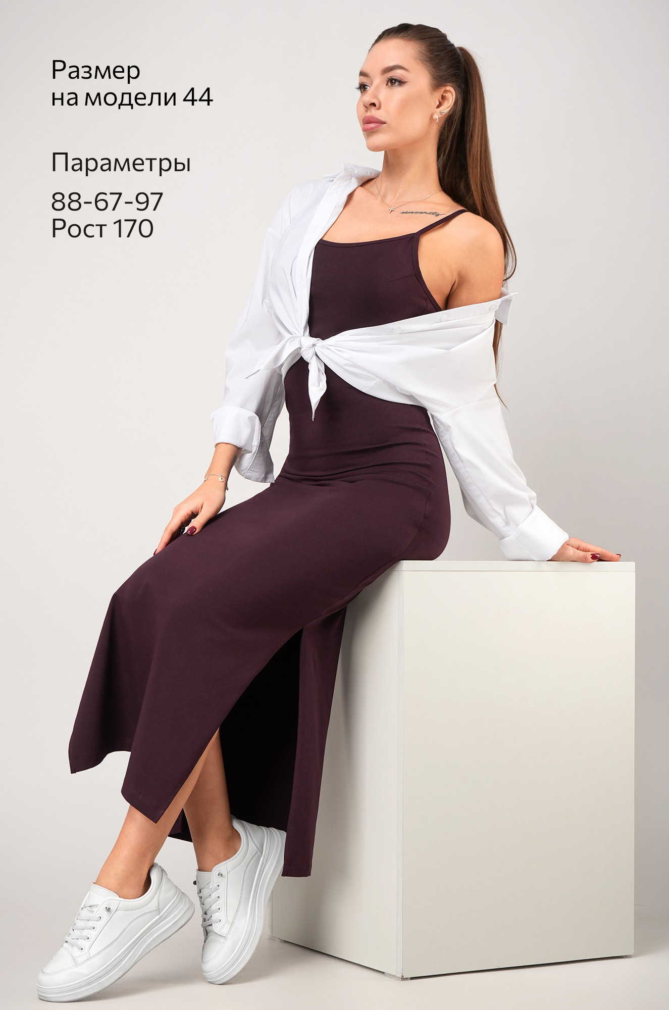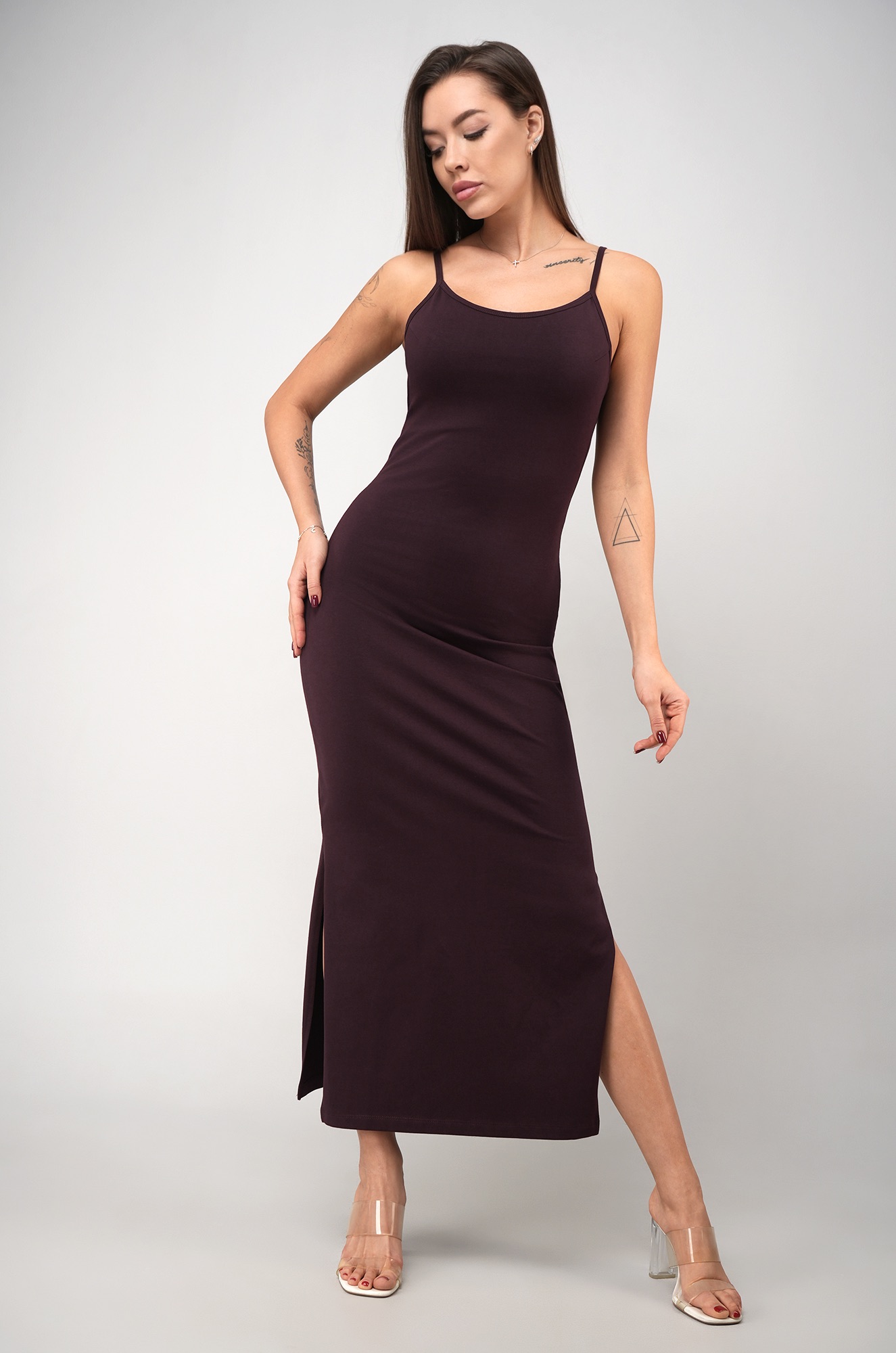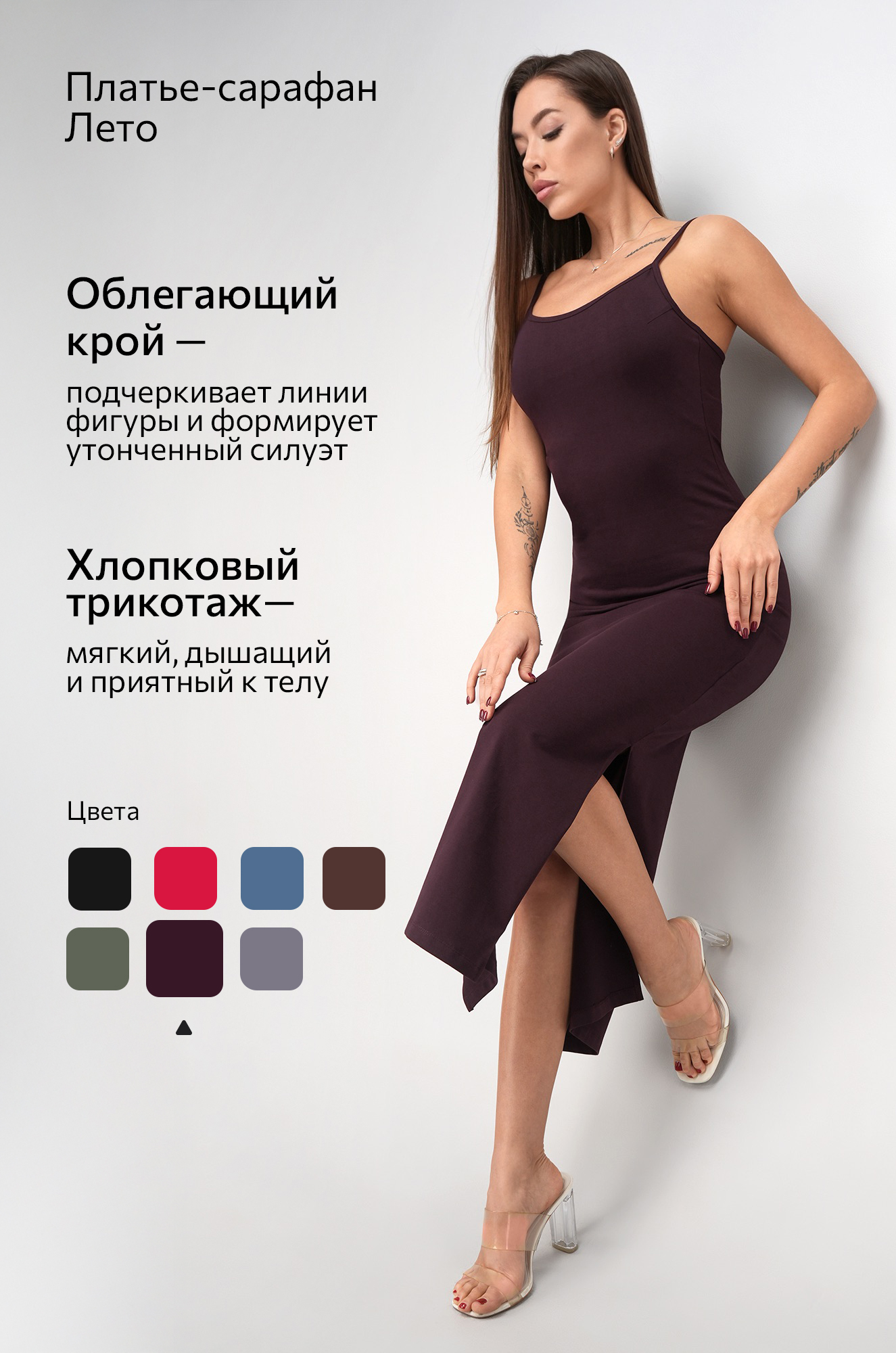 Соблазнительное и женственное облегающее платье — настоящая находка для жаркого лета! Эффектный утягивающий силуэт женского платья в стиле скимс подчеркивает изгибы, а стильные разрезы и длина миди визуально вытягивают фигуру. Трикотажное платье-майка баклажанового цвета выполнено из дышащей ткани кулирная гладь.