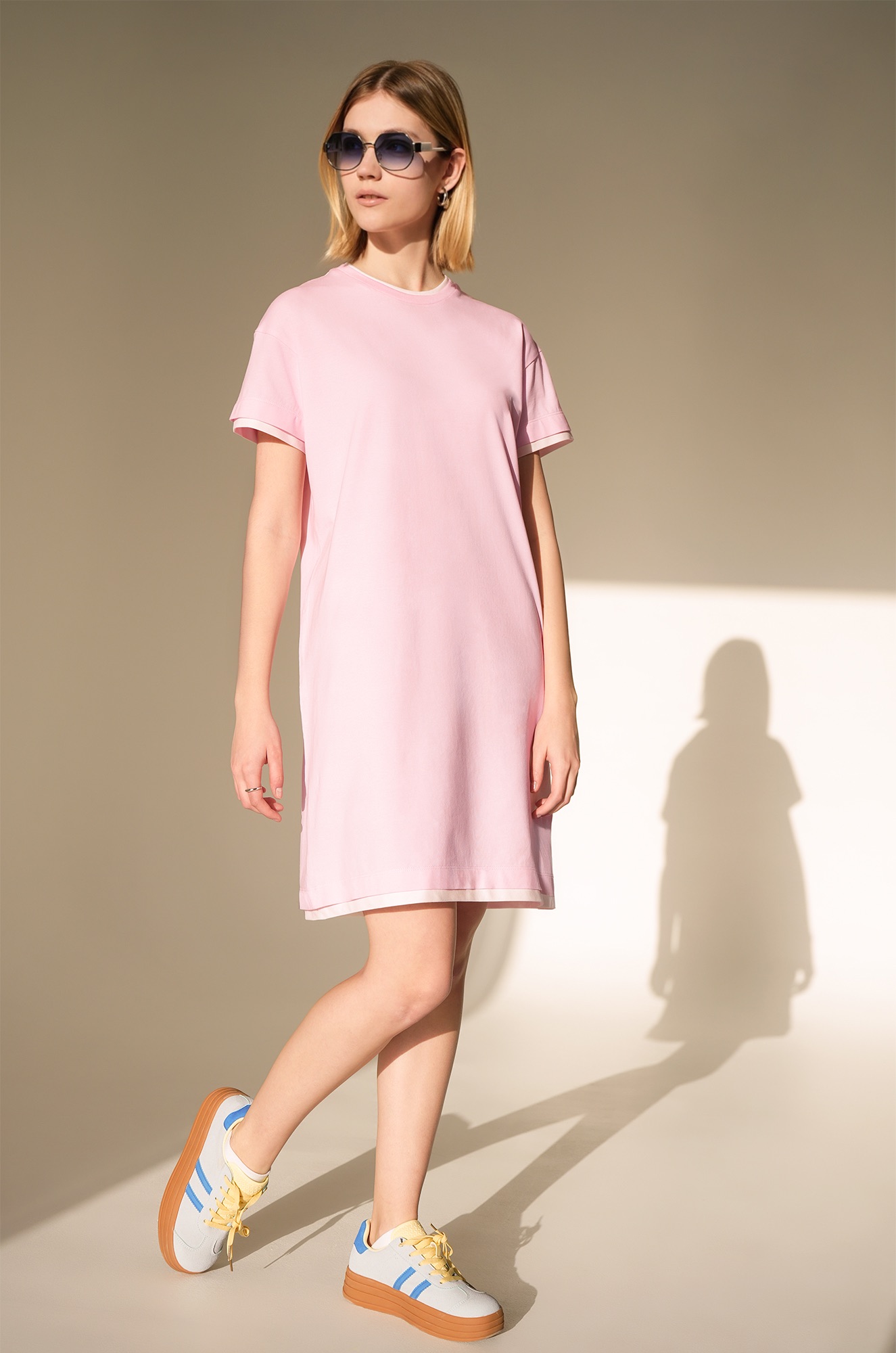 Женское платье-футболка — прекрасное решение для жаркого лета. Свободное платье с коротким рукавом выполнено из хлопка с добавлением эластана (95% хлопок, 5% эластан, плотность 180 г/м²), что делает его приятным к телу, эластичным и комфортным для повседневного ношения. Спортивное трикотажное платье прямого кроя создаёт красивый свободный силуэт.